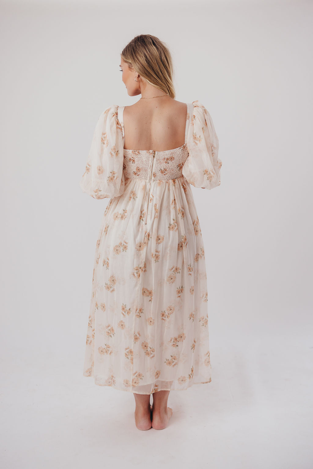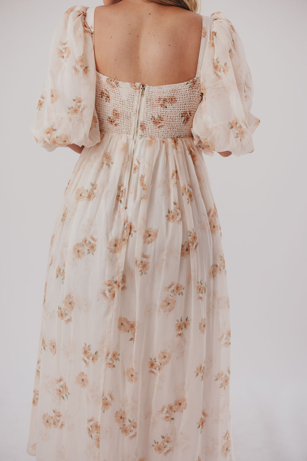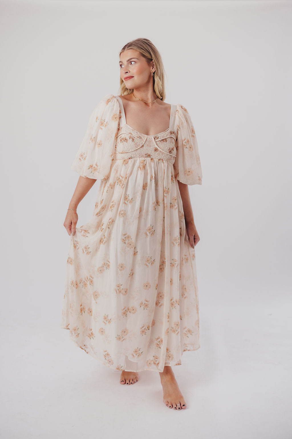 GARMENT DETAILS: Lightweight maxi in a pastel floral print. Features an empire waist silhouette and structured bustier-style bodice, with smocking in the back. Finished with statement puffed sleeves, voluminous skirt, and back zipper. Lined.