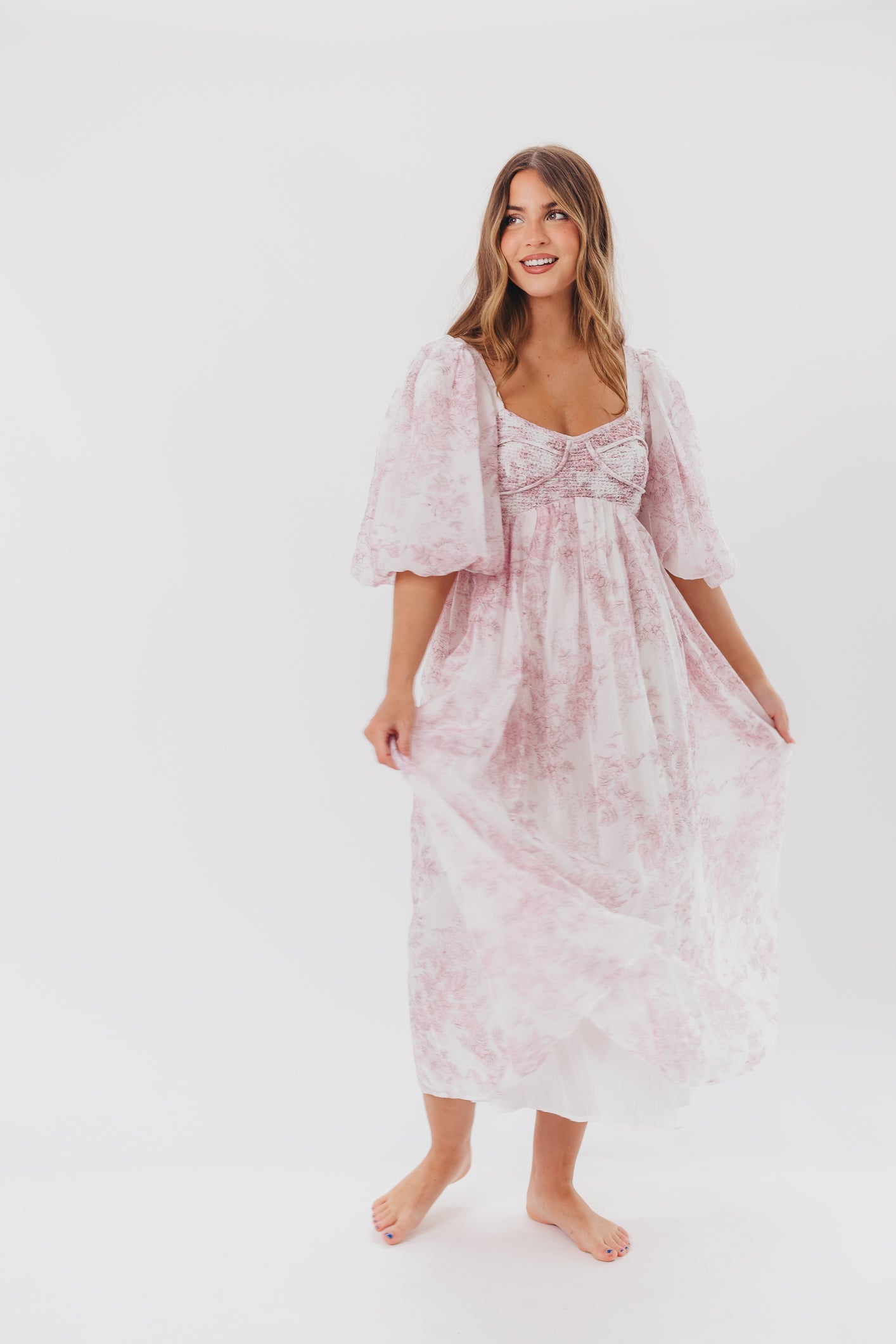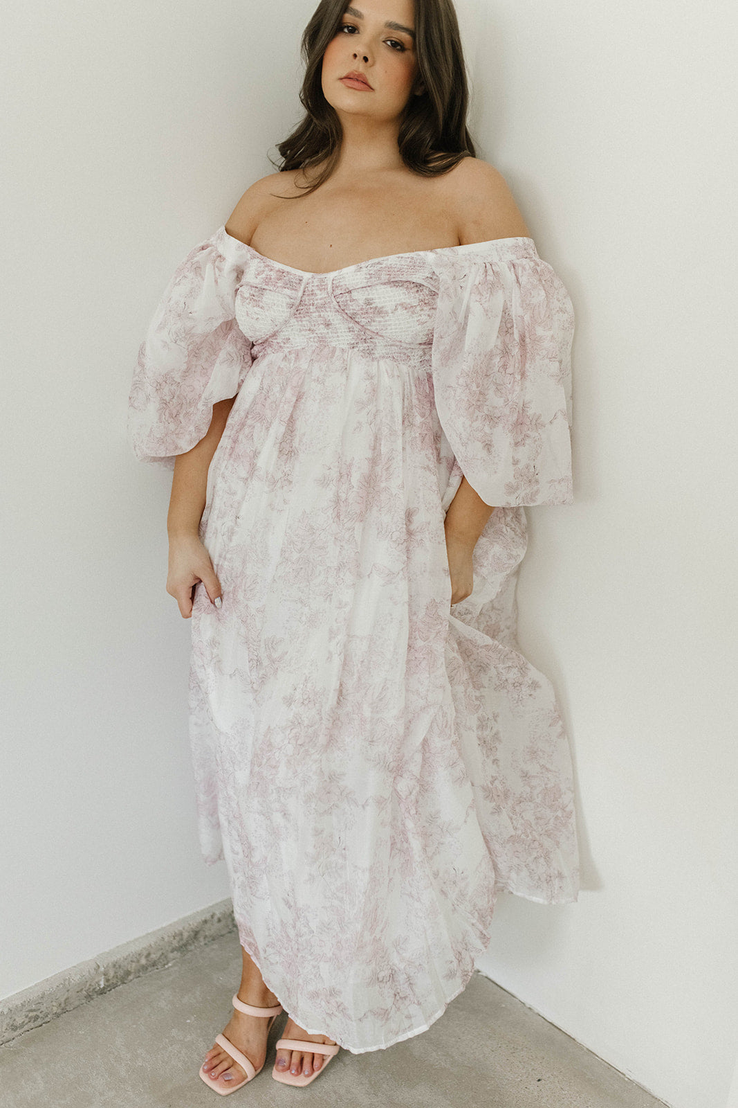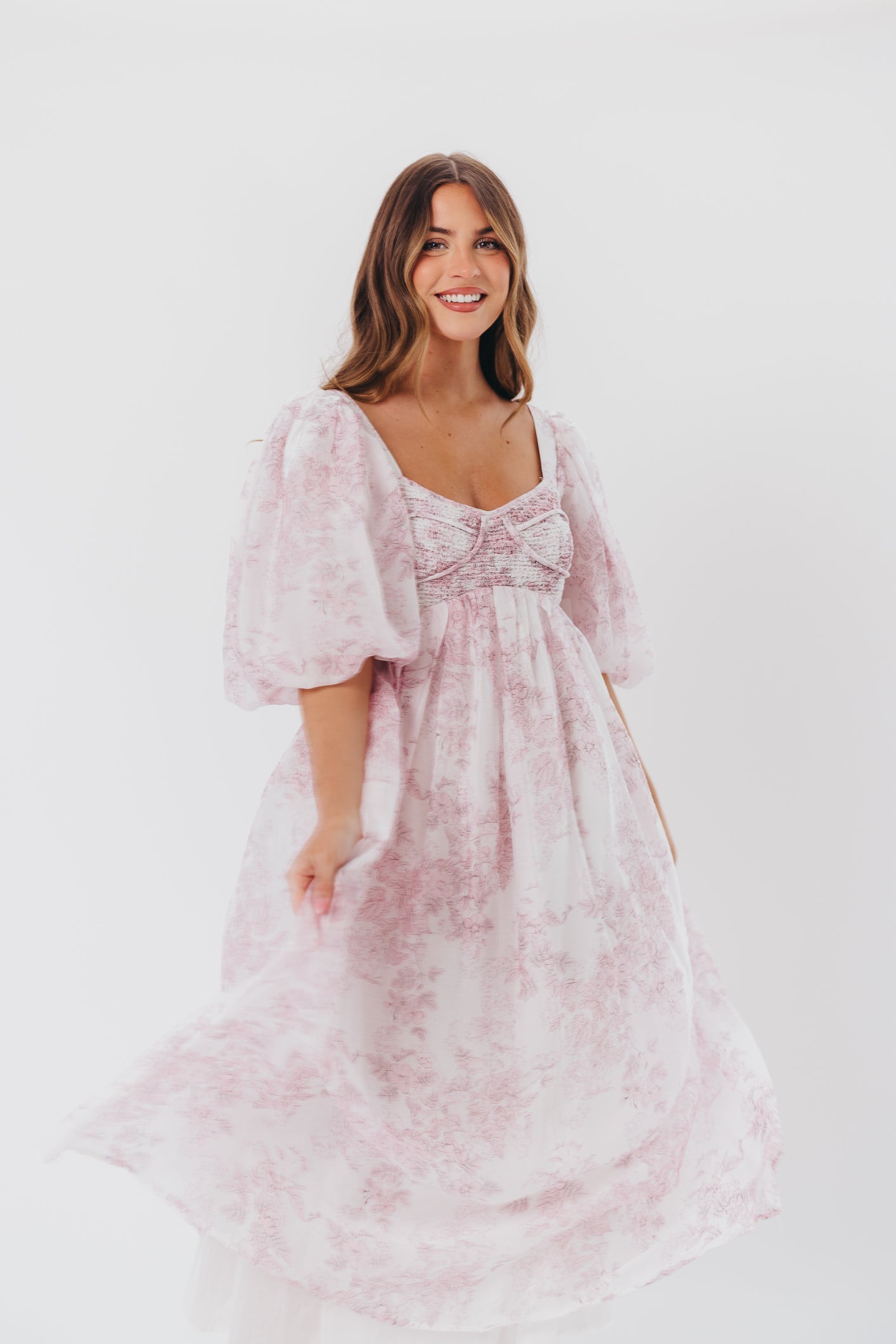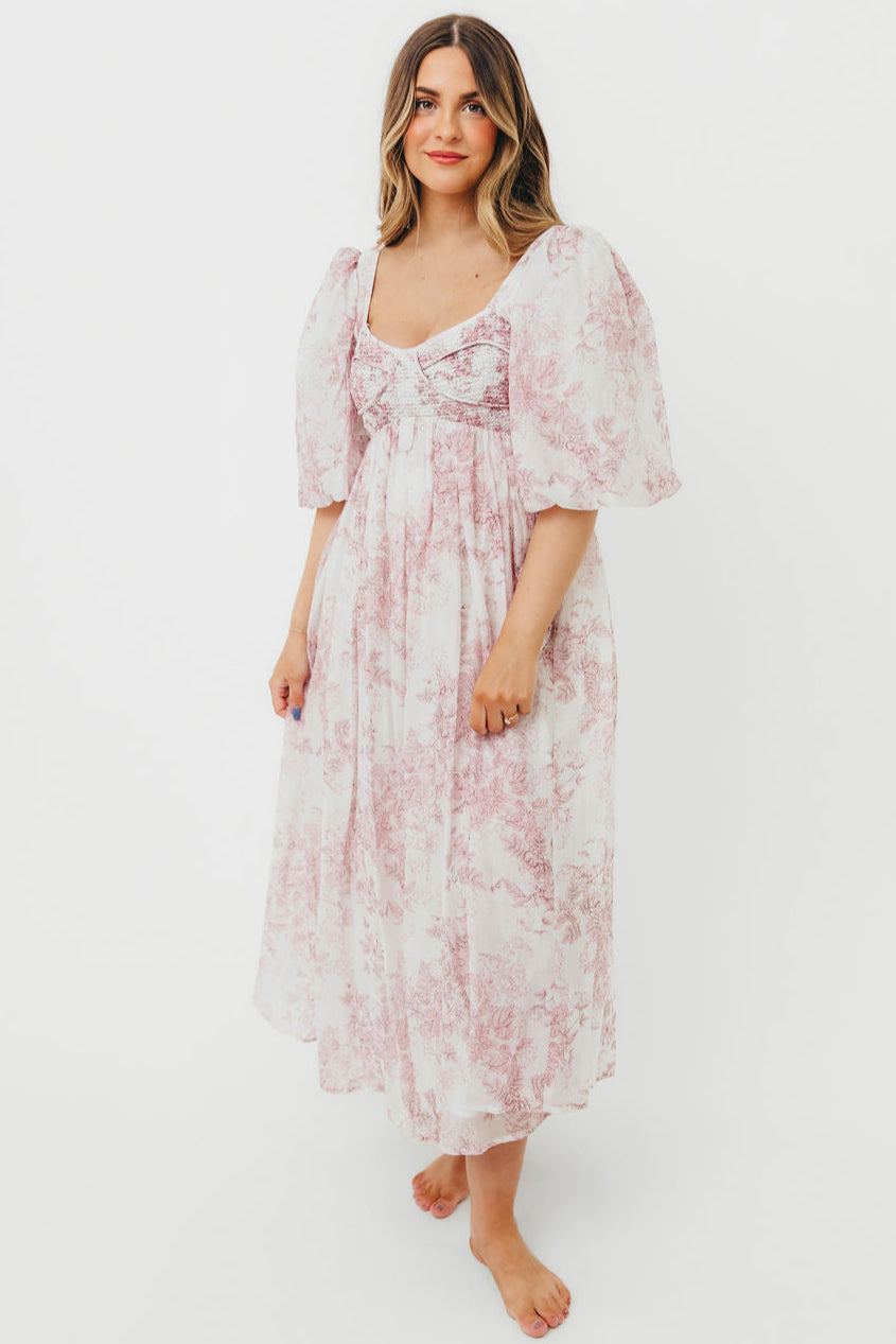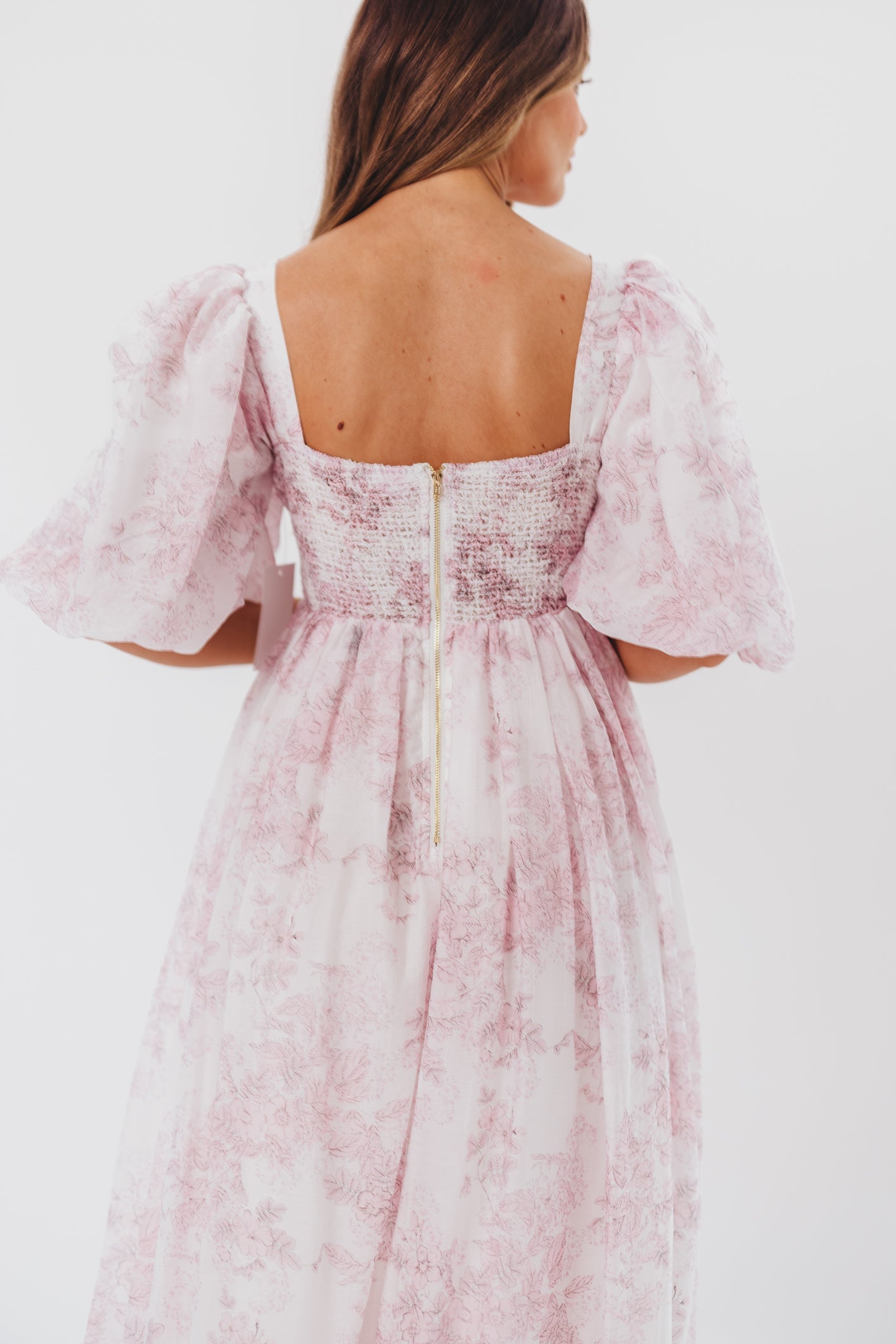 GARMENT DETAILS: Lightweight maxi in a pastelfloral print. Features an empire waist silhouette and structured bustier-style bodice, with smocking in the back. Finished with statement puffed sleeves, voluminous skirt, and back zipper. Lined.