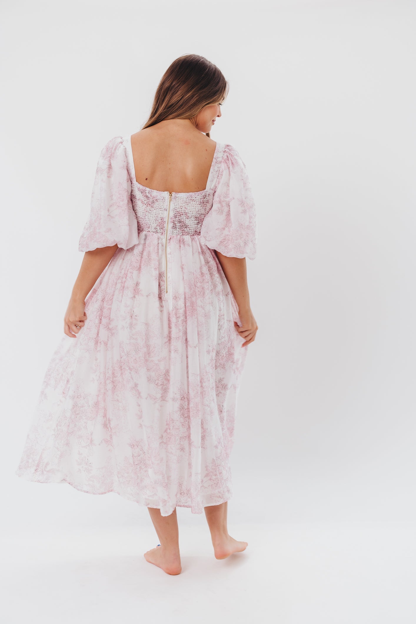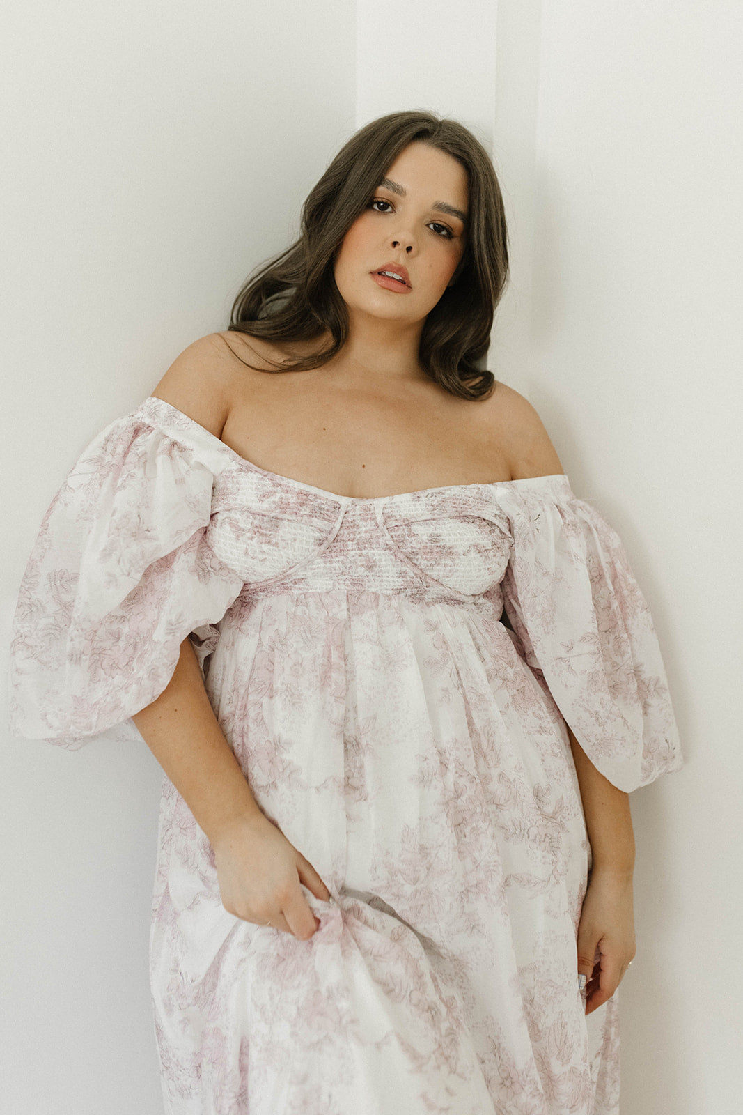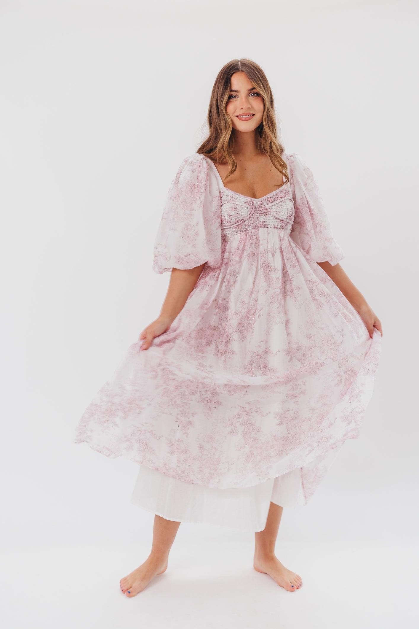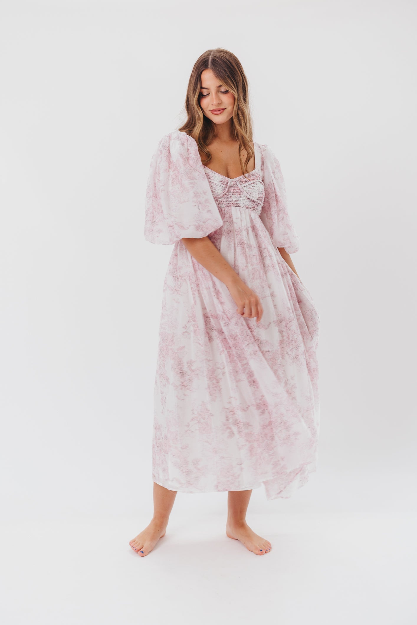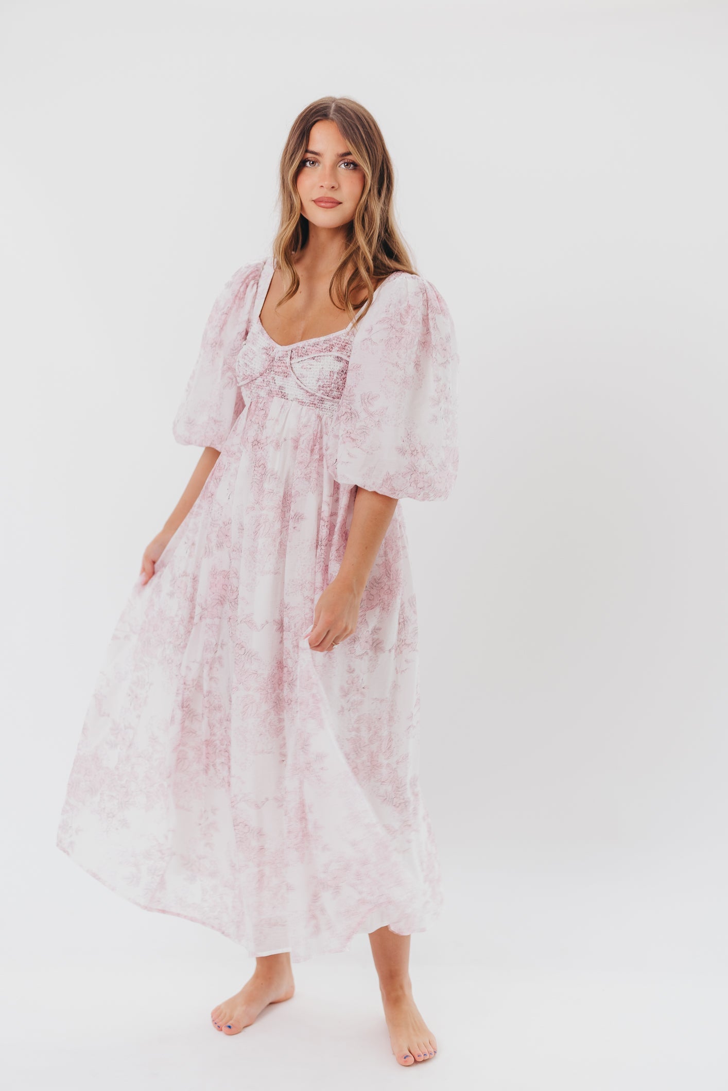 GARMENT DETAILS: Lightweight maxi in a pastelfloral print. Features an empire waist silhouette and structured bustier-style bodice, with smocking in the back. Finished with statement puffed sleeves, voluminous skirt, and back zipper. Lined.