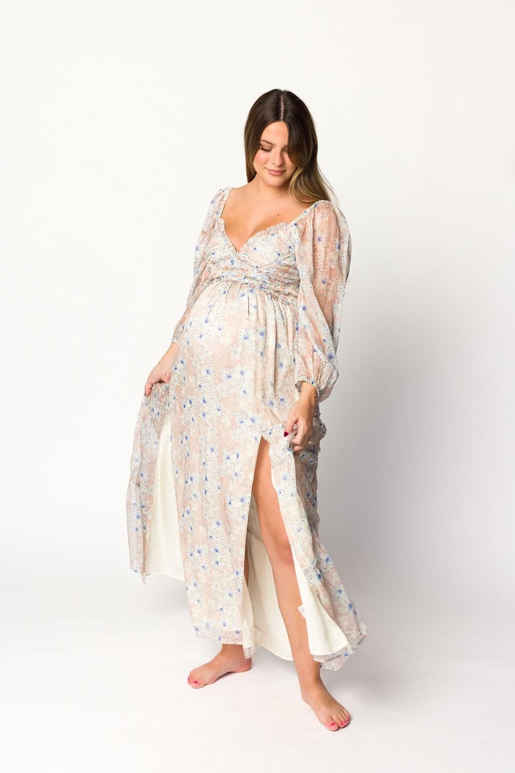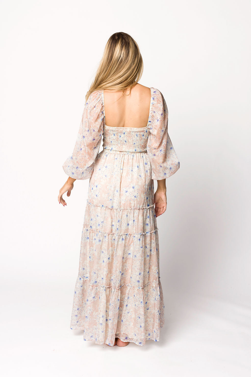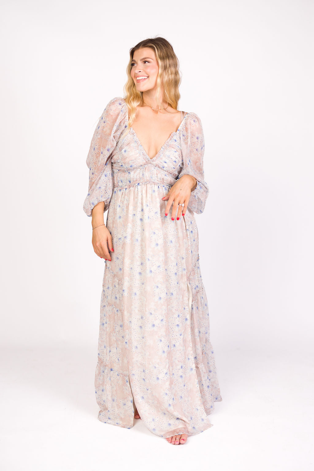 Daphne Long Sleeve Maxi Dress in Beige/Blue Floral...