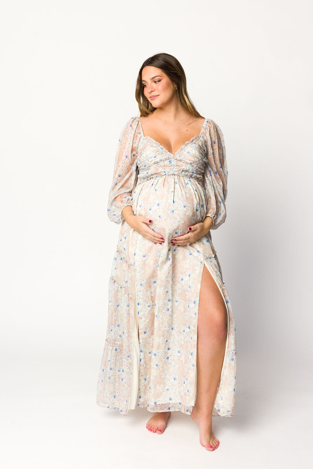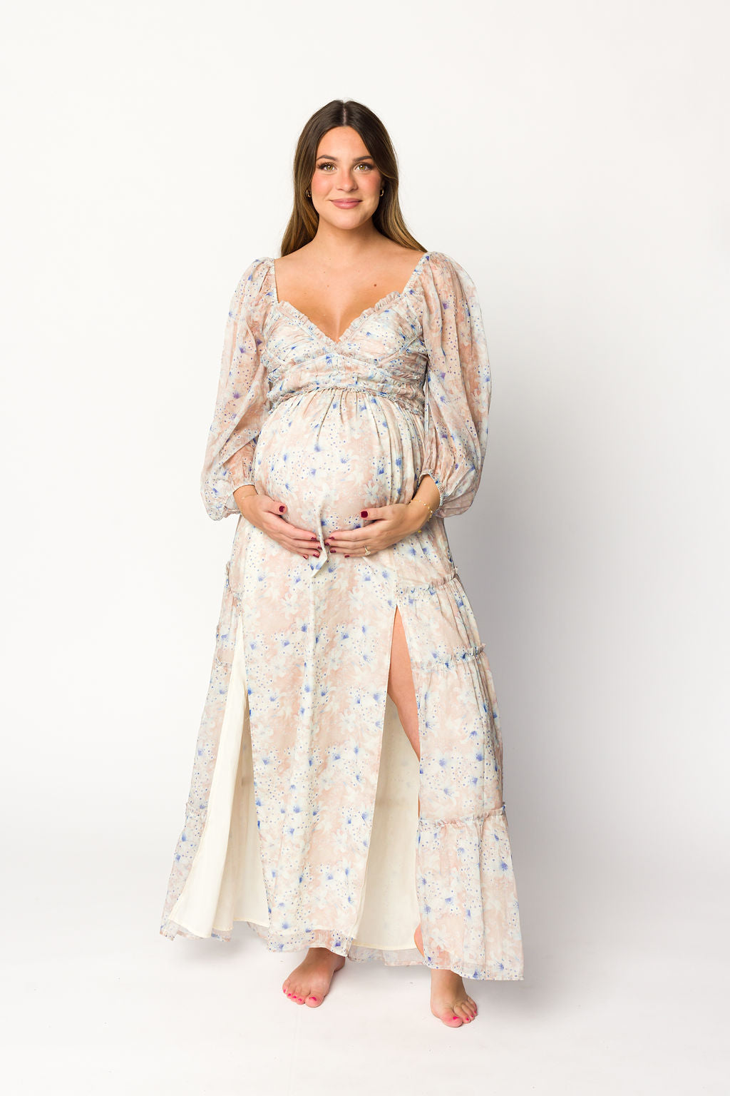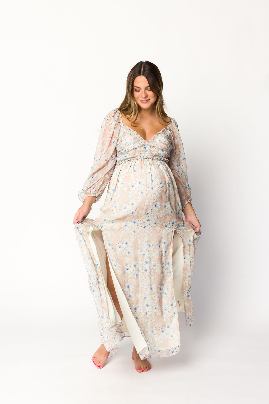 Daphne Long Sleeve Maxi Dress in Beige/Blue Floral...