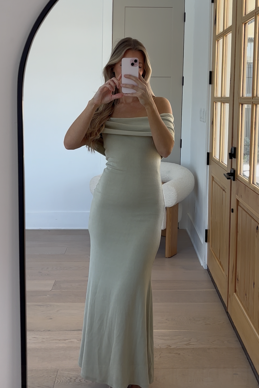 GARMENT DETAILS: Sleek and fitted maxi dress in a luxuriously soft premium knit. Features a folded off-the-shoulder neckline with short sleeves and a fit-and-flare design that is fitted through the hips and thighs and flares at the knee. Fully lined for maximum coverage and comfort.