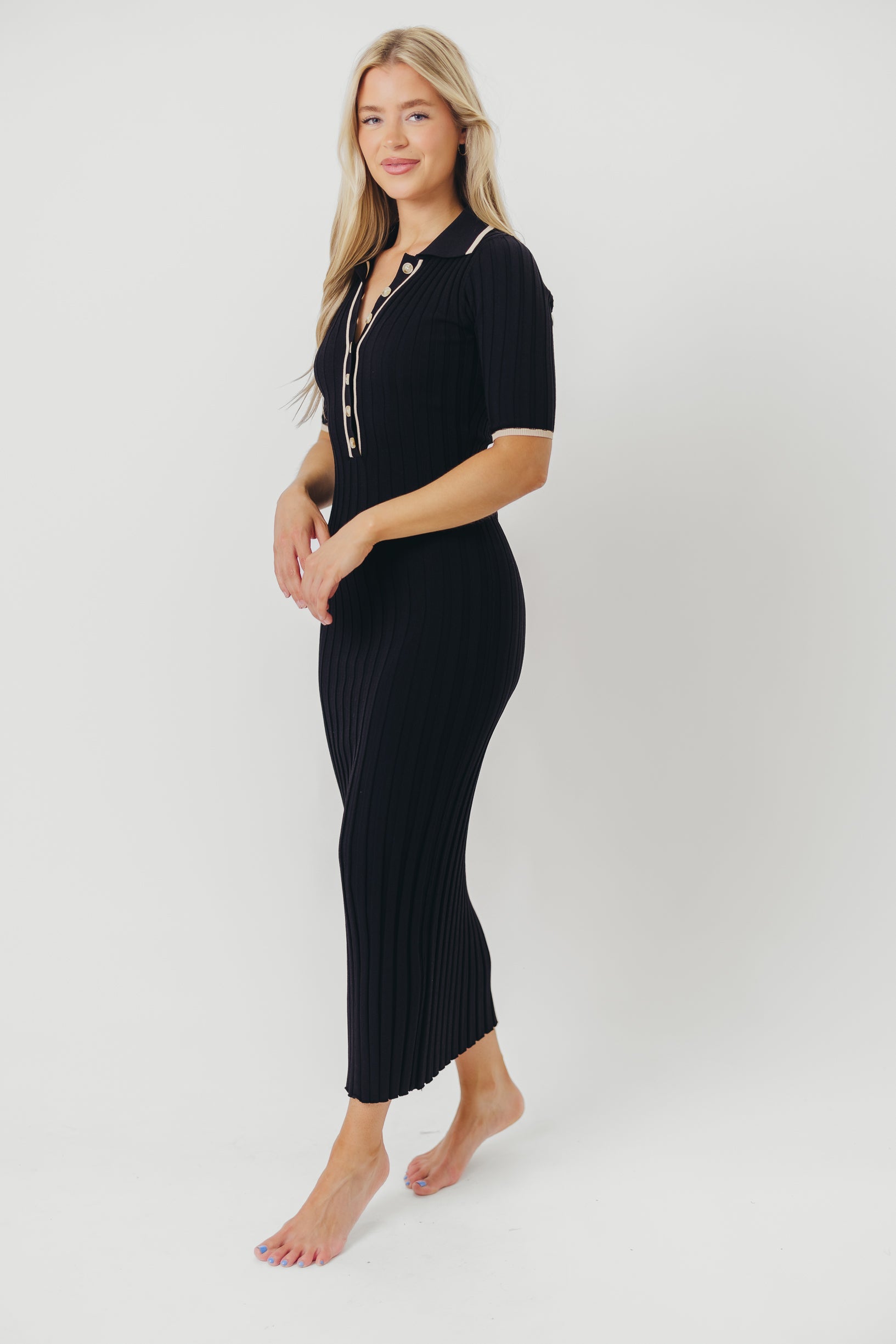 Addie Ribbed Button-Down Maxi Dress in Black -...