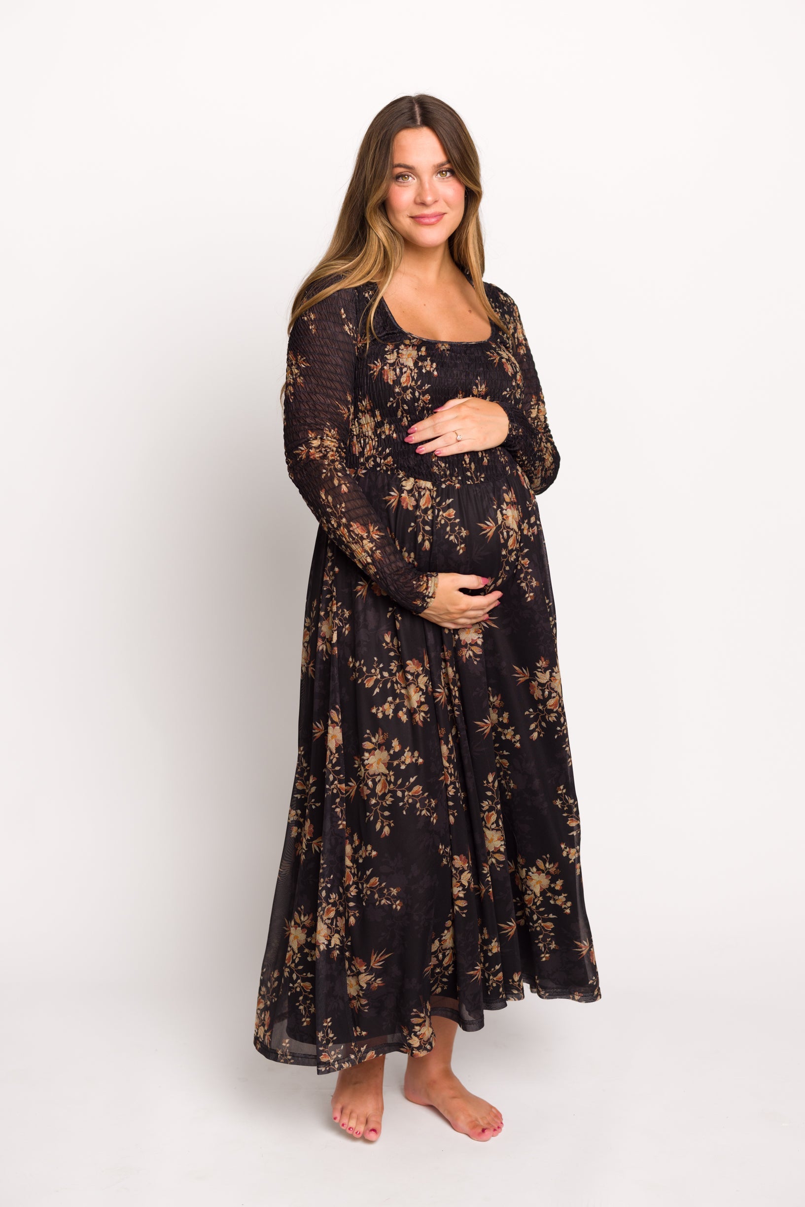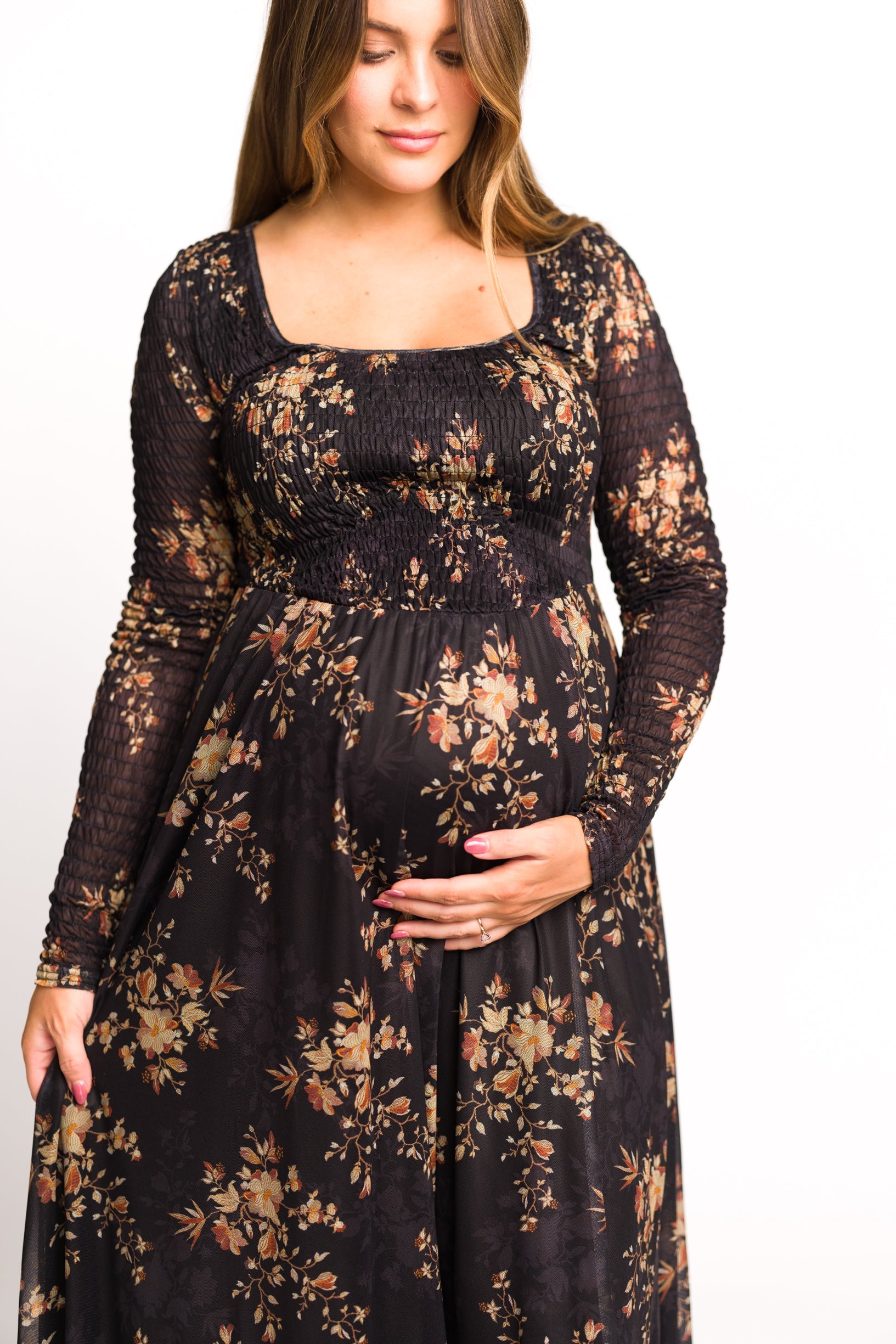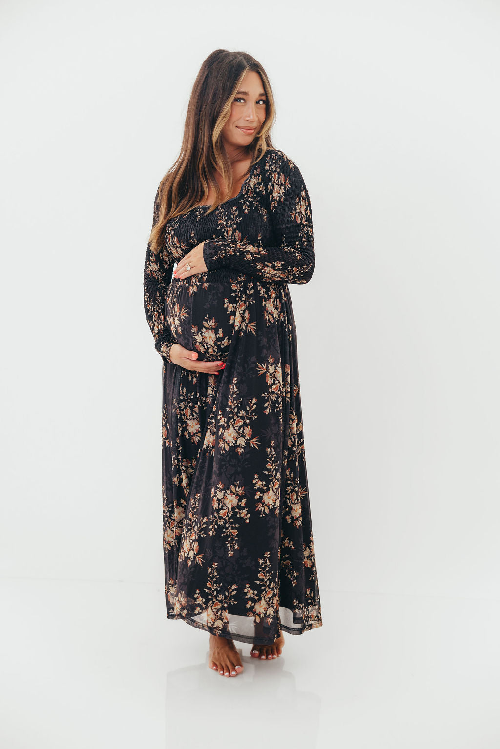 Honor Floral Smocked Woven Maxi Dress in Black - Bump Friendly