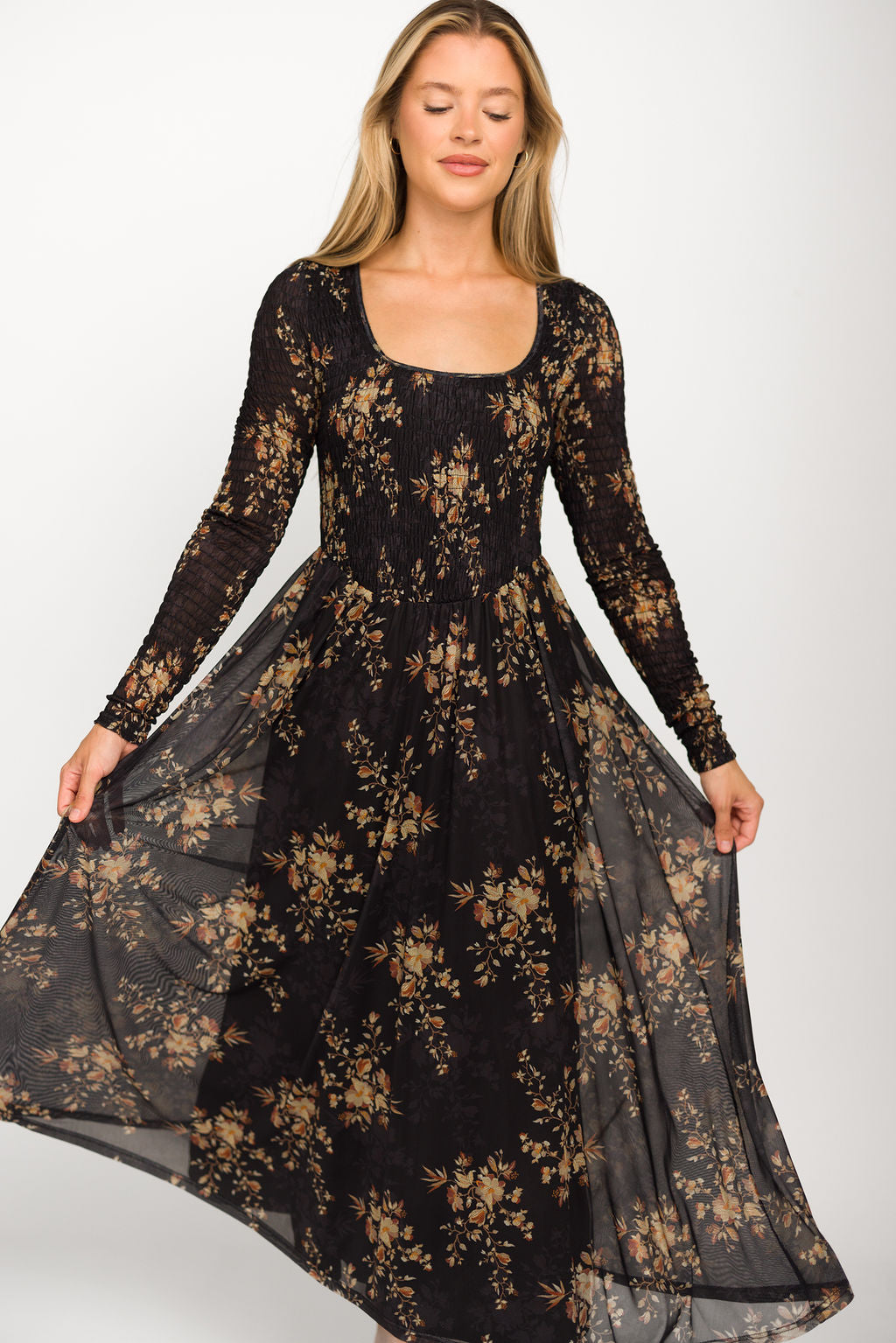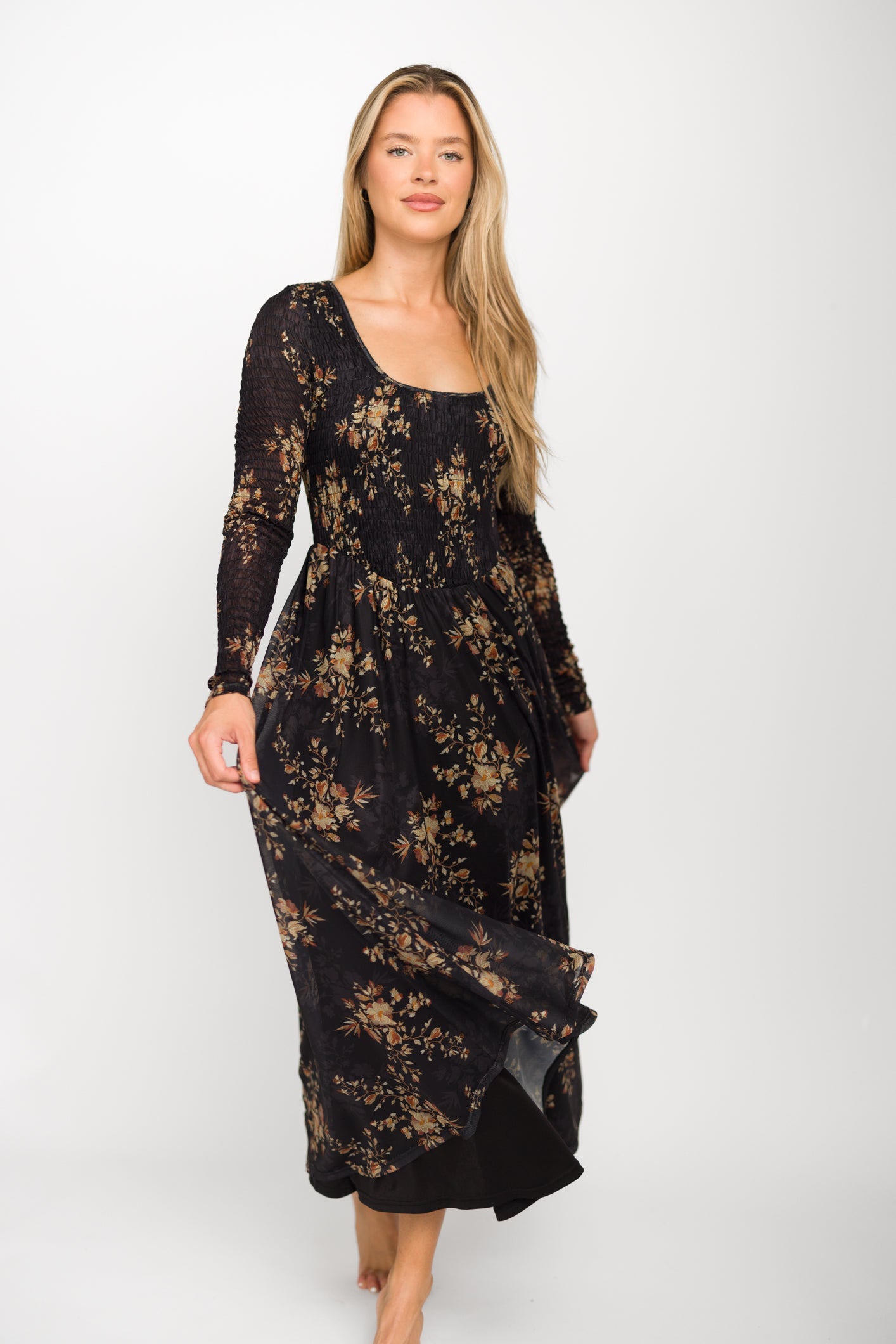 GARMENT DETAILS: Elegant dark-hued floral print maxi dress with square neckline, fully smocked bodice and sleeves, and long elegant skirt. Lined. The smocking goes down mid belly so please keep that in mind if you are past your second trimester.