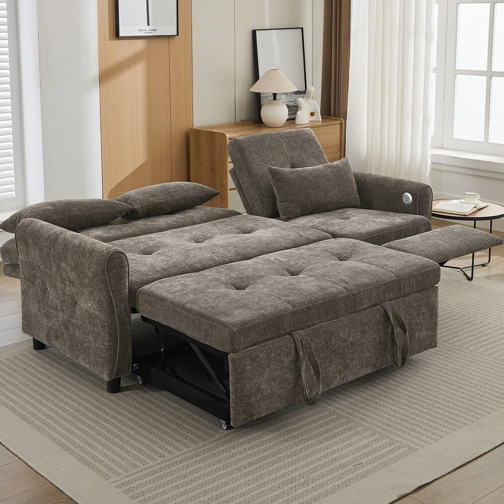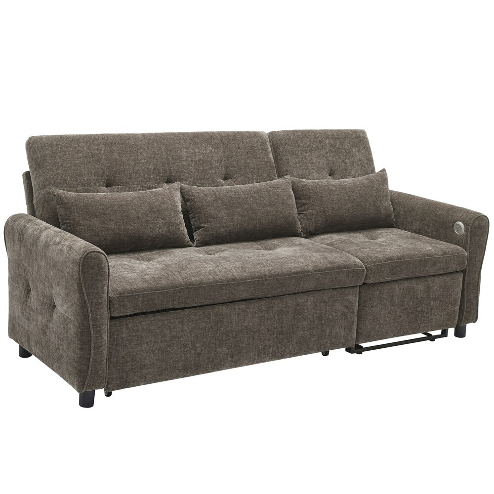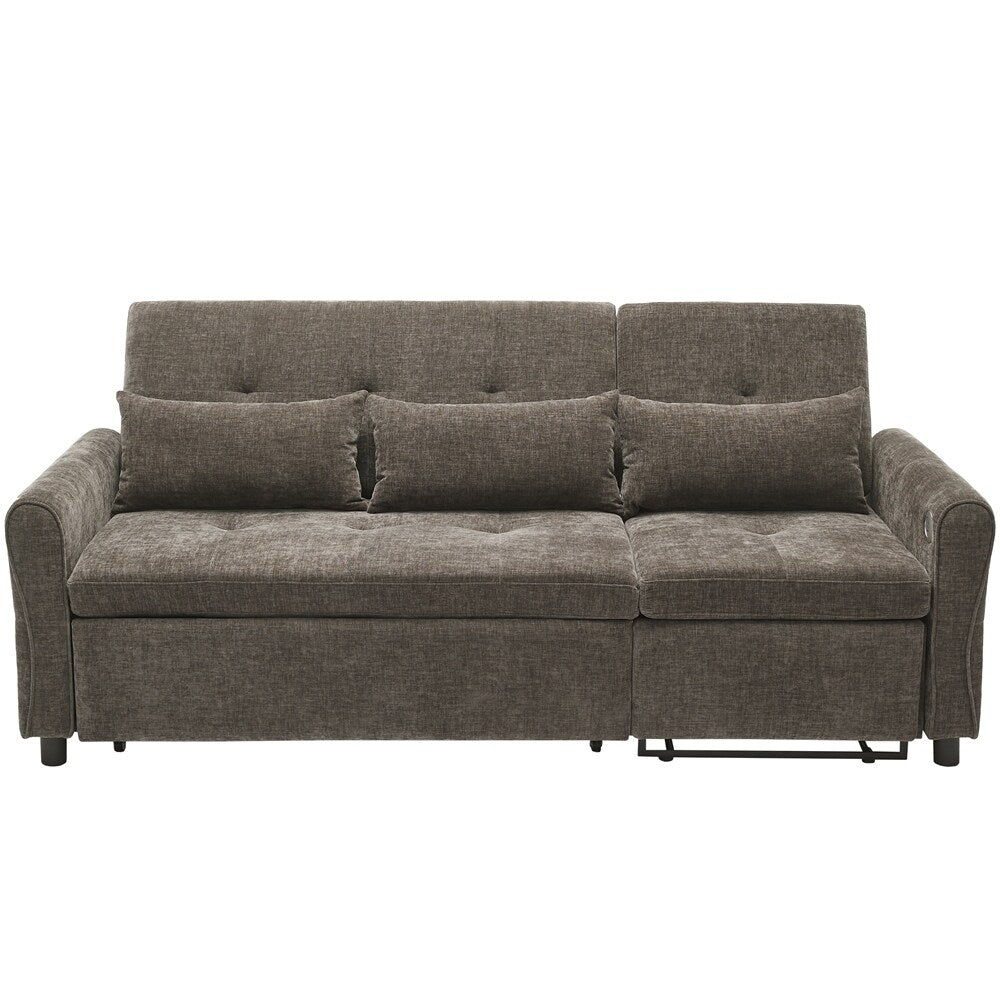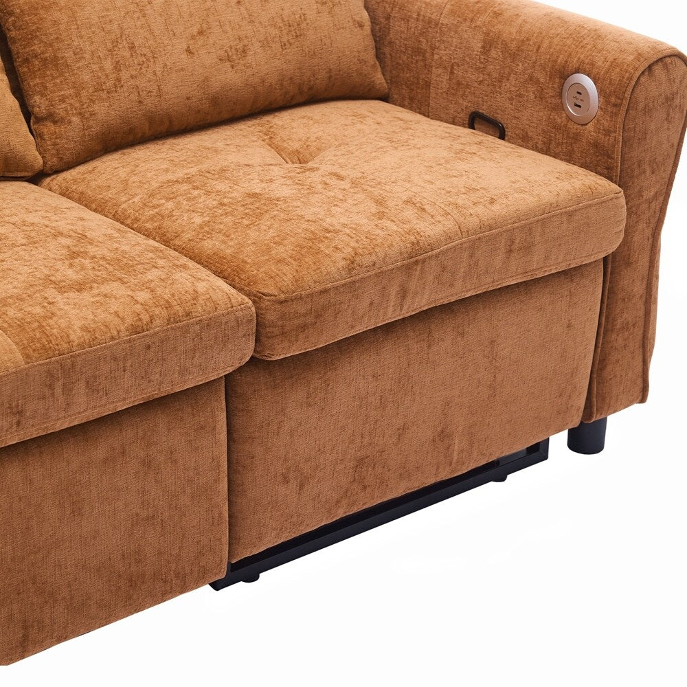 Innovative 2-in-1 Sofa - This sofa offers both a spacious pull-out sleeper and a functional recliner section in one smart design, making it ideal for homes that need both comfort and versatility. The pull-out bed provides a generous sleeping area for guests, while the recliner adds an extra layer of relaxation. This rare combination makes it a standout piece, perfect for modern, multifunctional spaces.Three - Level Adjustable Backrest - Both backrests are designed with a three-position reclining system (sofa bed:105 °,140 ° and 180 °, recliner:105 °,120 ° and 140 °), allowing users to adjust the angle individually for each seat. Whether sitting upright for conversation, lounging back for reading, or fully reclining for napping, the adjustable backrests meet a variety of comfort needs, making it perfect for families with different preferences.Reversible Recliner Section - The functional recliner chair section can be installed on either the left or right side of the sofa, offering maximum flexibility to fit different room layouts and personal habits. Whether your living room requires a left-arm or right-arm recliner configuration, this design adapts effortlessly without the need for special tools.Elegant Curved Armrests with Tufted Detailing - The sofa's armrests feature a smooth, rounded arc design that provides a classic and timeless look while enhancing arm support. The button-tufted accents on both the backrests and seat cushions create a sophisticated visual texture, giving the sofa a premium appearance that complements various home décor styles, from modern to traditional.Dual USB Charging Ports for Modern Convenience - Equipped with two built-in USB charging ports conveniently located on the armrest, this sofa lets you easily charge smartphones, tablets, or other electronic devices without leaving your seat. This feature is especially useful for busy households or tech-savvy users who want to stay connected while relaxing.Easy to Assemble - This sofa is easy to assemble, all necessary accessories and detailed instructions are included. It comes with 3 boxes. Overall dimension: 82'W*33.5'D*36'H.