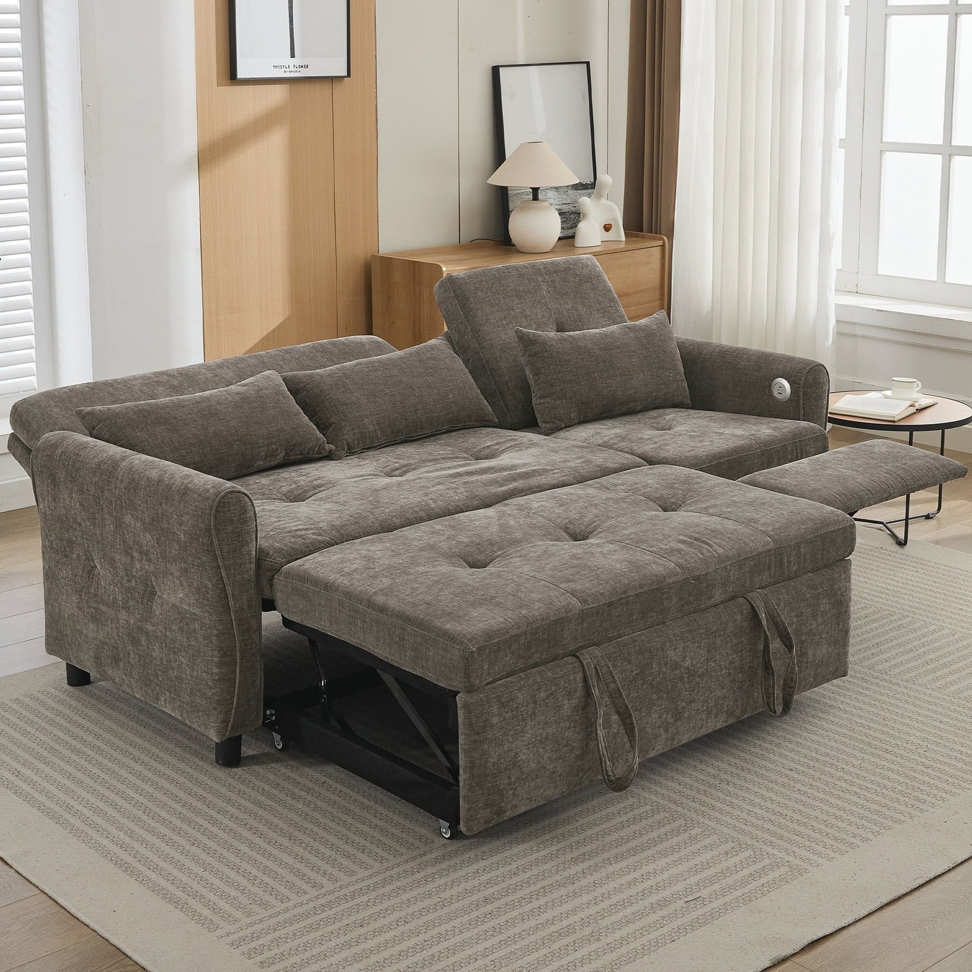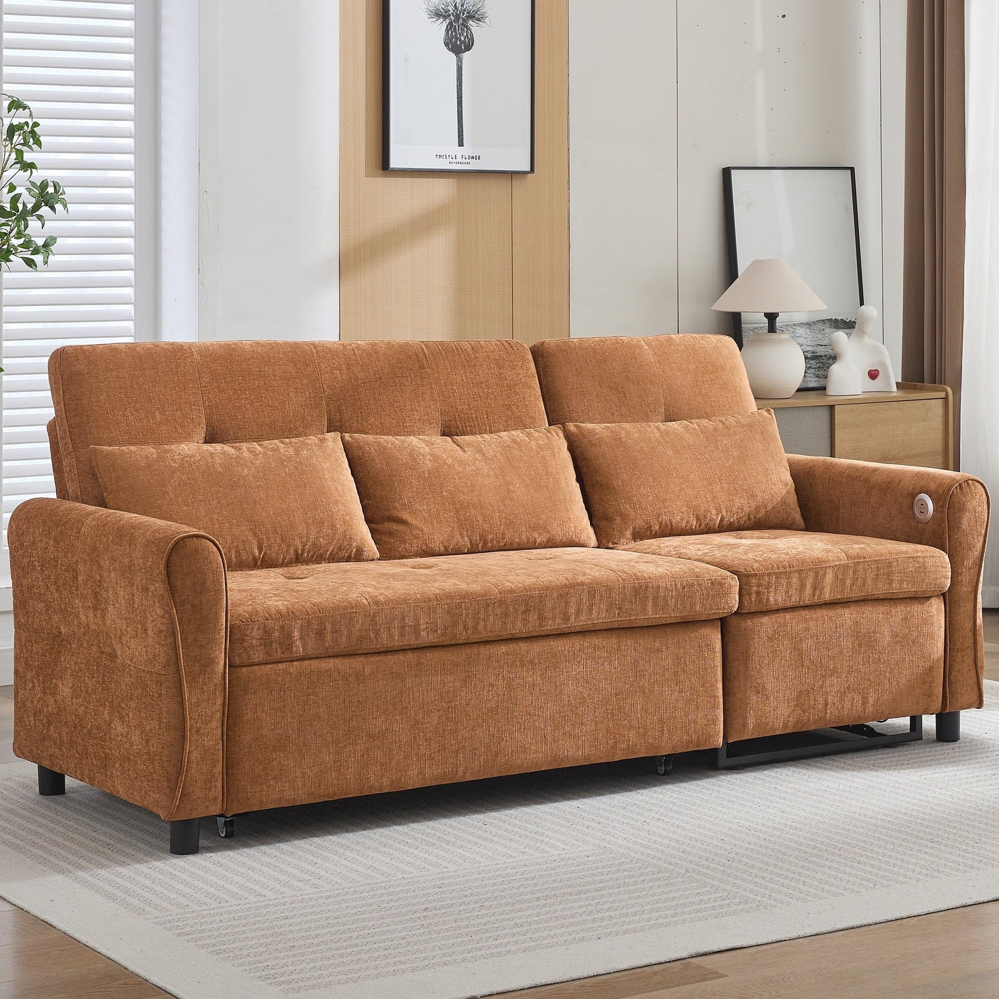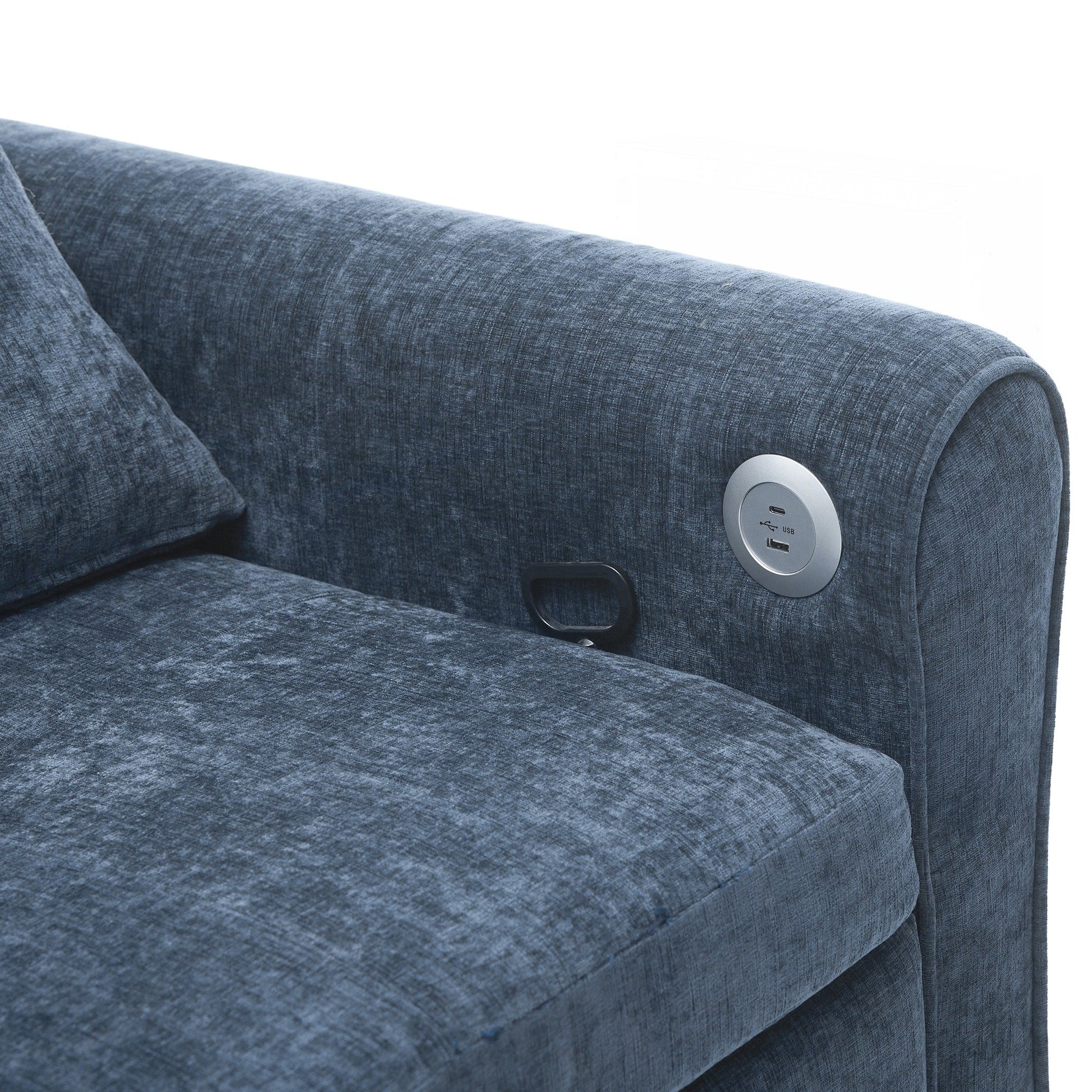 Dual USB Charging Ports Equipped with two built-in USB charging ports conveniently located on the armrest, this sofa lets you easily charge smartphones, tablets, or other electronic devices without leaving your seat. Elegant Curved Armrests with Tufted Detailing The sofa features gracefully rounded armrests that offer both enhanced arm support and a timeless, elegant silhouette. Button-tufted detailing on the backrests and seat cushions adds refined visual texture, elevating the overall aesthetic.