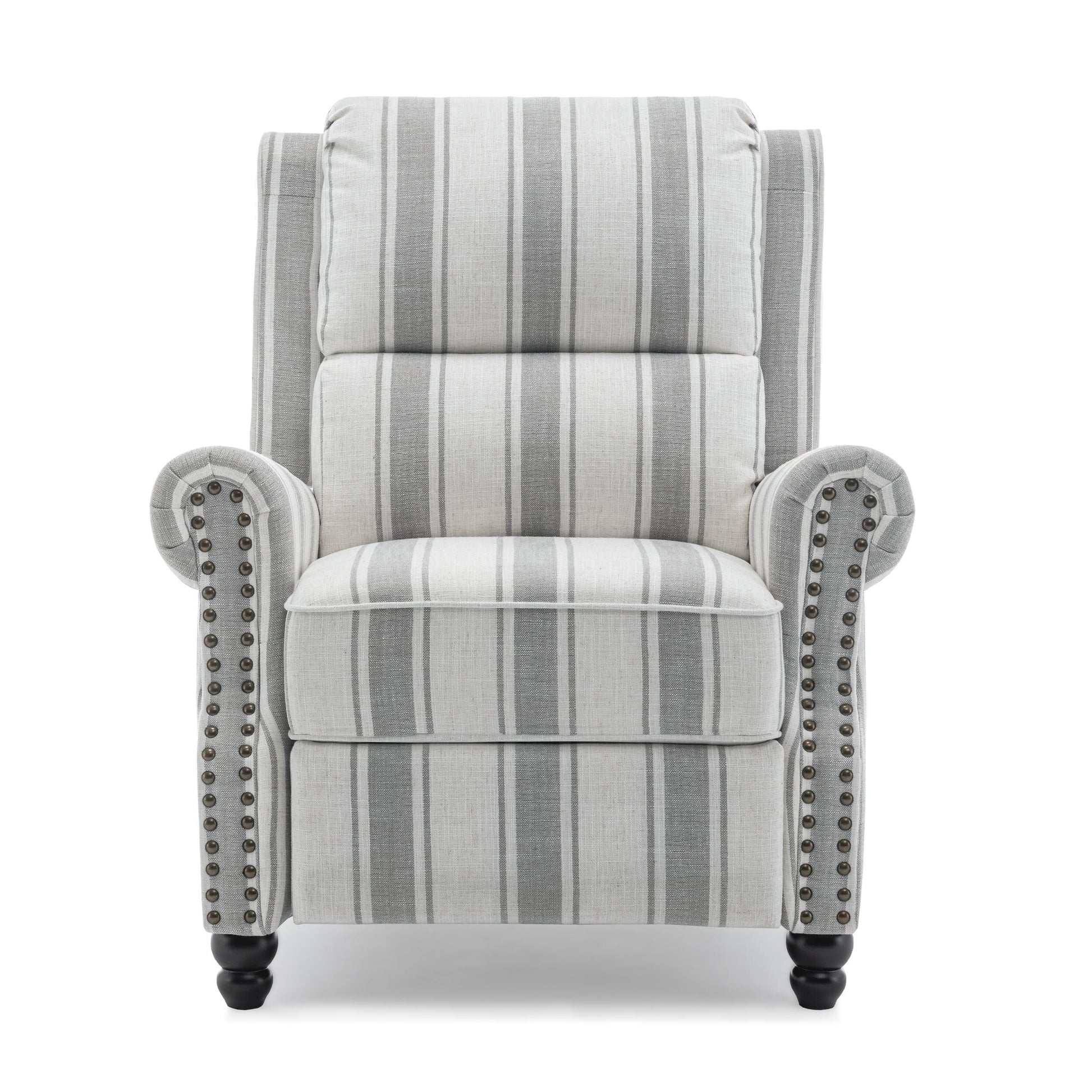 This classic vintage-style recliner perfectly combines elegance and luxury, making it the epitome of home quality. Featuring a wingback design and exquisite brass nailhead trim, it exudes timeless sophistication. The generously sized and comfortable backrest, filled with high-resilience foam, pairs with a soft seat cushion to offer ultimate relaxation. Its manual push-back mechanism allows you to effortlessly switch between two reclining positions, ensuring comfort whether you're sitting upright or reclining. This recliner not only emphasizes comfort but also enhances functionality, making it an essential piece for creating a cozy living space.