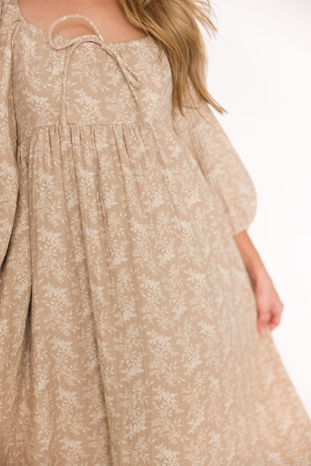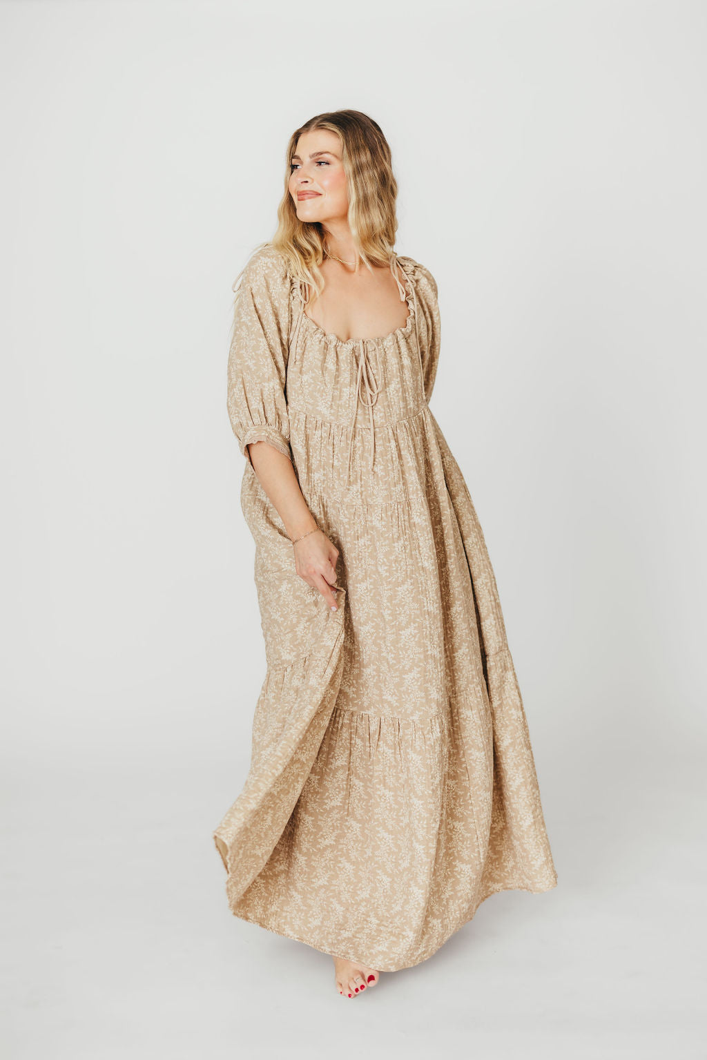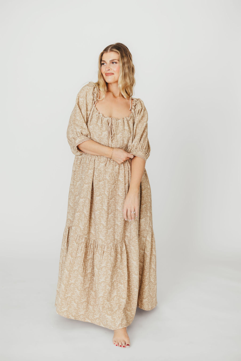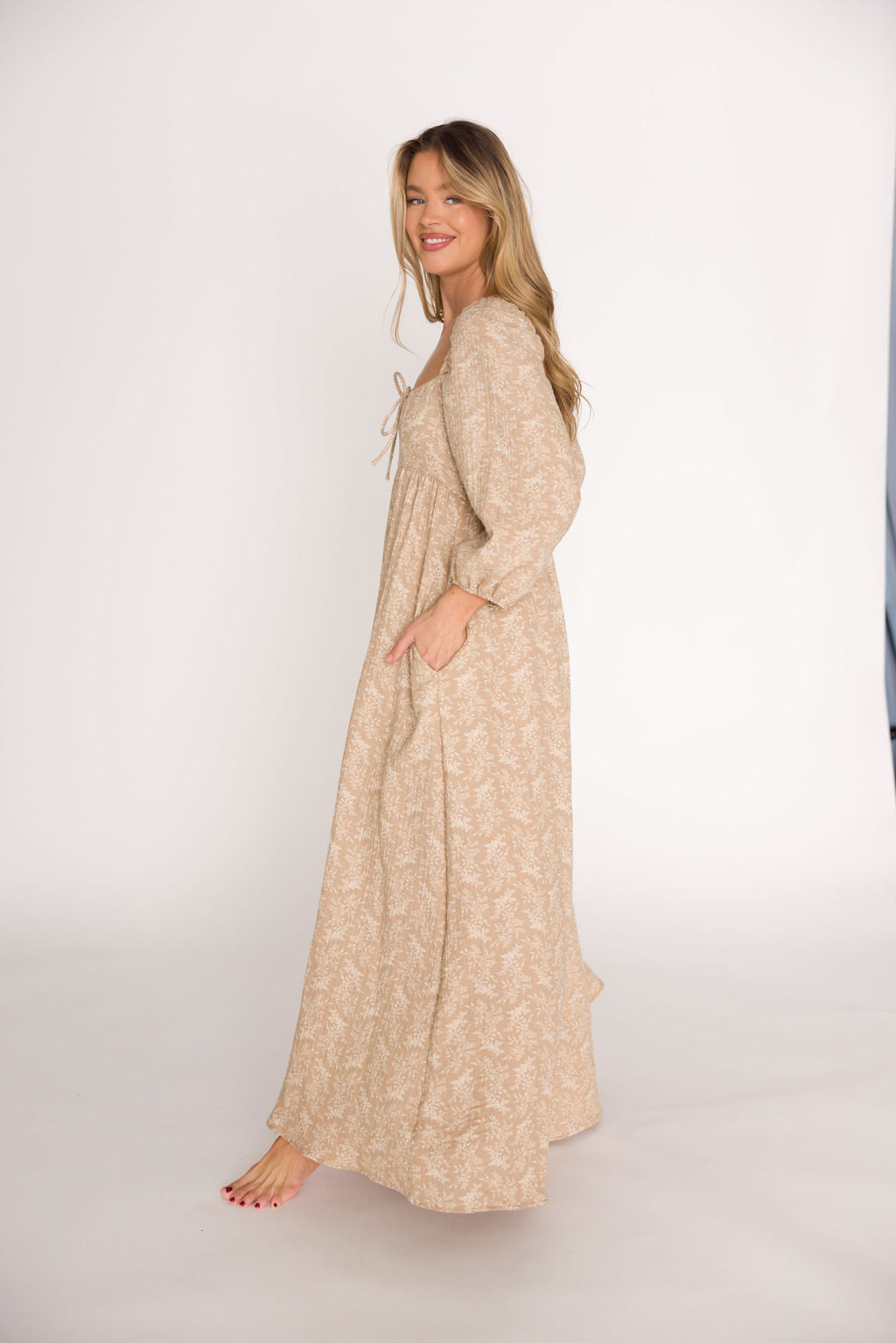GARMENT DETAILS: Elegant, lightweight maxi dress with square neckline, 3/4 length puffed sleeves, and a maxi-length flowy skirt. Features an empire-waisted bodice, with decorative front tie accent. Finished with side patch pockets.