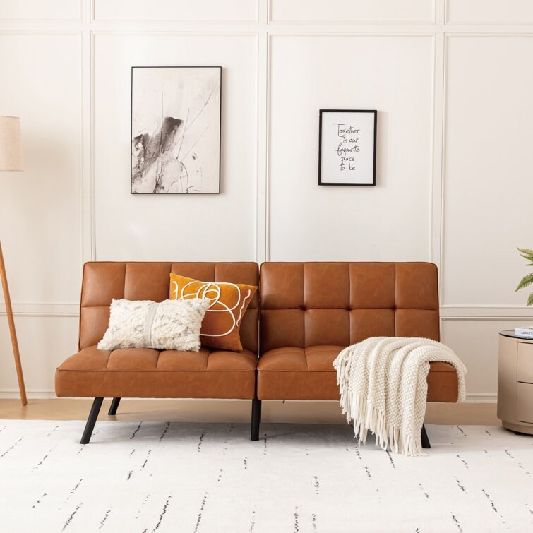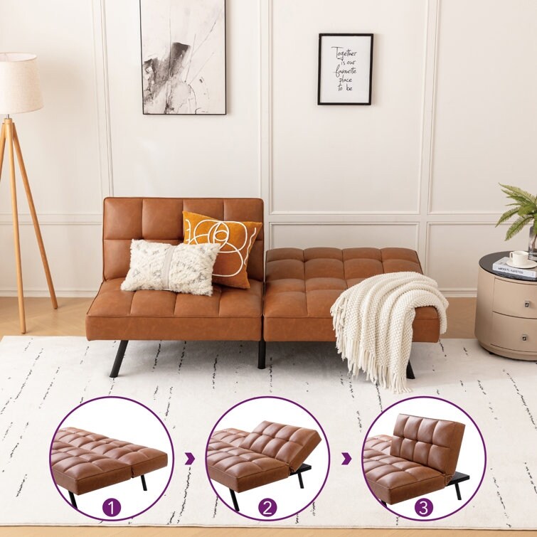 The 70.4â?box tufted convertible sofa in faux leather is a combination of comfort, durability, and design flexibility. Tailored for compact spaces, this furniture piece offers an ingenious solution for apartments, college dorms, offices, or any living area in need of efficient space-saving solutions. Seamlessly transitioning from a seated position to a reclined lounging stance, and further transforming into a comfortable twin-size bed, it readily accommodates friends and guests for various occasions. Crafted with an engineered wood frame, supported by six robust metal legs, and dressed in neutral-toned faux leather fabric, this convertible futon sofa bed effortlessly blends with any interior design. Assembling it is a breeze, demanding just 15 minutes of your time. For added peace of mind, we offer a 3-year limited warranty and hassle-free doorstep delivery, making this multipurpose sofa a straightforward decision. Elevate your space with the perfect fusion of style, functionality, and convenience, courtesy of our 70.4â?box tufted convertible sofa in faux leather.
