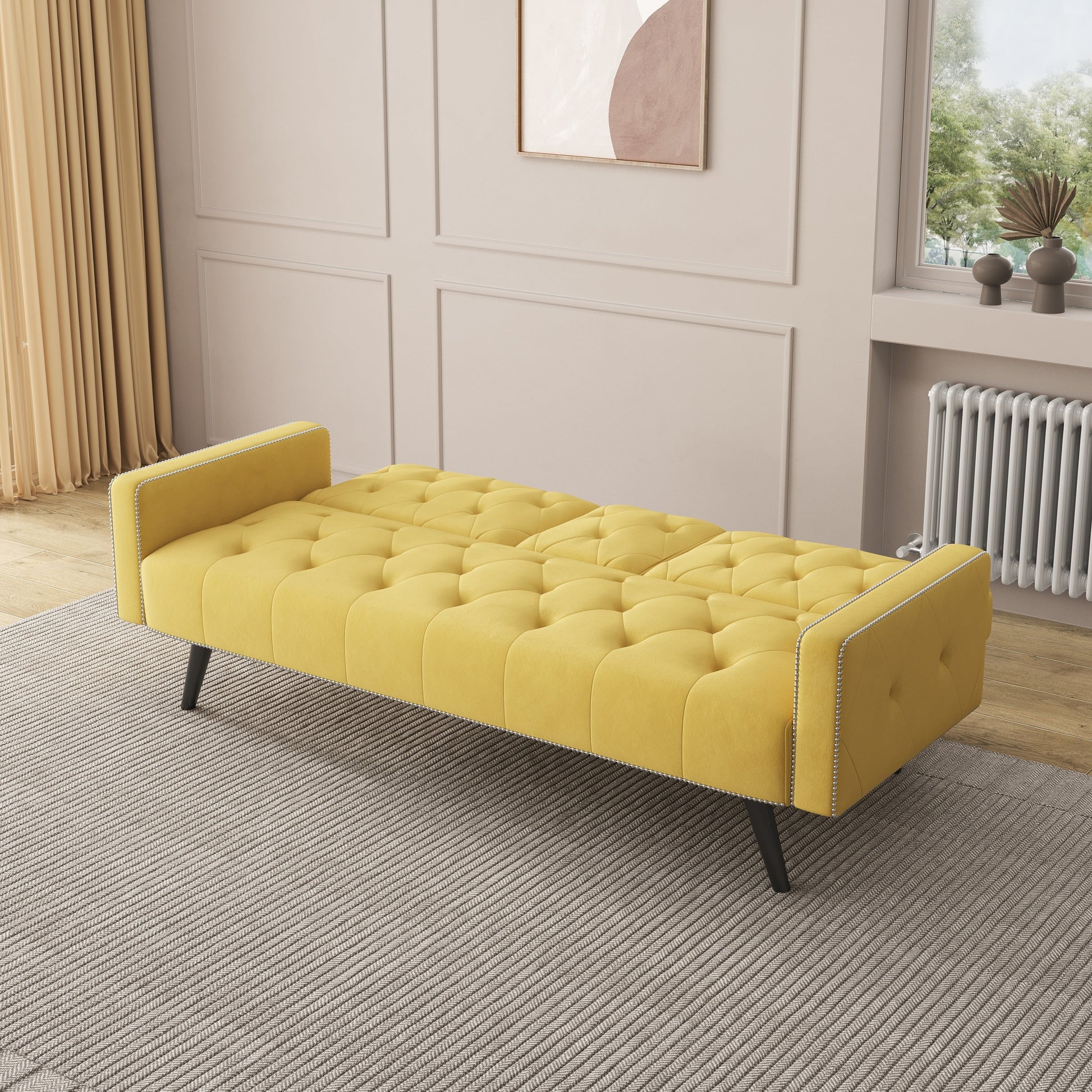 Stylish Design: Crafted with exquisite velvet fabric, this sofa boasts a tufted backrest and seat, accented by elegant armrests and nailhead trim detailing along the armrests and seat front. The even stitching adds a touch of sophistication, enhancing both comfort and aesthetic appeal.