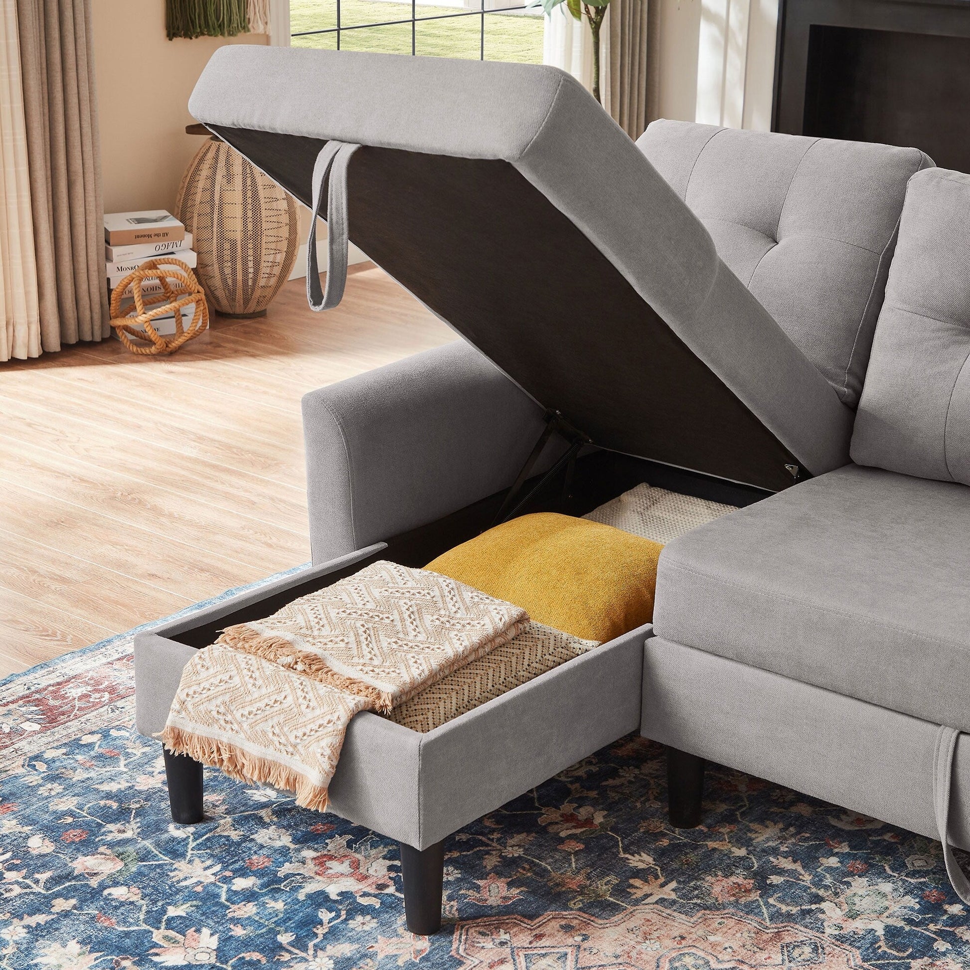 2.Convenient Storage Solution: The chaise includes ample storage space underneath, perfect for stowing away blankets, pillows, or any other essentials, keeping your living area organized and clutter-free.