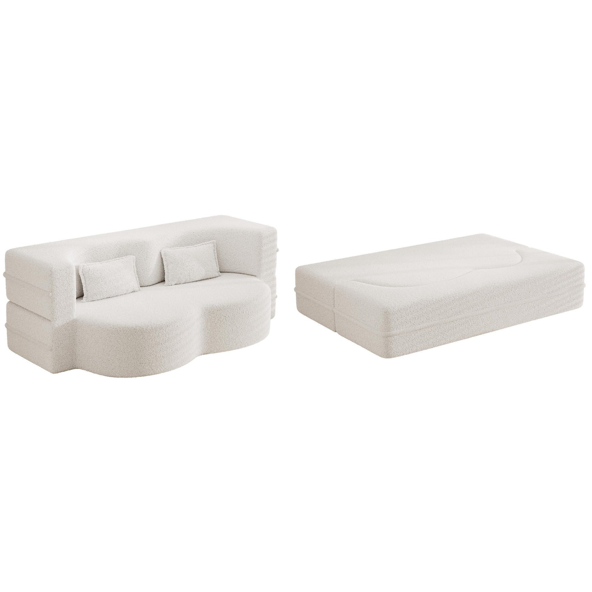 78 Convertible Teddy Fabric Loveseat Foam-Filled Floor Sofa Bed with 2 Pillows and Folding Mattress for Living Room