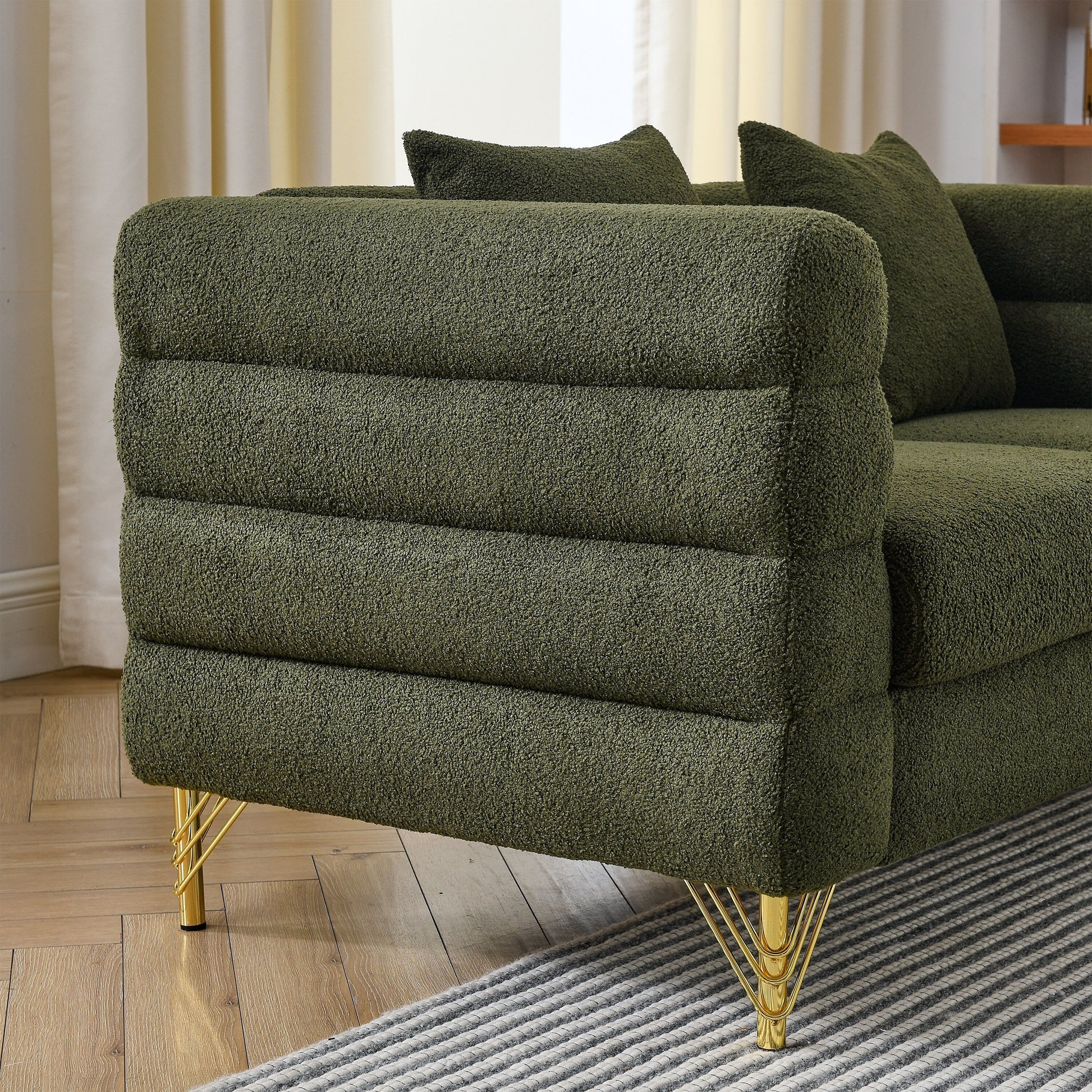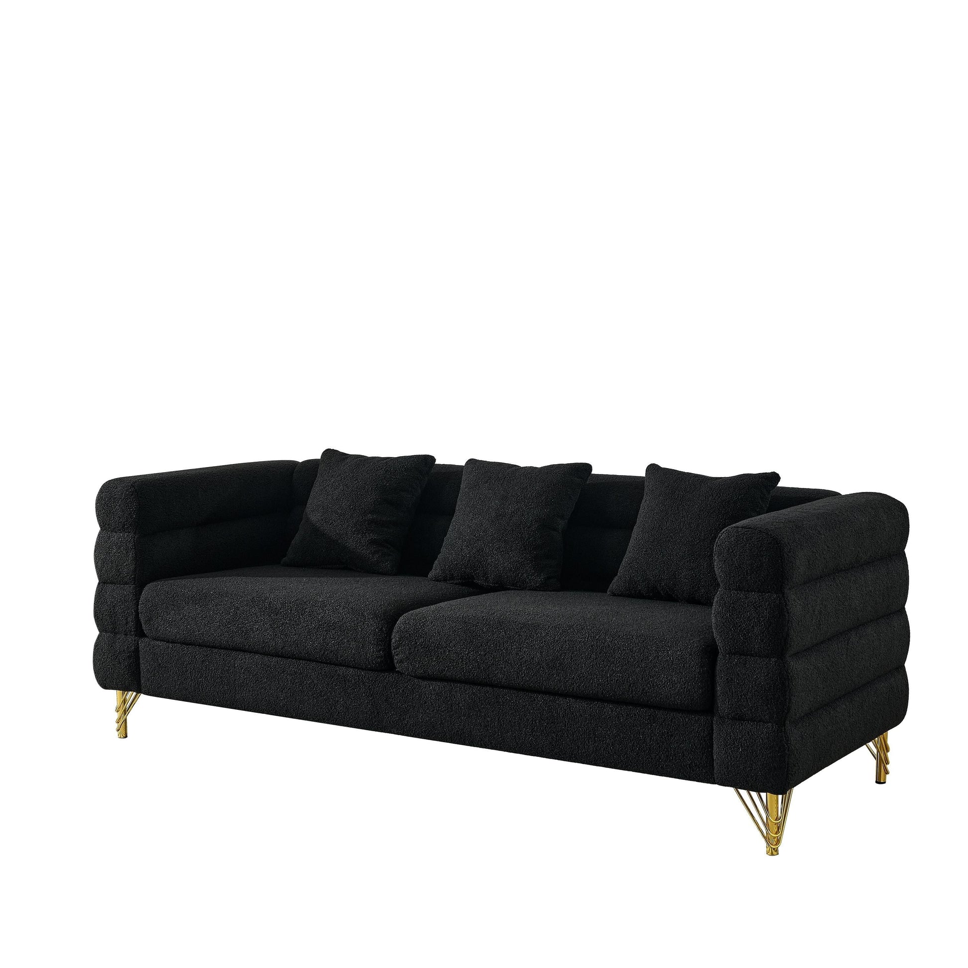 _ STREAMLINE MODERN: Inspired by the international Art Deco design of Streamline Modern, the Buccleuch sofa's distinctive silhouette features gently curved shapes and long horizontal lines, with metallic luster on the legs. Making this sofa extremely stylish. _ [Premium 3 Lumbar Pillows] The sofa comes with three small lumbar pillows (size: 16*16 inches, color fabric: same as the sofa), which can be cushioned on the lumbar area or held in your hand while sitting. _ DURABLE: The sofa is supported by solid wood frame and sturdy gold polished metal legs, this modern three seater living room sofa is strong and durable. Each seat can easily hold up to 250 pounds, making it ideal for three people to relax. _ Overall dimensions: width 81 inches x depth 32 inches x height 28 inches _ Detailed dimensions: sitting width 66 inches, sitting depth 24.5 inches, sitting height 19 inches _ [Fast Delivery]. All of our sofas are shipped from our US warehouse for fast delivery.