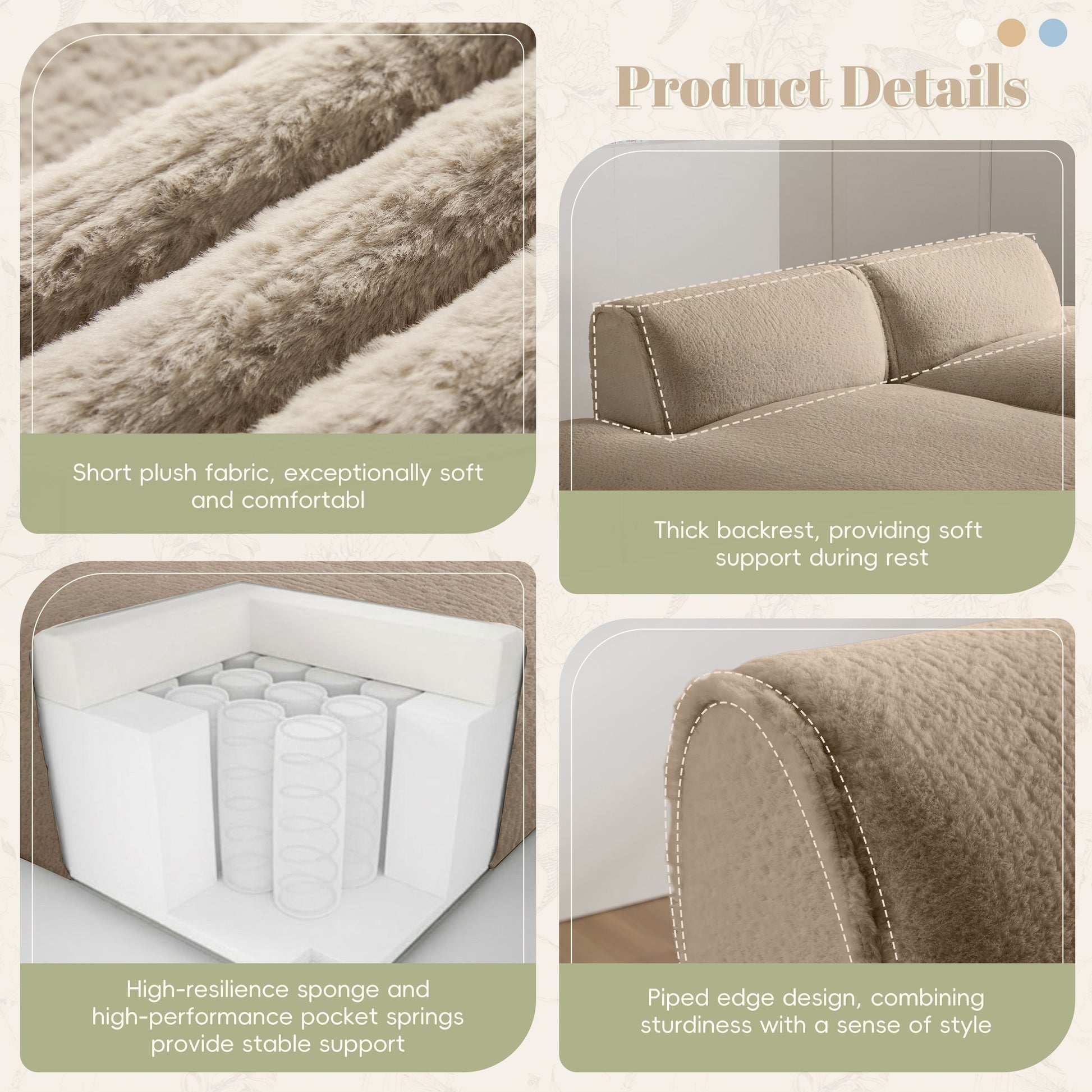 Comfortable Seating Experience The sofa is composed of springs and soft sponges, providing excellent comfort and support.The sponge conforms to the body's contours, providing a plush and cozy seating experience. It ensures optimal relaxation and prevents discomfort, even during extended periods of use. Two Modular Pieces The sofa consists of two modular pieces that can be easily rearranged, giving customers the flexibility to create different seating arrangements. Minimalist Line Design on Armrests and Backrest The armrests and backrest feature a minimalist line design, creating a clean, elegant look that fits seamlessly into Modern interior decoration style. Features Product Type Sofa Design Modular Sectional Sofa Products included Loveseat Seating Capacity 2 Upholstery Material plush fabric Frame Material Foam Leg Material / Seat Fill Material Foam+Individual Pocket Springs Back Fill Material Foam+PP cotton Removable Cushions Yes Removable Cushion Location No Removable Cushion Cover No Pillows Included No Product Care Lightly brush or vacuum frequently to remove dust and grime. Spot clean using a mild water-based solvent. Pre-test cleaning methods on a hidden surface. A professional cleaning service is recommended for an overall soiled condition. Back Type Semi-Attached Pillows Supplier Intended and Approved Use Residential Use Country of Origin China