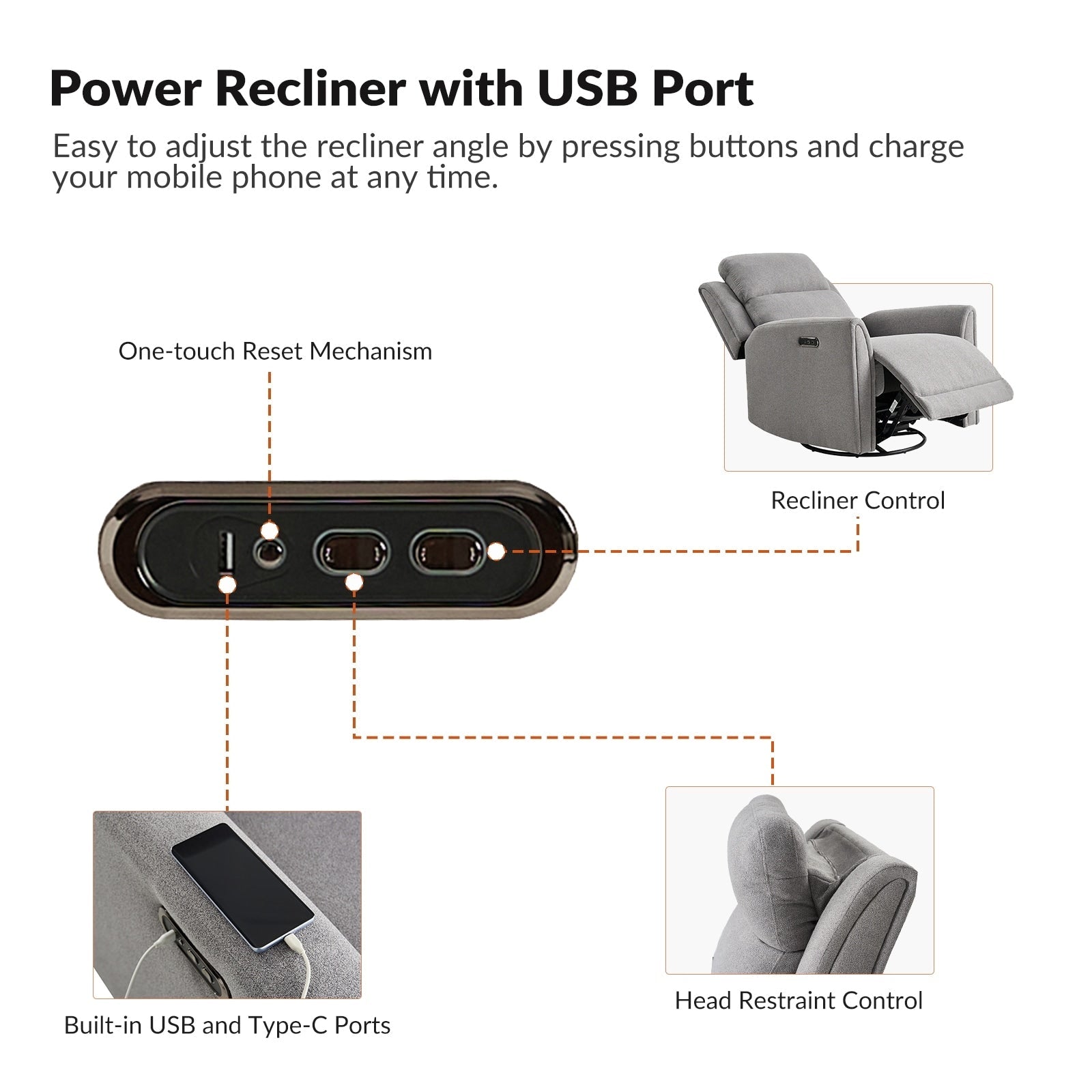 Suitable for your living room, bedroom, or study, the modern swivel and rocking power recliner offers comfort for your leisure time. With its 360-degree swivel and rocking design, you can easily adjust your position to find the angle for reading, watching TV, or simply unwinding after a long day. The convenient one-touch reset mechanism allows you to effortlessly adjust your position, while the adjustable headrest provides personalized comfort and support. Stay connected and powered up with the built-in USB and type-c ports, ensuring your devices are always within reach. Crafted with a soft-touch fabric in elegant shades of white or grey, the contemporary swivel recliner seamlessly blends style with functionality. Whether unwinding after a long day or catching up on your favorite book, this transitional style power recliner provides a spot to relax and recharge.