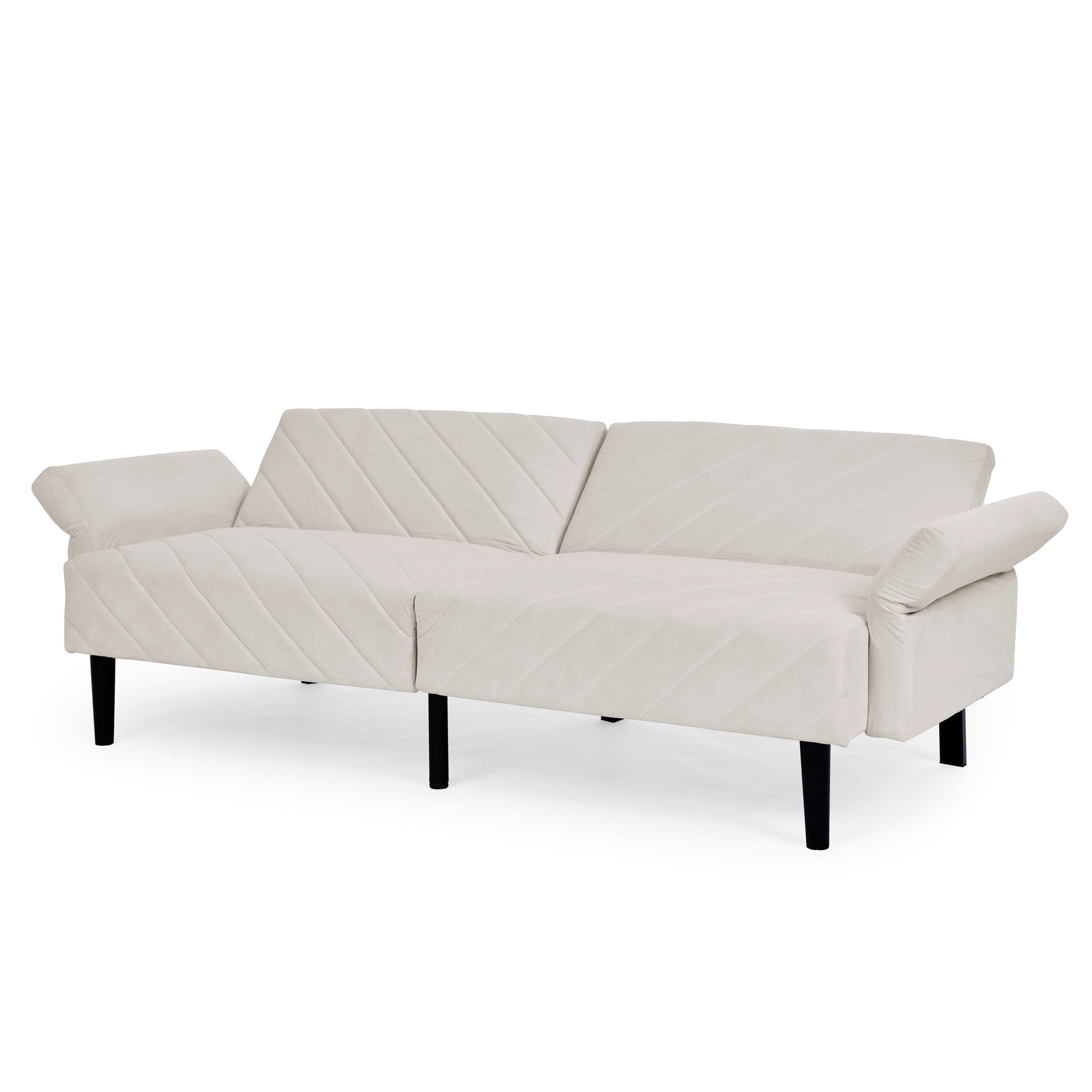 Elevate your living space with this timeless and versatile velvet futon sofa bed. Combining modern lines with mid-century modern details, such as chevron tufting and tapered plastic legs, this piece adds style to any decor. The velvet upholstery not only looks elegant but also adds extra comfort and durability, allowing you to enjoy its softness and warmth. The multi-angle adjustable armrests and backrests provide customized comfort, with the backrest adjustable in 6 positions (90° to 180° reclining), making it perfect for reading, entertainment, or sleeping. Simply pull to switch it between a sofa, bed, and recliner. Built for long-term use, the frame is made of iron and solid wood, ensuring a stable structure, while the high-density foam provides firm and comfortable support that will not deform. The adjustable armrests offer more sleeping space, allowing you to stretch comfortably on the sofa bed instead of curling up. The sleeper area measures 87' x 39.5' x 17.5', providing ample space for relaxation.