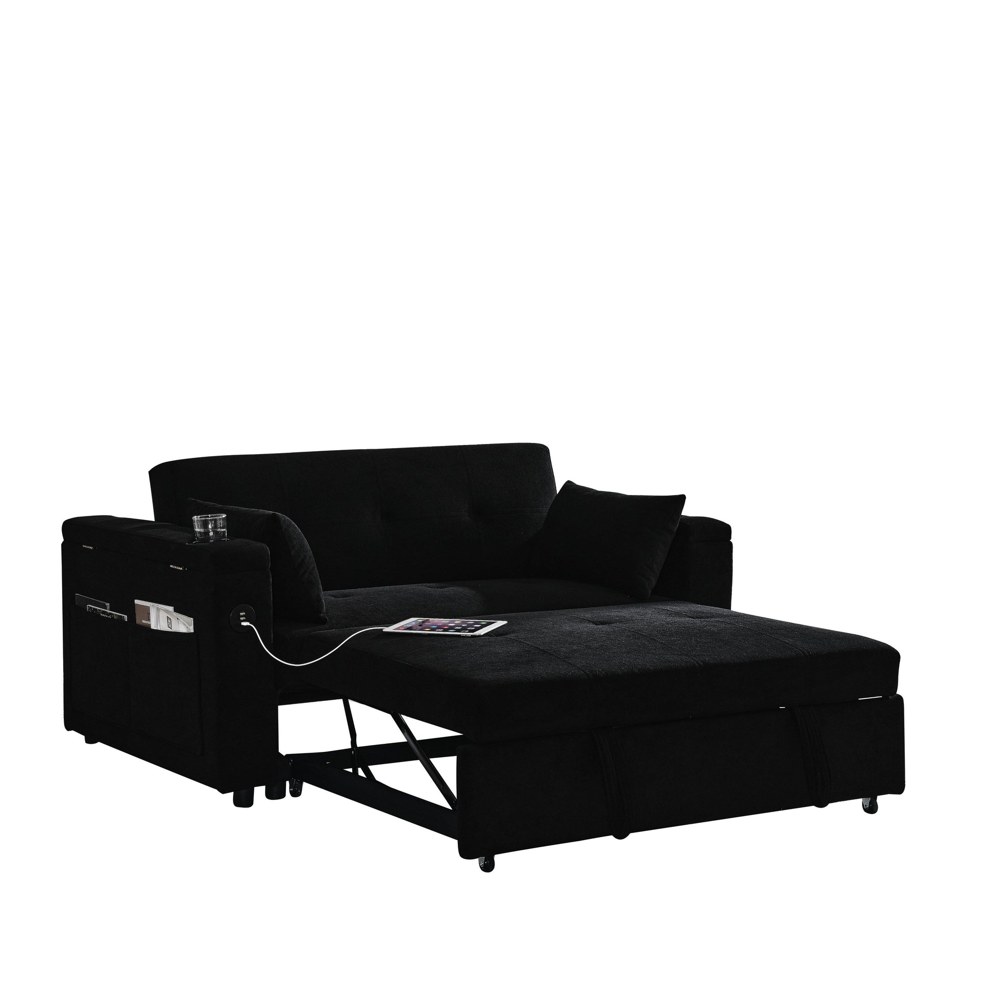 Black 54'' Double-Seater Fabric Sofa: Pull-Out Bed, Armrest Storage, and USB Charging Port