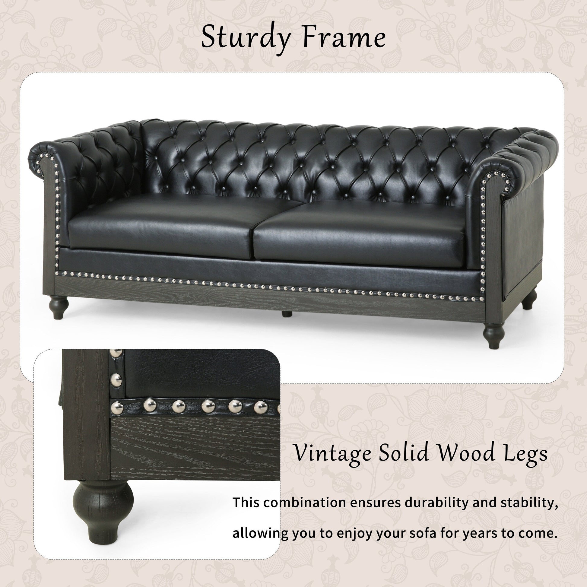 Black Chesterfield 78.75 Faux Leather 3-seater Sofa with Wood Legs and Nailheads for Living Room
