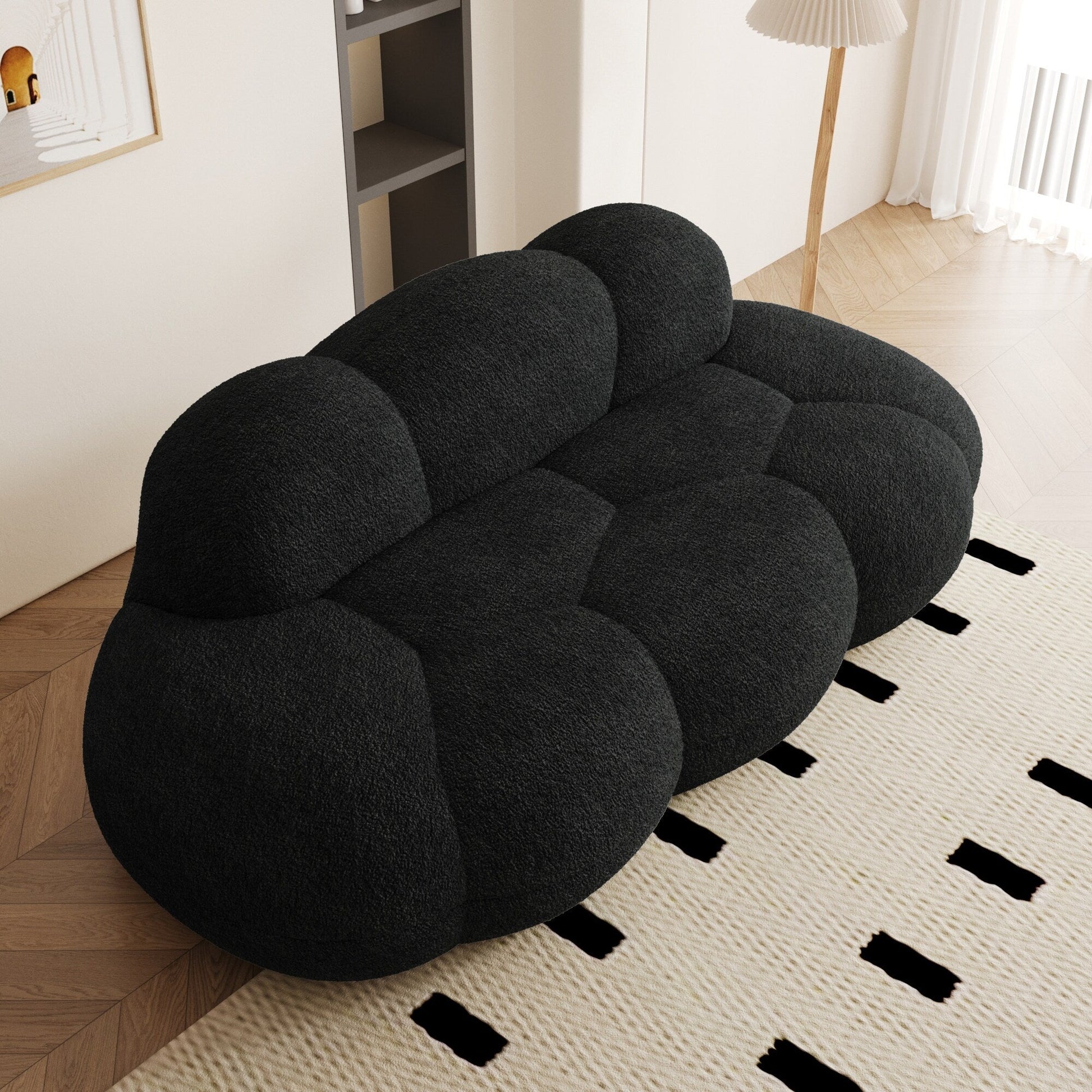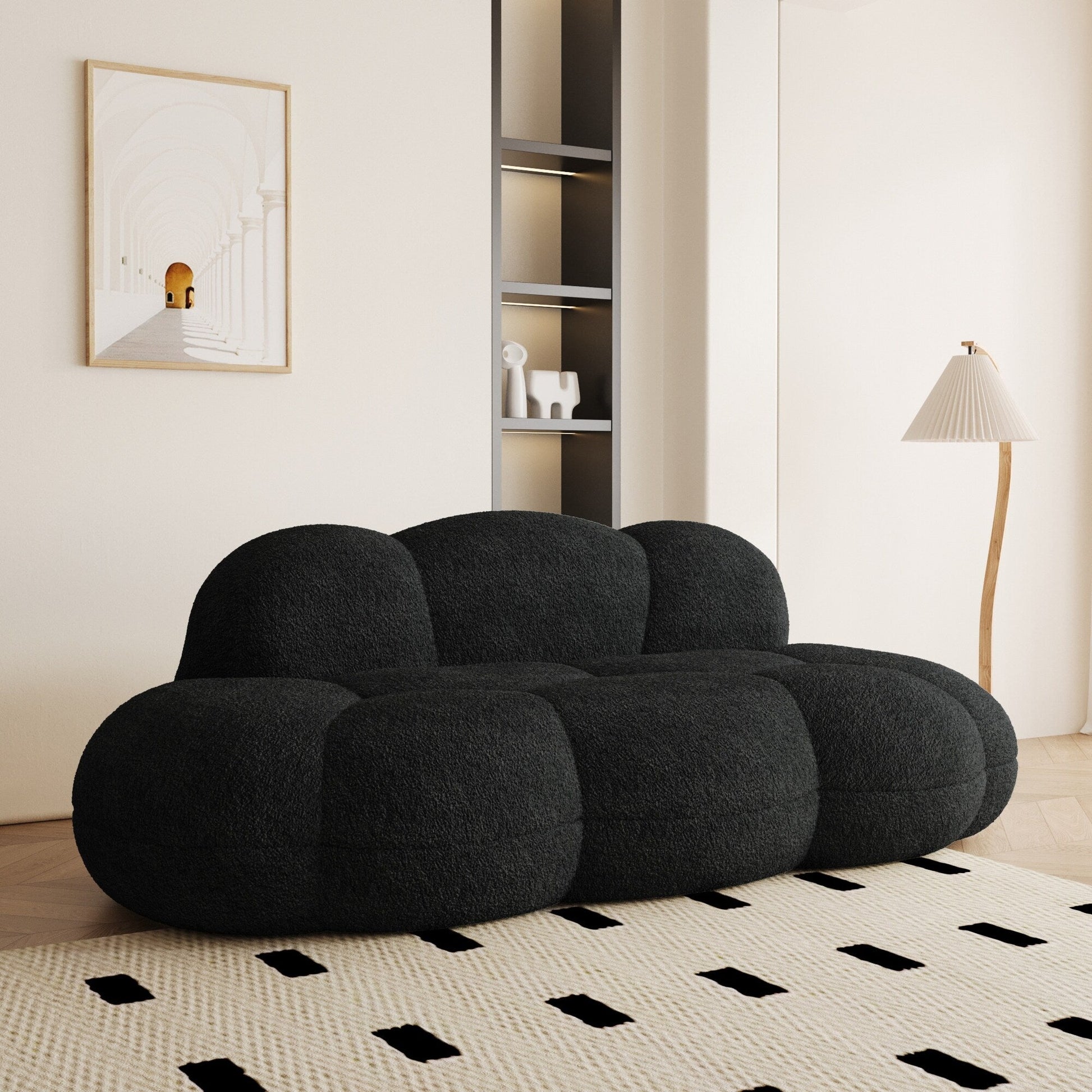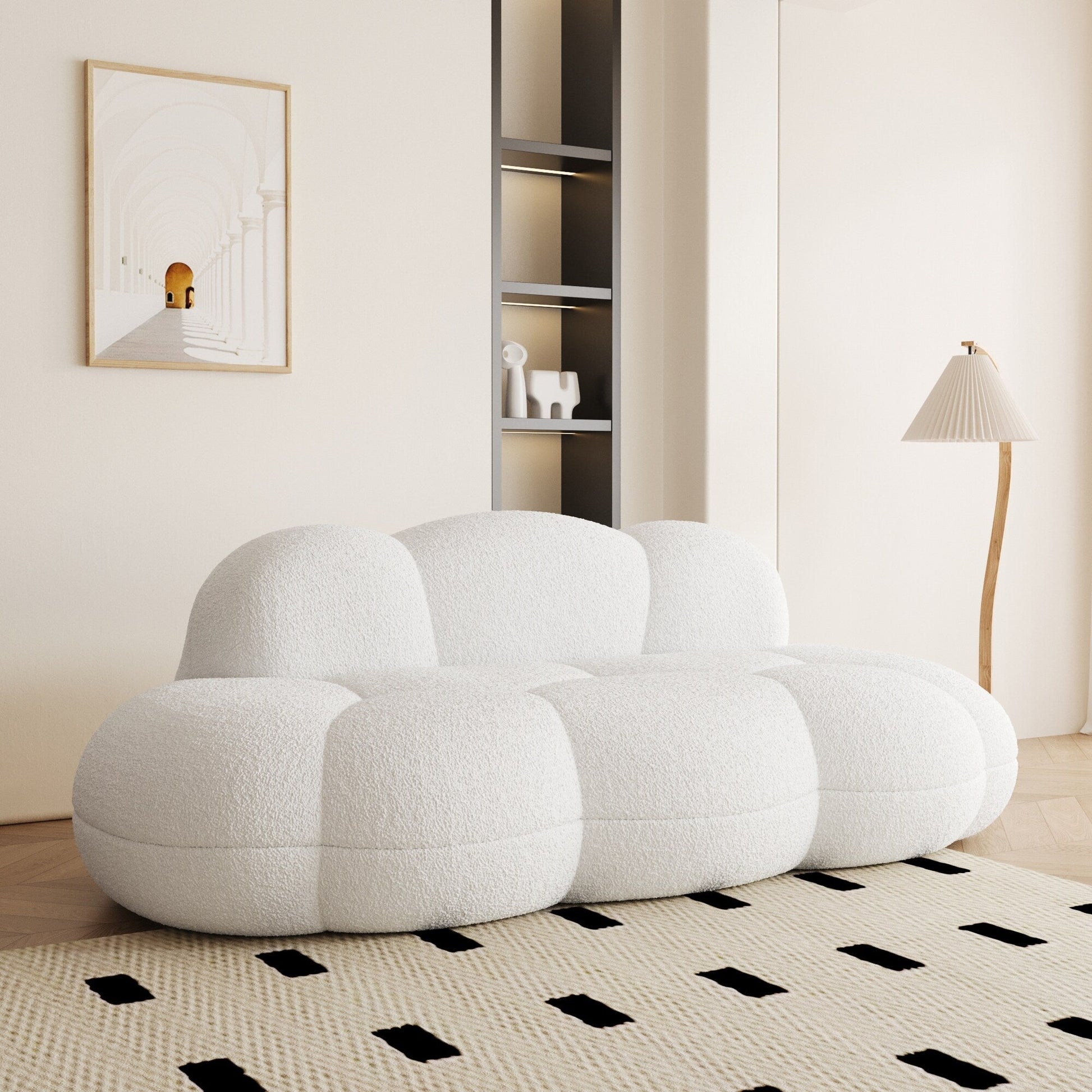 This clould sofa is a stunning piece of furniture that draws inspiration from the modern design aesthetics of the middle ages. This modern arrives vacuum-packed in cartons for effortless handling, with zero assembly required. With its compact size, this boucle sofa is perfect for small spaces and can accommodate up to two people comfortably. Hight respensibility foam cushioning and durable boucle fabric, which ensures both comfort and durability.
