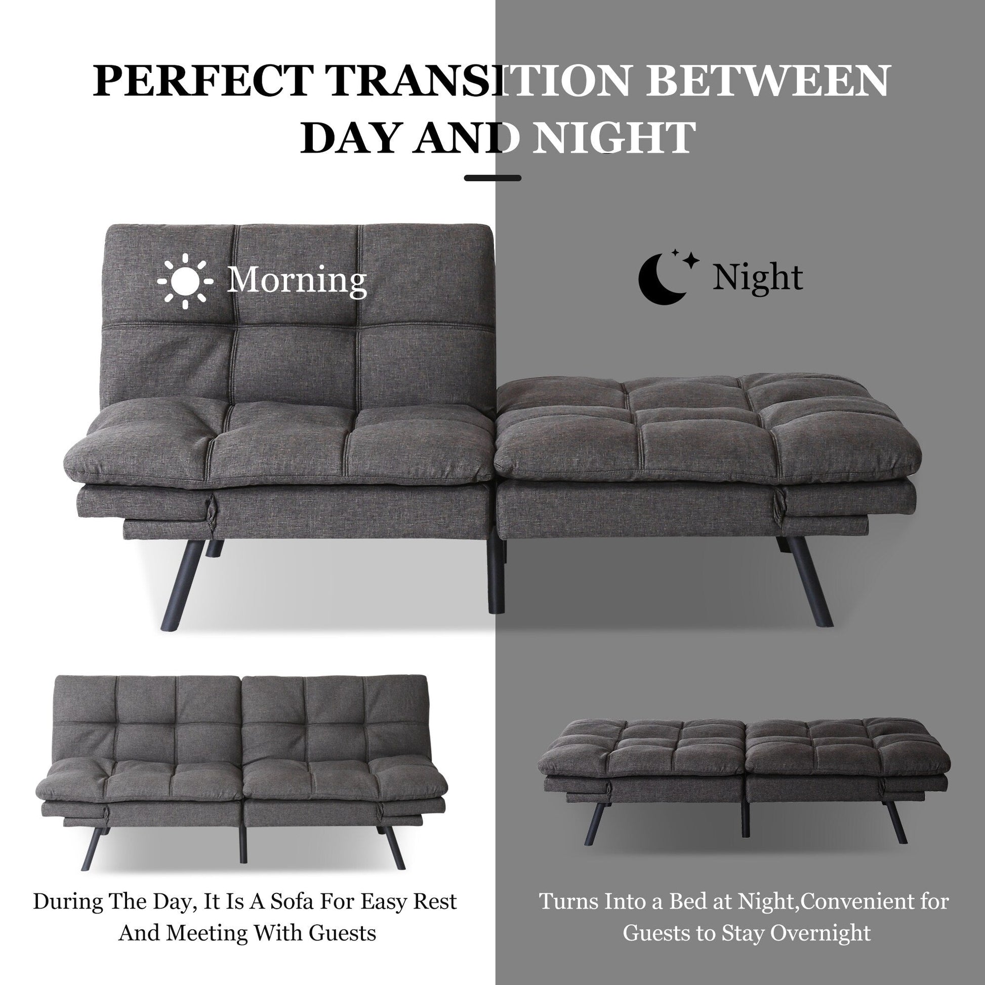 • This sofa bed transforms effortlessly from a modern Futon sofa to a cozy bed. Perfect for apartments, offices, guest rooms, and bedrooms. It meets diverse needs, whether you need a place to relax after a long day or a bed for guests. With its stylish design and functionality, it adds charm and convenience to any living space.