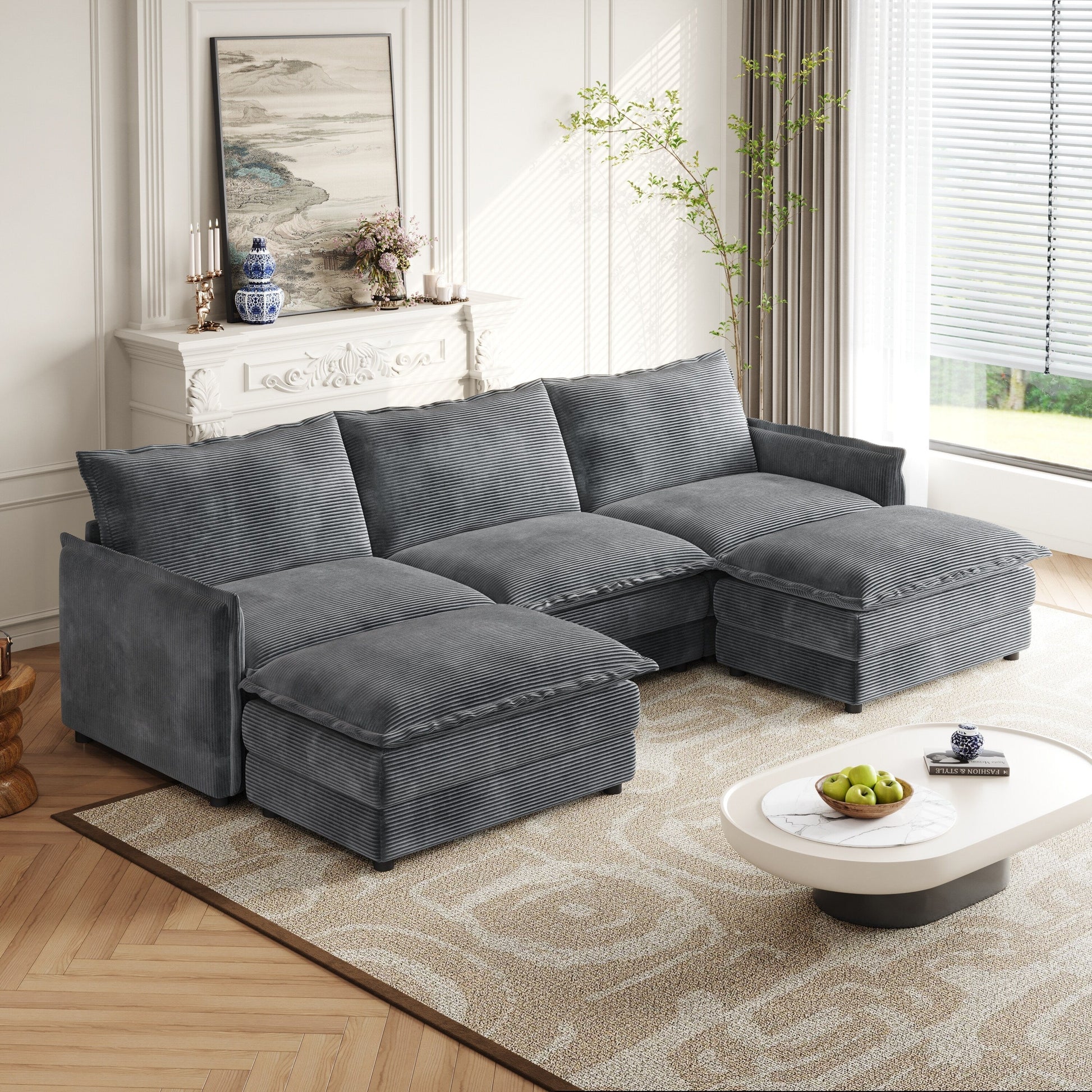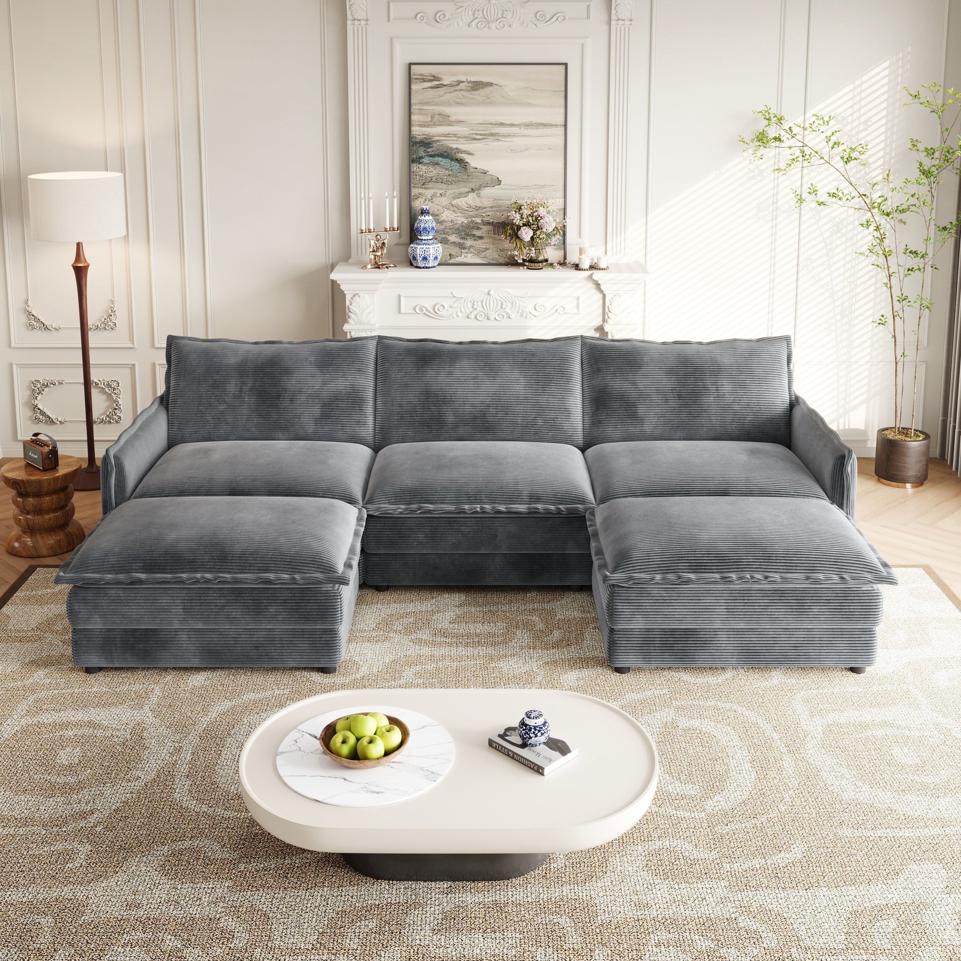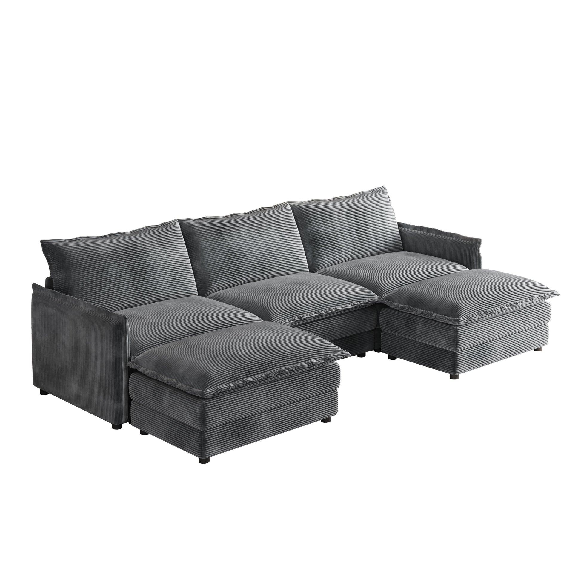Corduroy Fabric 3-Seater Cloud Couch with 2 Movable Footrest,U Shaped Couch Set,Upholstered Deep Seat 2-Seat with 3 cushions