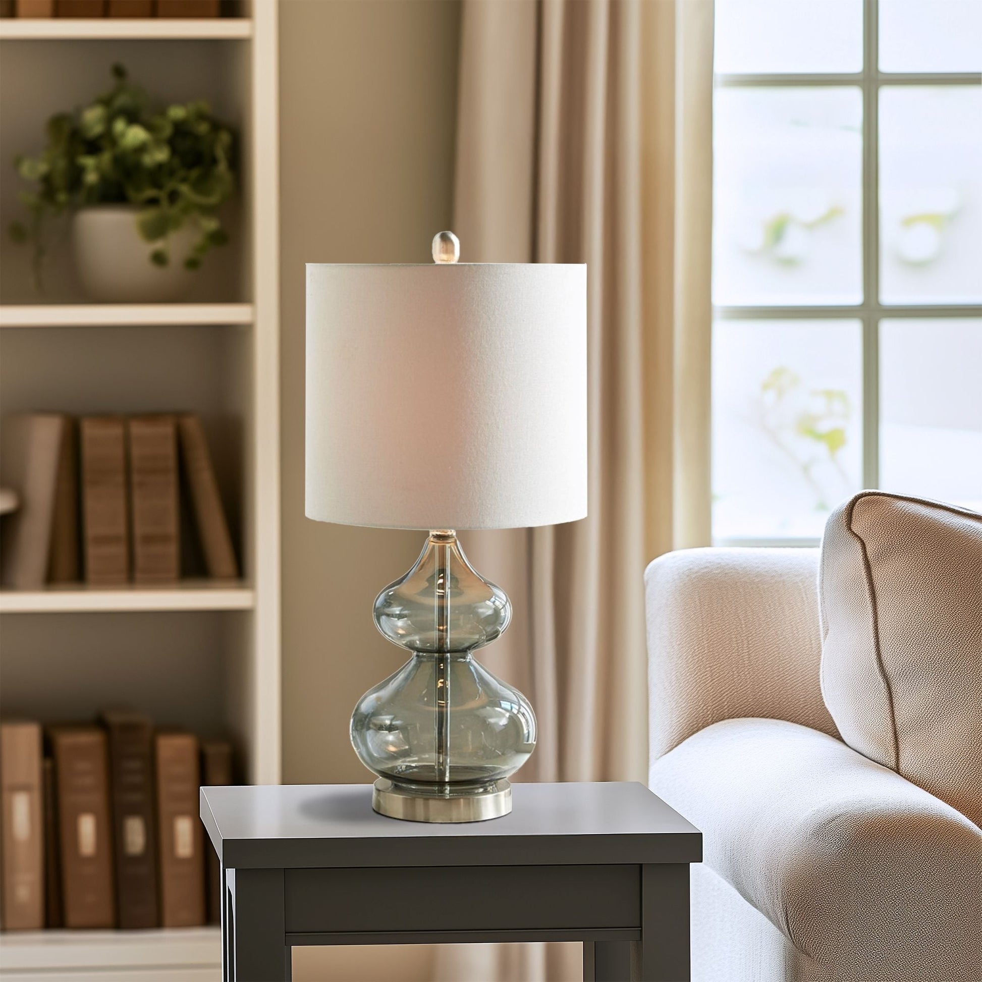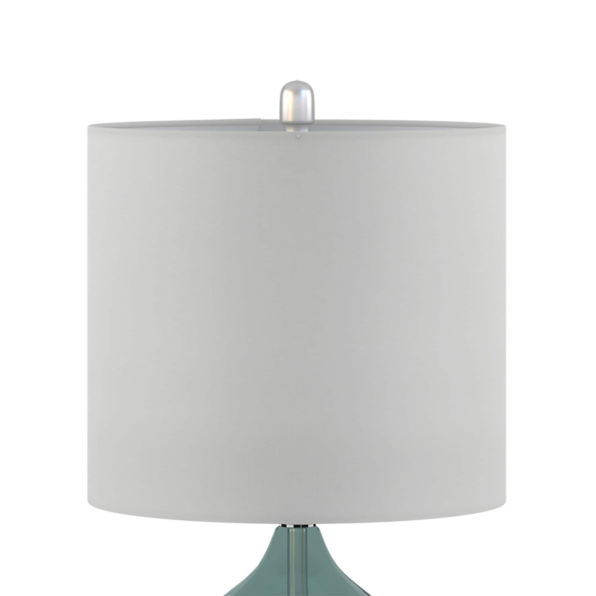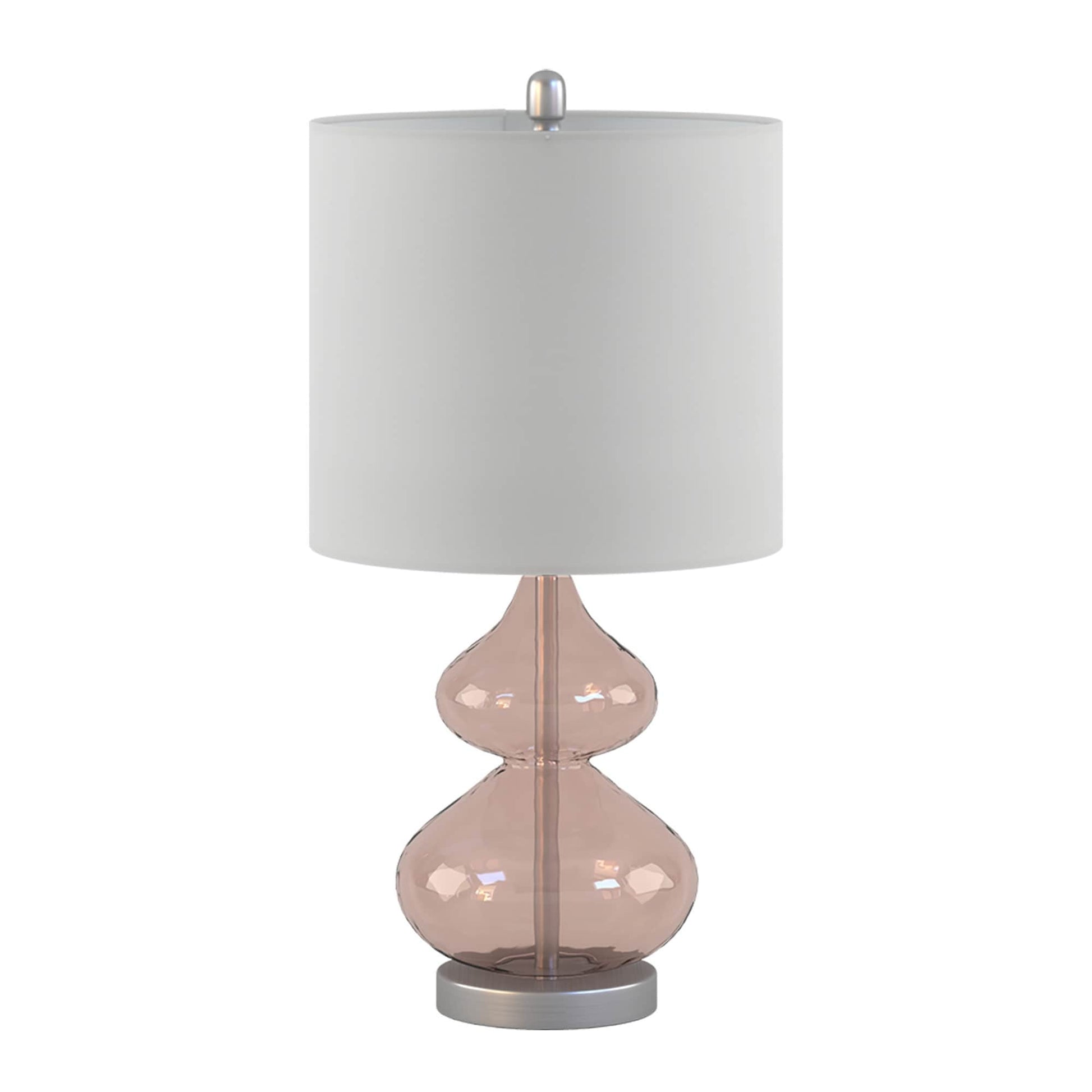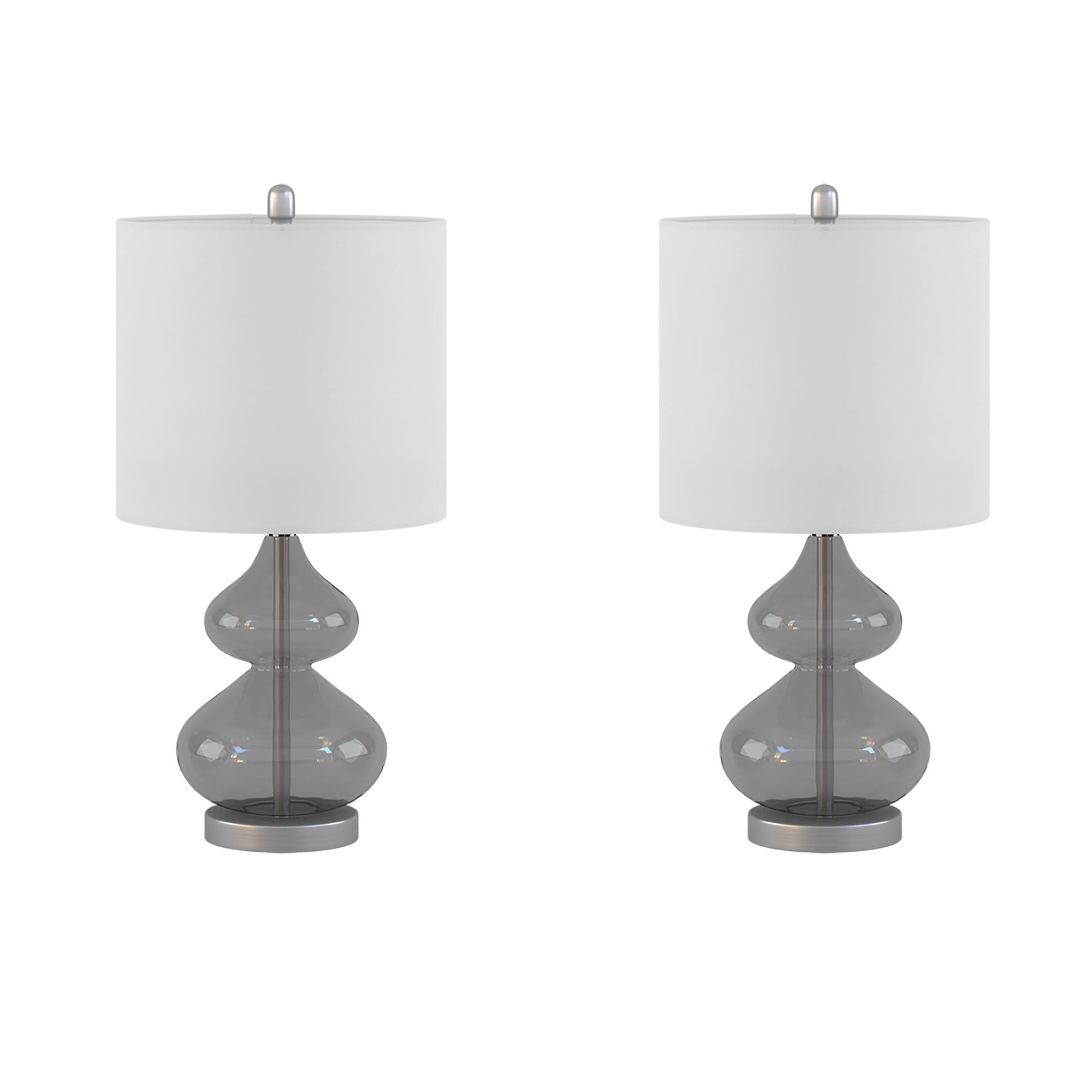 The 510 Design Ellipse Table Lamp Set brings modern elegance to any space. This set of 2 lamps features double-stacked gourd-shaped glass bases with polished surfaces and brushed gold metal accents. The translucent glass softly diffuses light for a warm, ambient glow. Each lamp is topped with a white fabric drum shade and a gold metal finial for a sophisticated touch. Designed for versatility, they provide both upward and downward lighting and include two energy-efficient 9W LED bulbs. Perfect for living rooms, bedrooms, or home offices. Spot clean only. Includes a 2-year limited warranty.