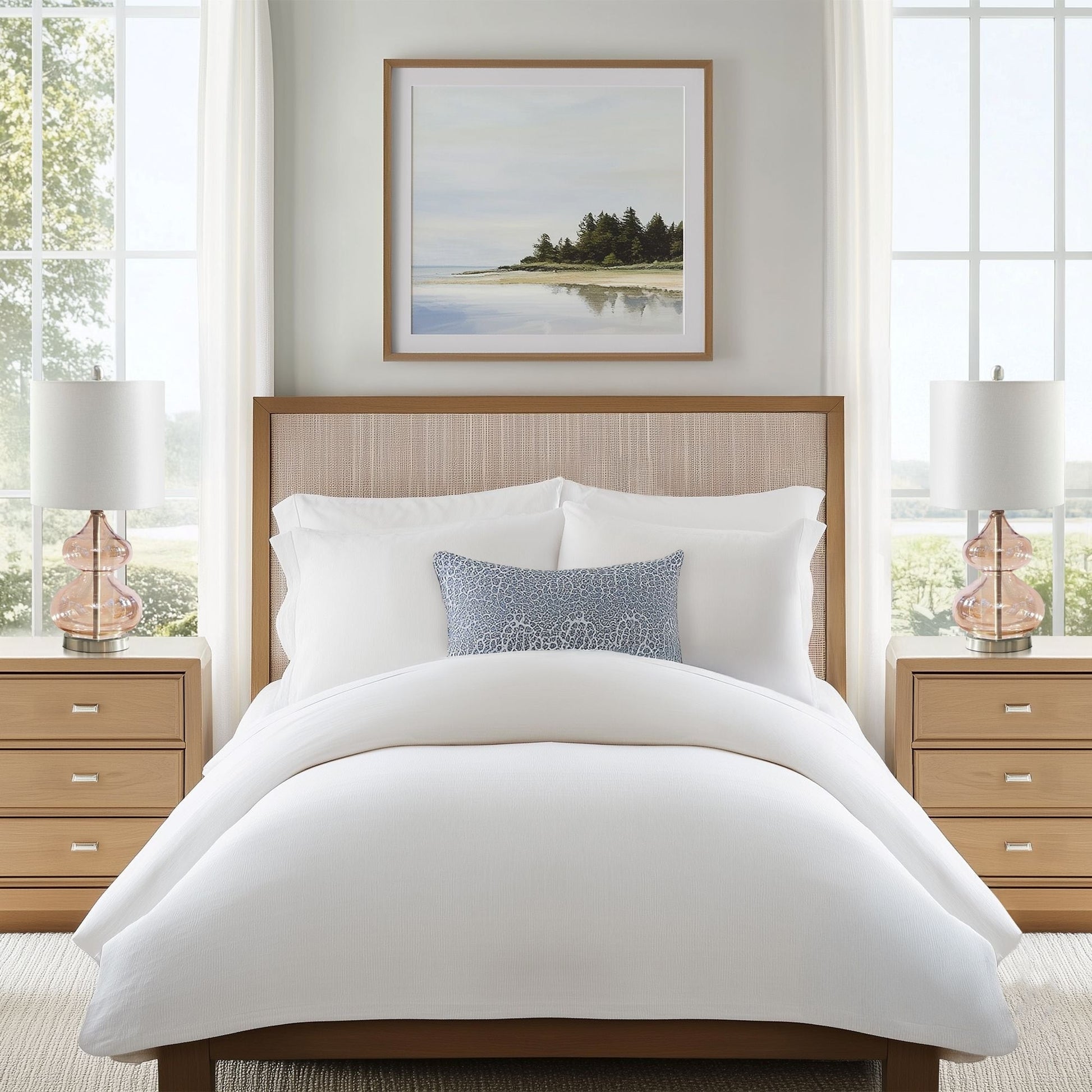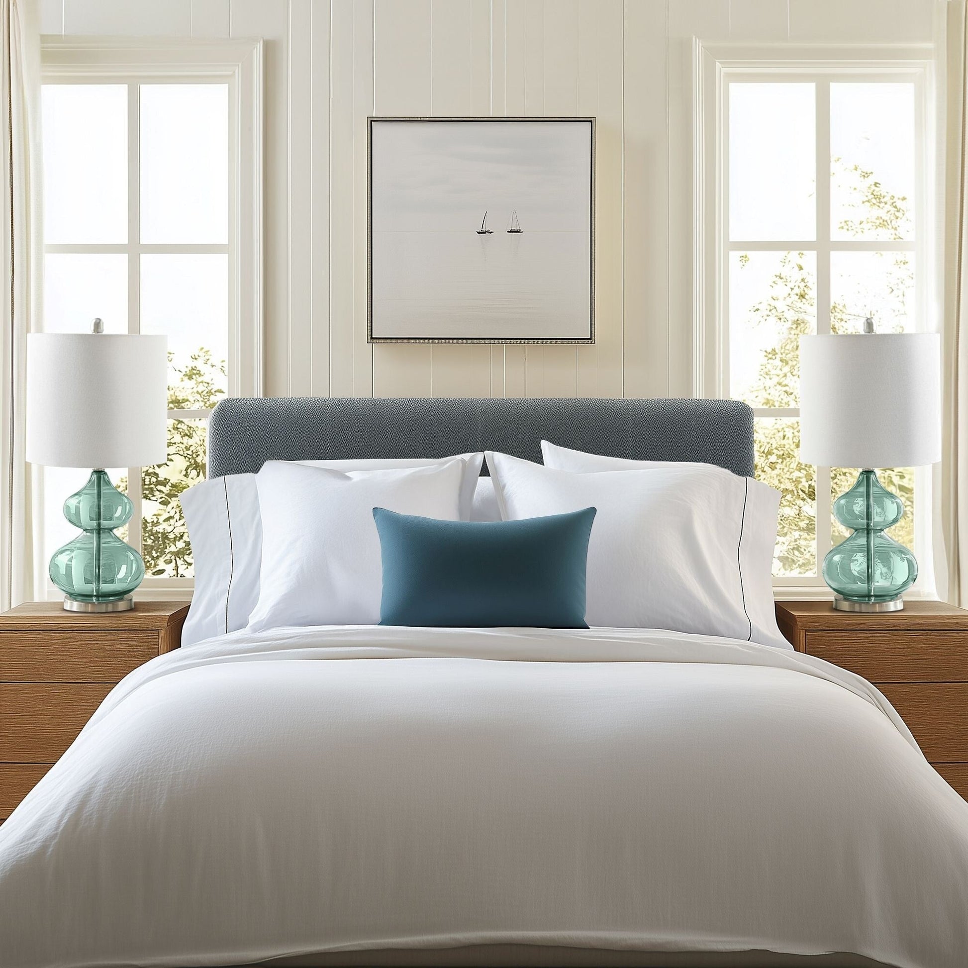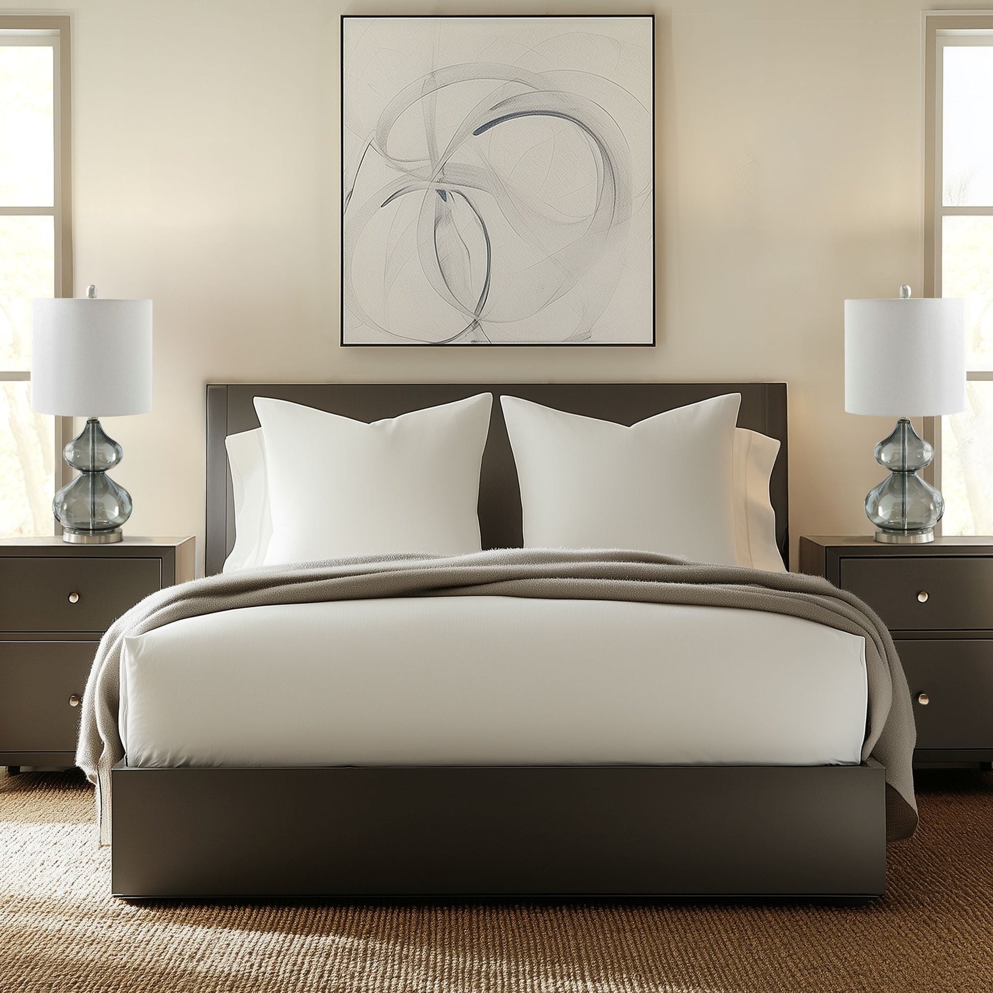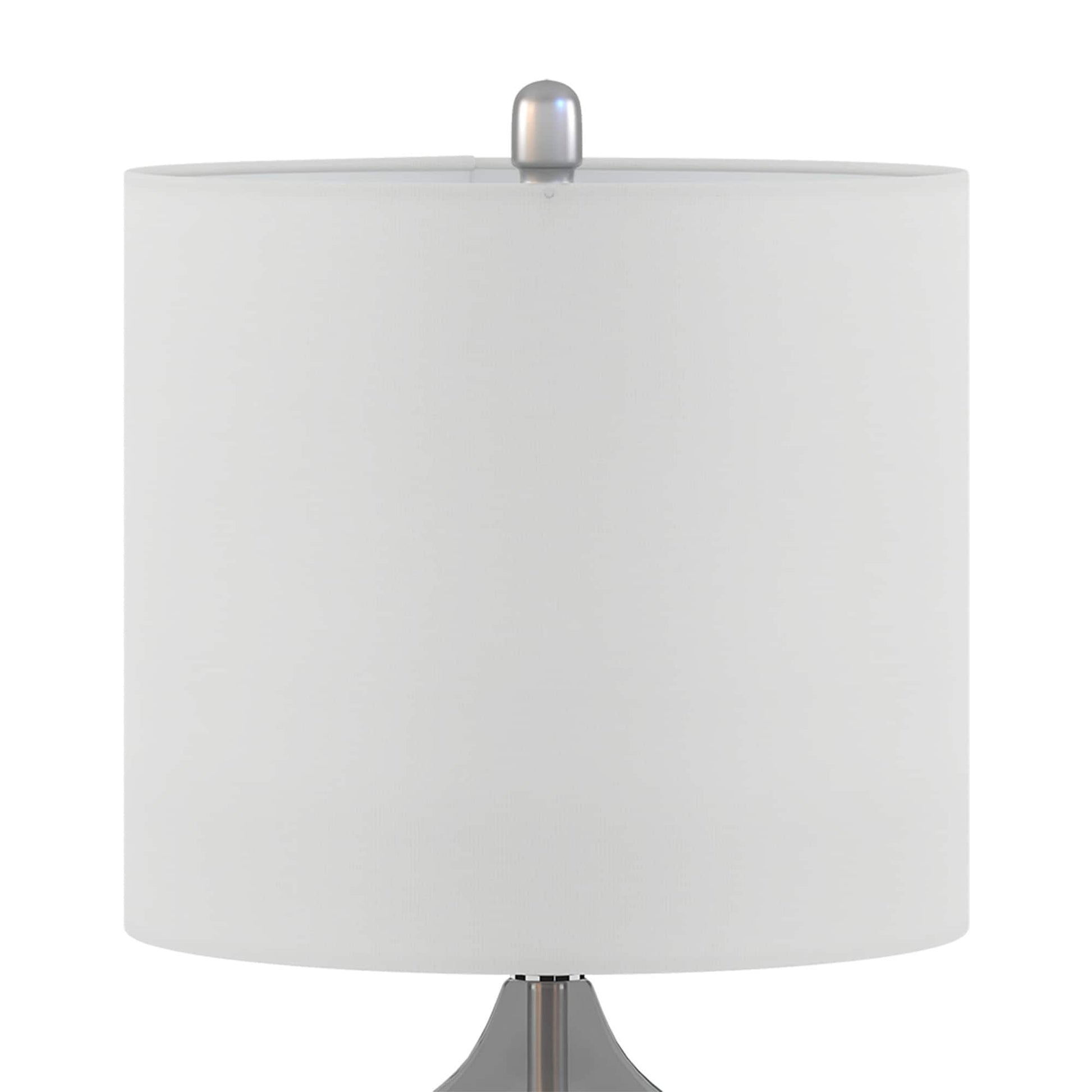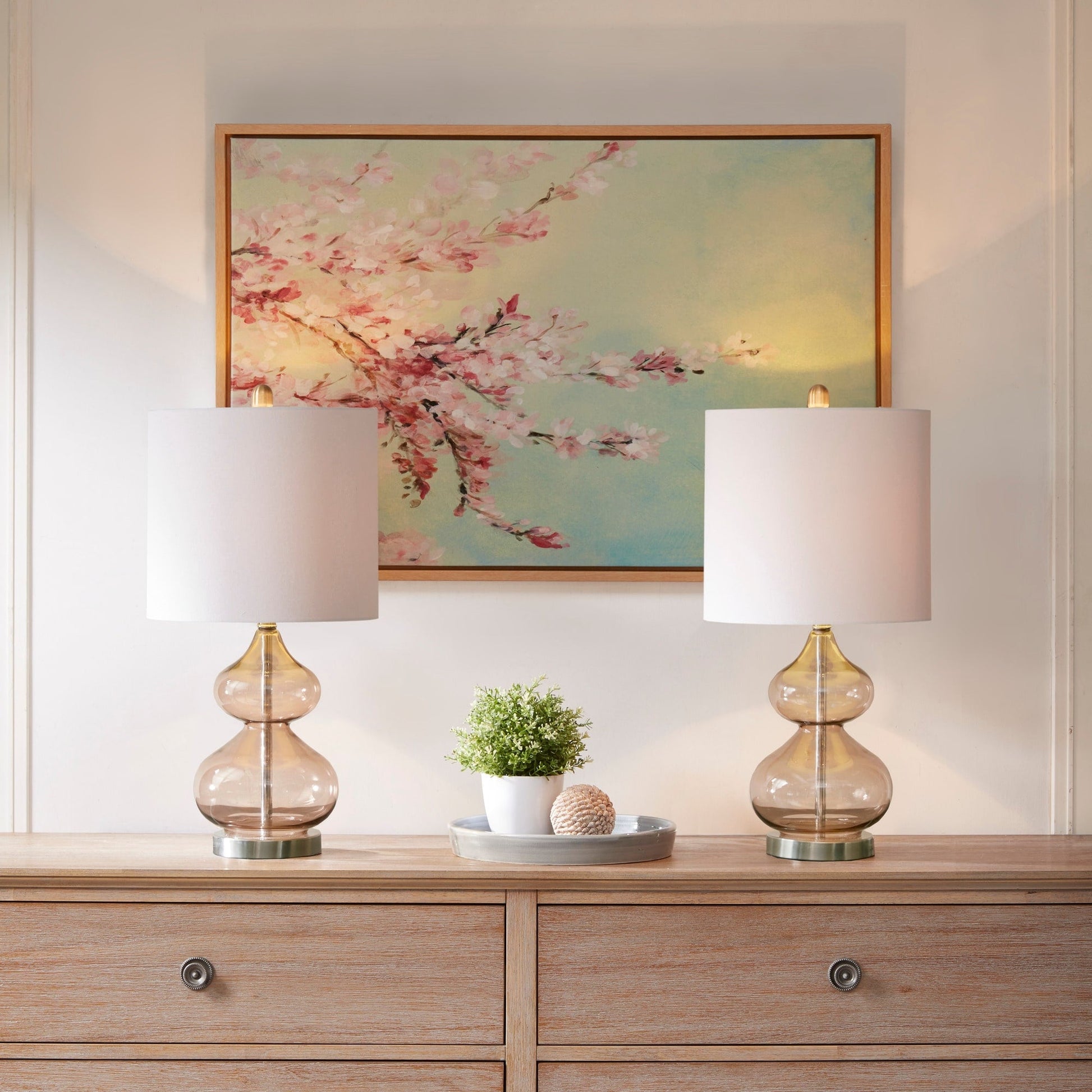 The 510 Design Ellipse Table Lamp Set brings modern elegance to any space. This set of 2 lamps features double-stacked gourd-shaped glass bases with polished surfaces and brushed gold metal accents. The translucent glass softly diffuses light for a warm, ambient glow. Each lamp is topped with a white fabric drum shade and a gold metal finial for a sophisticated touch. Designed for versatility, they provide both upward and downward lighting and include two energy-efficient 9W LED bulbs. Perfect for living rooms, bedrooms, or home offices. Spot clean only. Includes a 2-year limited warranty.