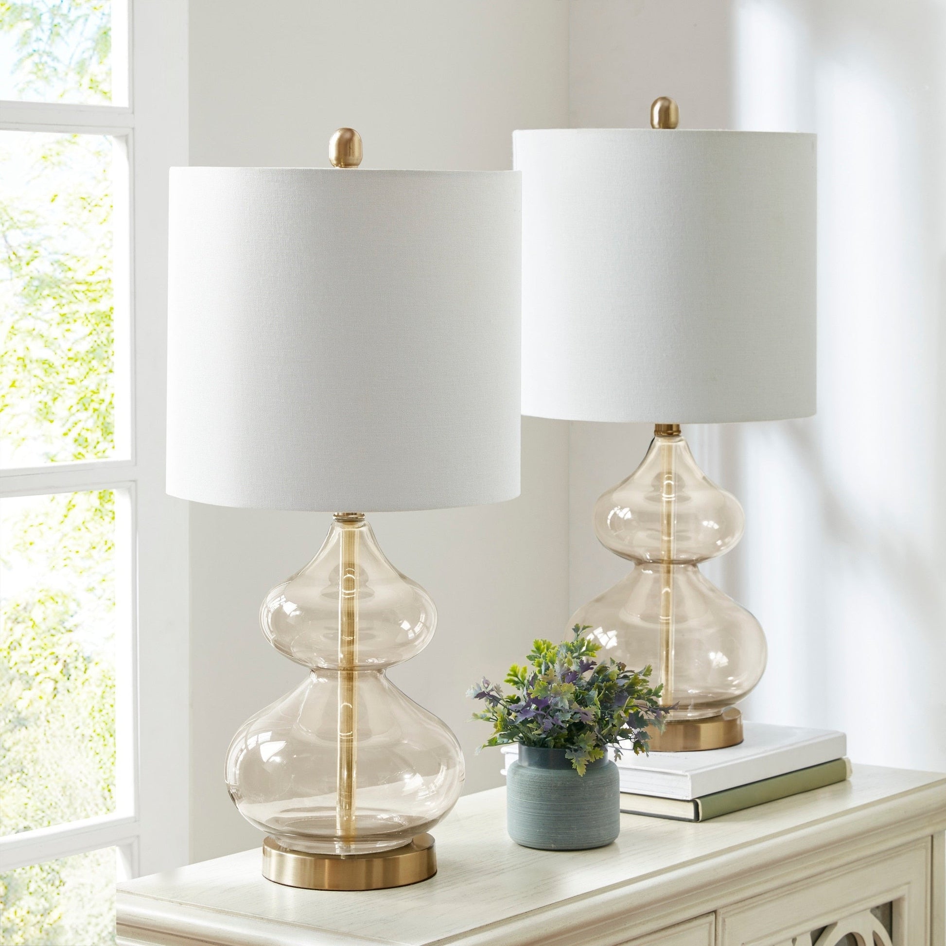 • Set of 2 table lamps with a double-stacked gourd-shaped glass base, smooth polished surface, and brushed gold metal accents for an elegant, modern look