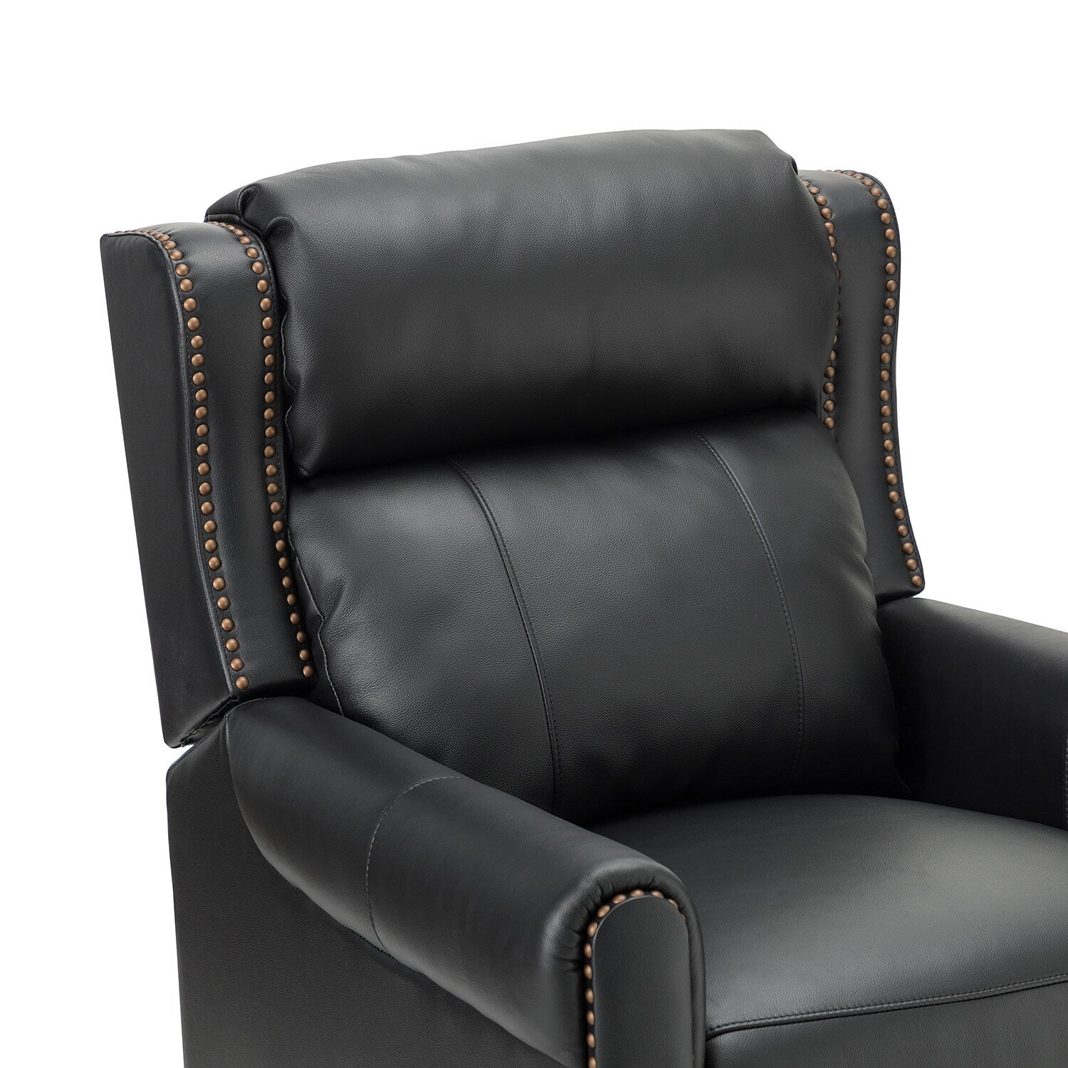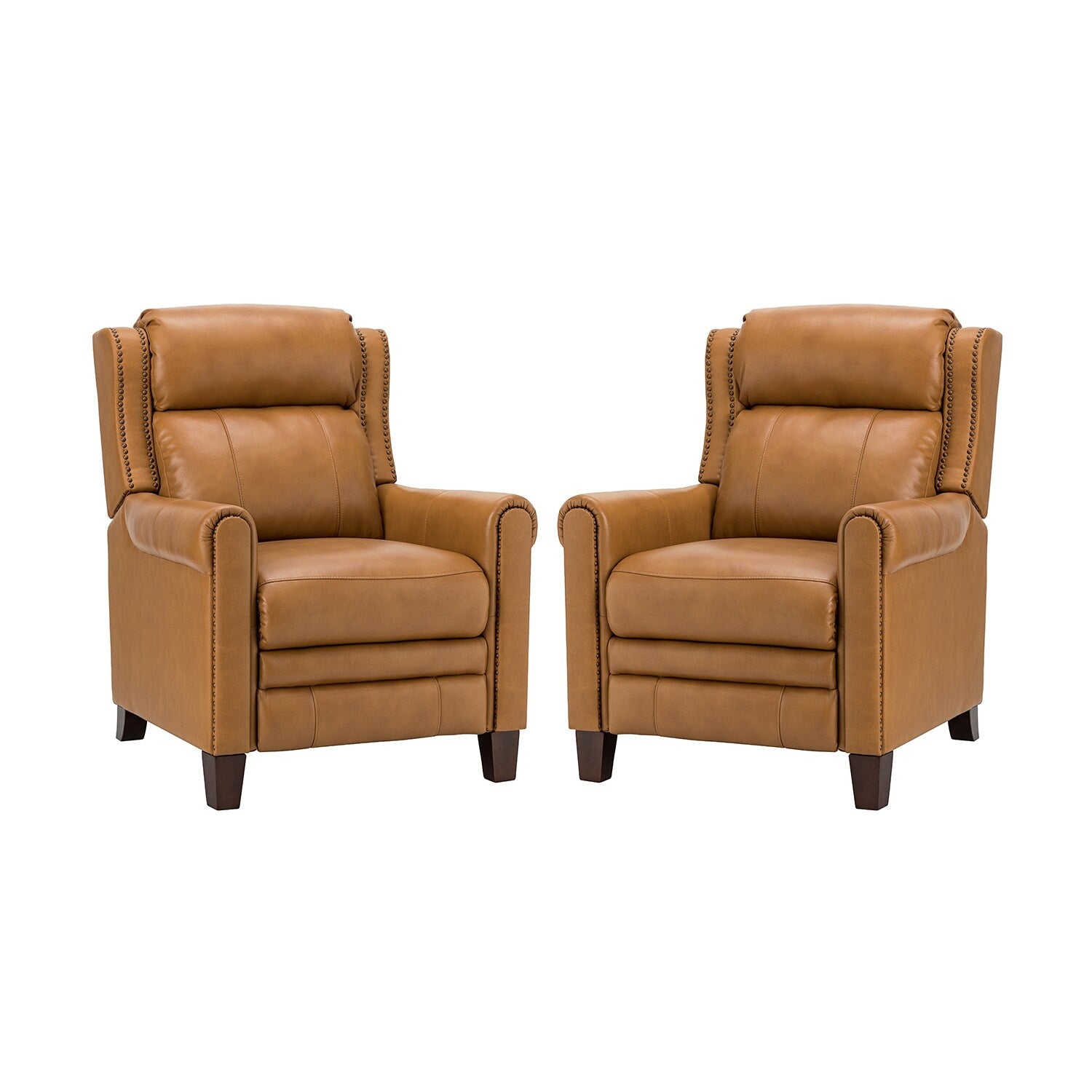 This recliner set is upholstered in luxurious premium leather for a smooth and comfortable touch. This recliner set can be manually selected to park in any position you find most comfortable, sitting, half, or fully reclining. Their sturdy wood frame is designed to support up to 250 pounds. Their nailhead trim and soft seat cushion create the ultimate relaxation and soothing treatment for your mind and body. Our exquisite craftsmanship and elegant design bring more sophistication to this recliner set. You can place them in your living room, study or office.