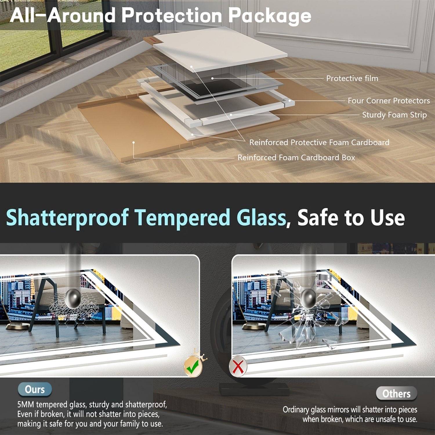 High-quality Light Strips: our LED mirror adopts 24-Volt output voltage super-bright real CRI90+ 192 LEDs/m light strips, compared with others' 12-Volt low-power light strips, which are bright enough for makeup, shaving and skin care and longer lifespan.