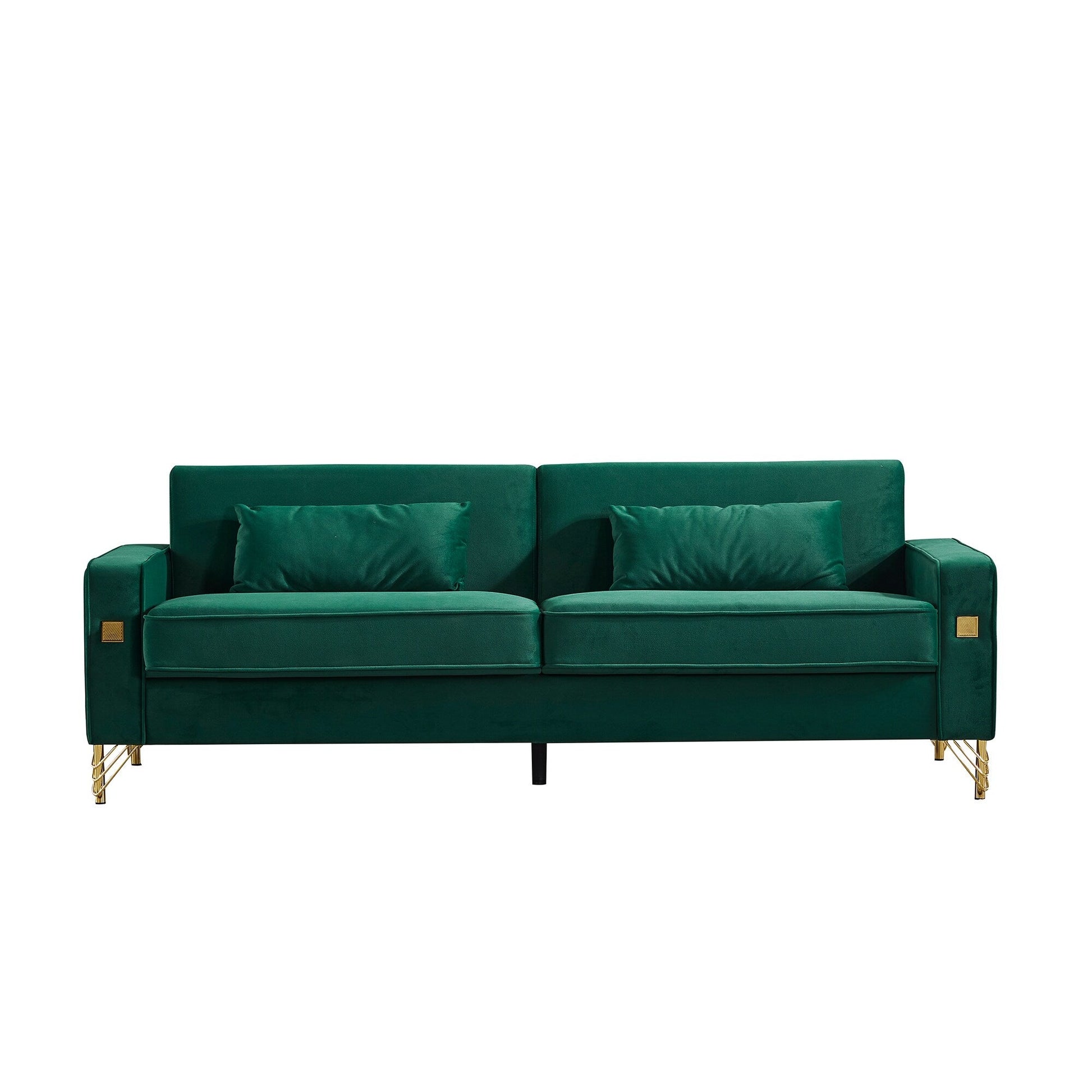 Green 85.44'' Velvet 3-Seater Sofa with 2 Pillows, Gold Metal Legs, High-Density Foam