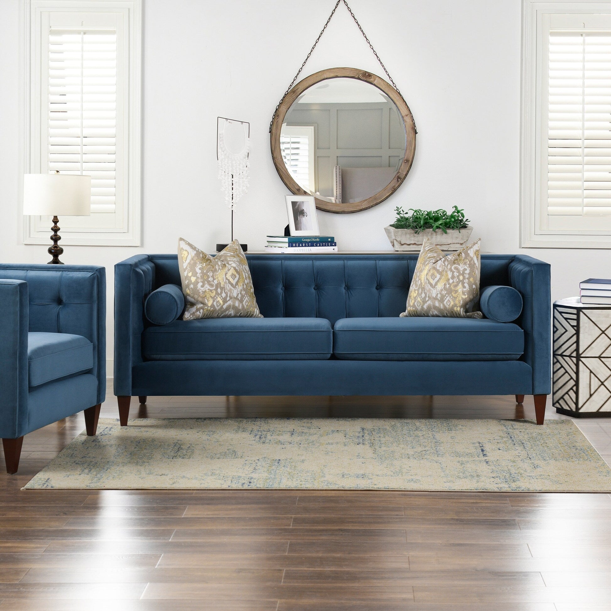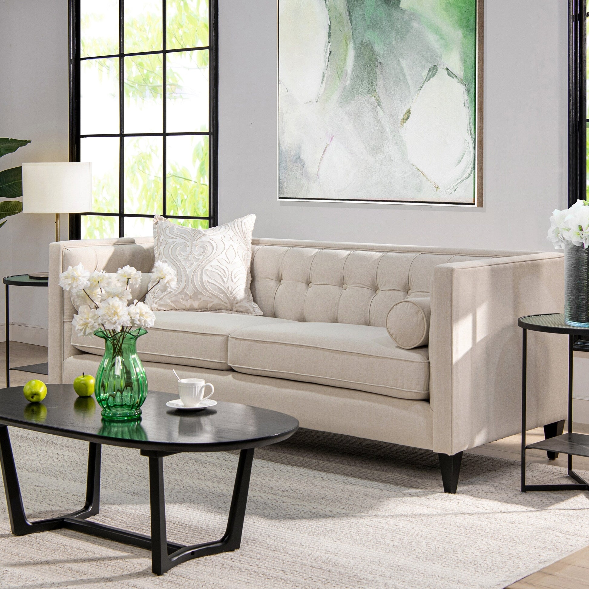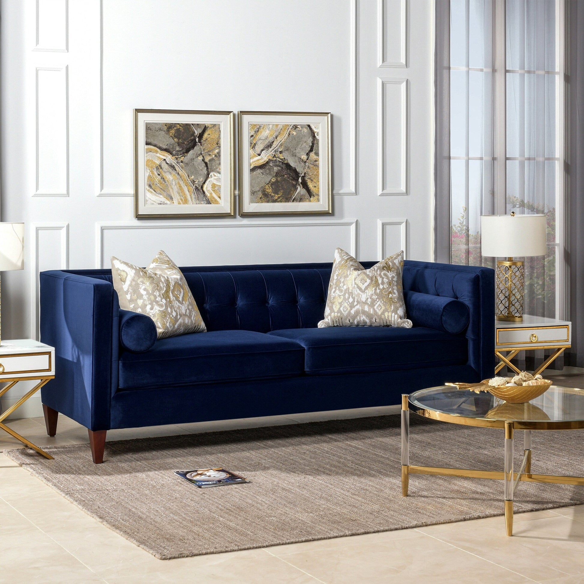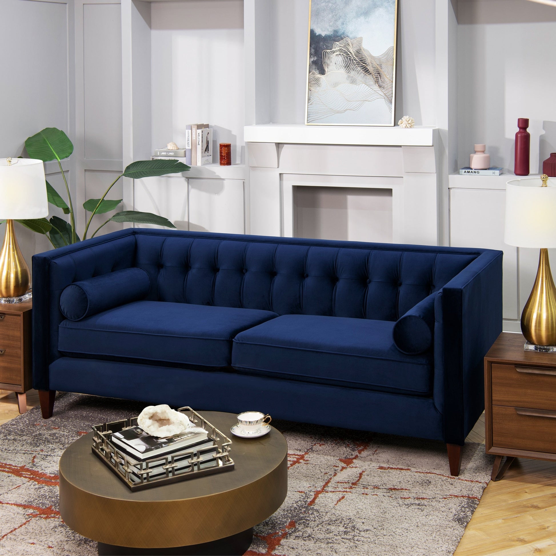 For a bold, modern statement to your living room decor, look to the Jack Seating Collection by Jennifer Taylor Home. The traditional Tuxedo silhouette gets a modern makeover in this perfectly square button tufted design, with tapered wood legs and a geometric silhouette reminiscent of the Chesterfield style. The medium-firm seat cushions are completely removable and reversible and are set off stylishly with two accent bolster pillows. Whether you're relaxing with your favorite book in the family room or entertaining guests, the Jack Seating Collection can fill any living situation with the matching set of sectional, sofa, loveseat, and armchair available.