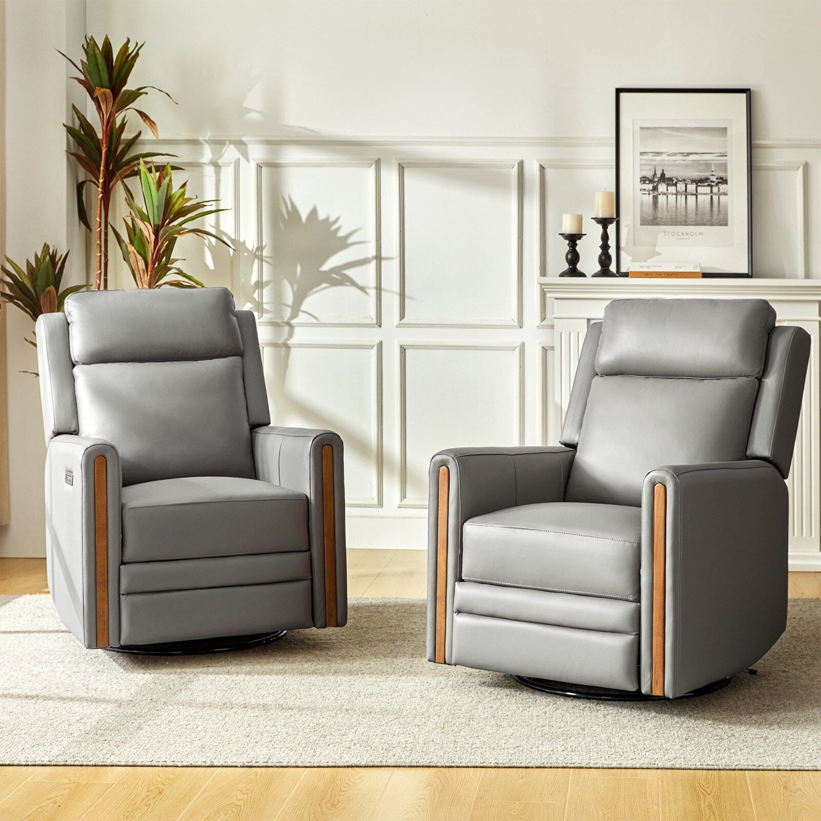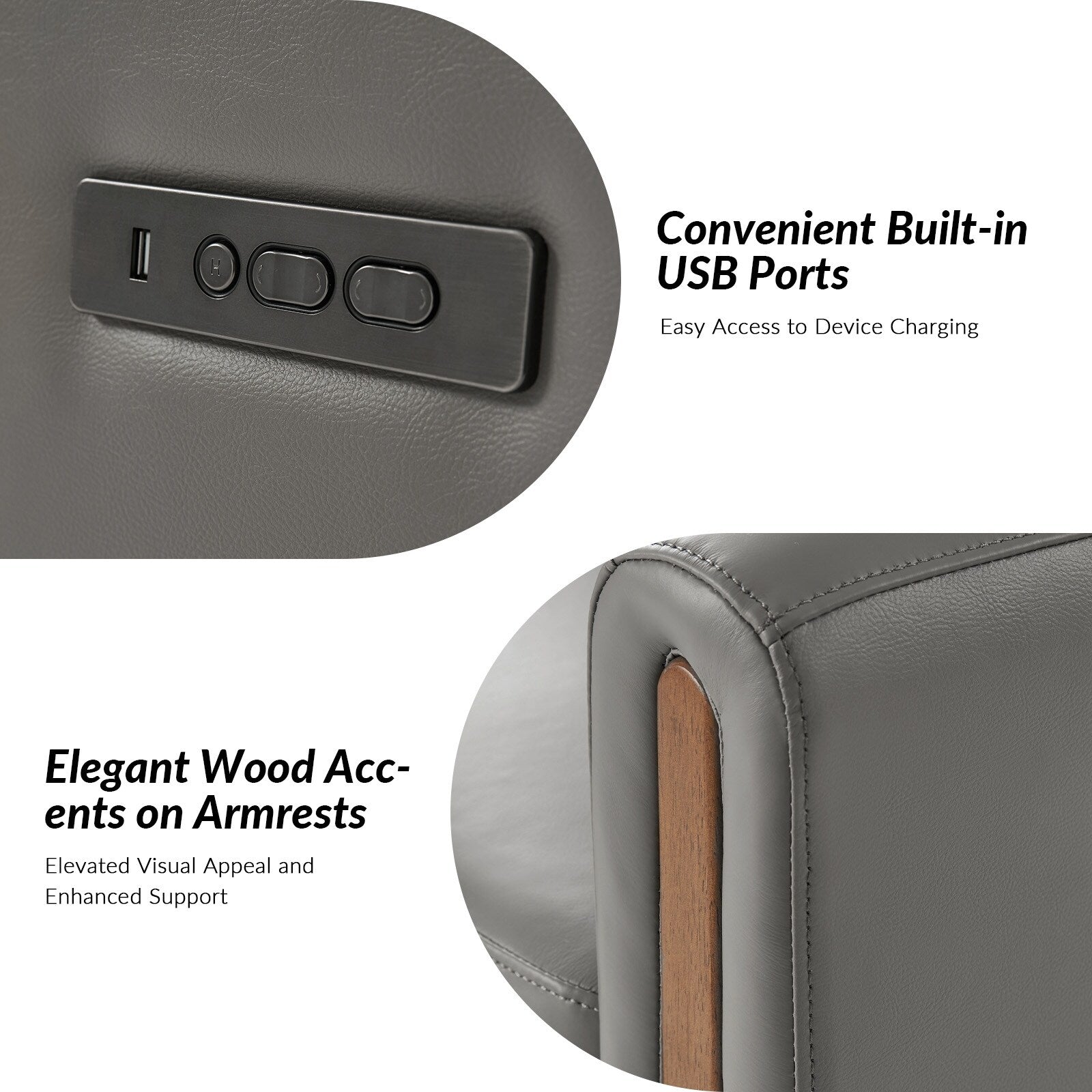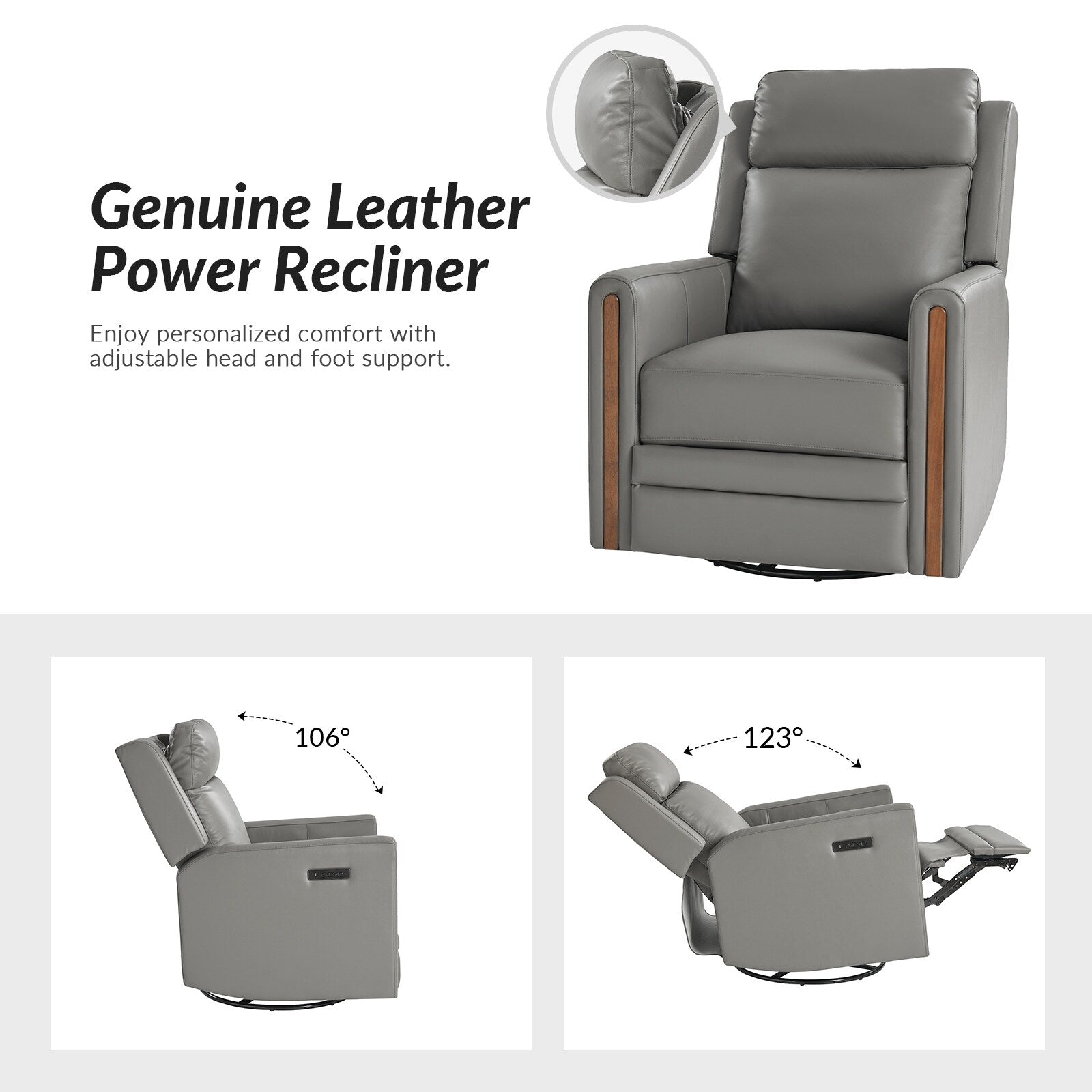 Upholstered in genuine leather, the modern power recliner set combines style with functionality, boasting a sleek and contemporary design. Enjoy the flexibility of rocking and swiveling motions, suitable for finding your preferred comfort zone. Made of ????quality genuine leather, the surface is waterproof, ensuring effortless cleaning and maintenance, while solid wood accents on the armrests are durable and exude the beauty of natural timber. Tailor your comfort with adjustable headrest and footrest ????positions, easily reset with just one touch for added convenience. Stay connected with the built-in USB charging port, keeping your devices powered up while you relax. Whether you're lounging after a long day or entertaining guests, this power recliner ????set offers a blend of sophistication and comfort for your modern living space.