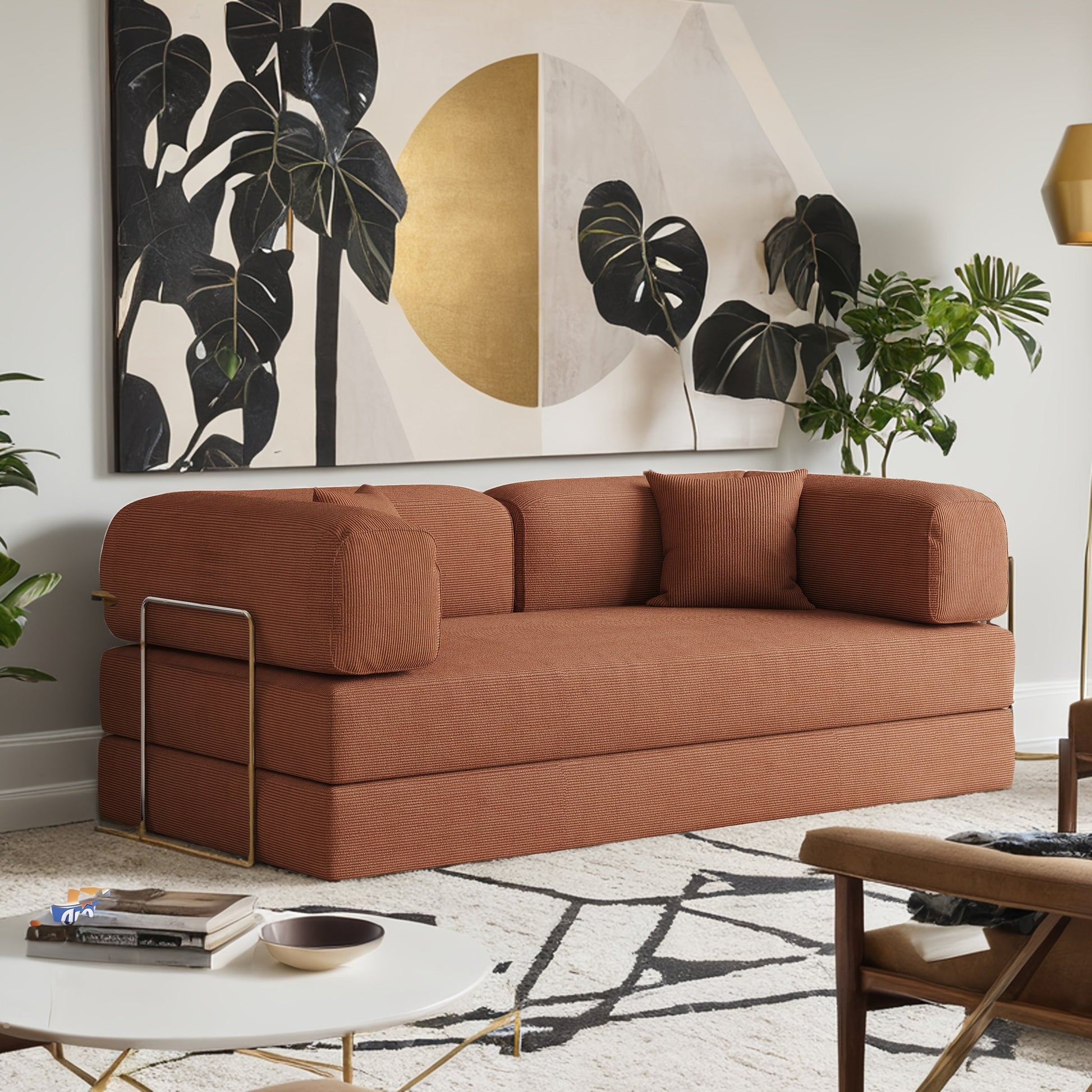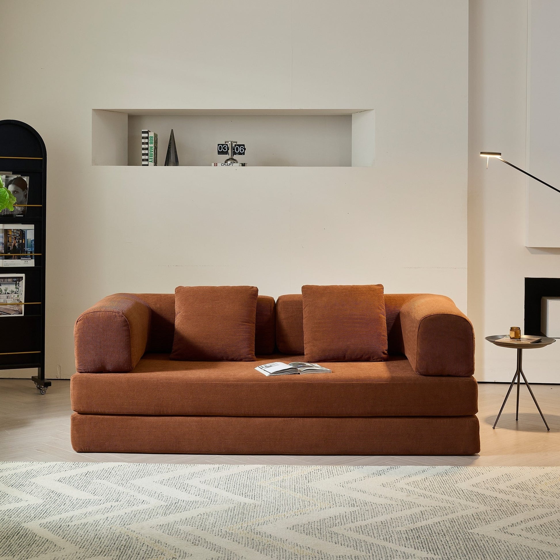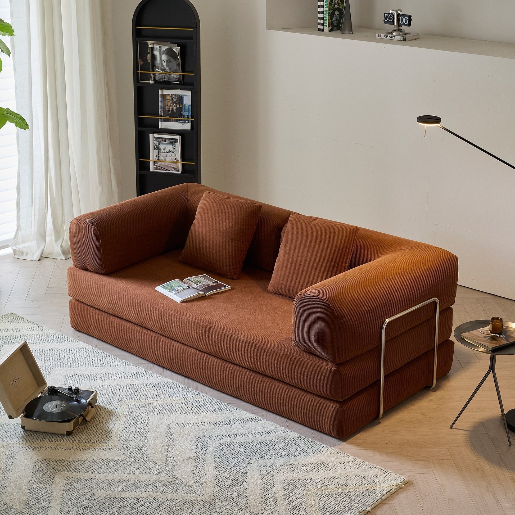 Elevate the aesthetic of your living room or lounge with this solid color convertible sofa bed, designed to impart a sleek and minimalist charm to your home. Crafted with a stainless steel back frame for durability, enveloped in plush corduroy fabric, and padded with 3D high rebound sponge, this sofa promises both style and comfort. The soft cushions coupled with high-density sponge filling ensure a luxurious seating experience. Perfect for any living space, this sofa transforms effortlessly to meet your needs, blending functionality with modern design.