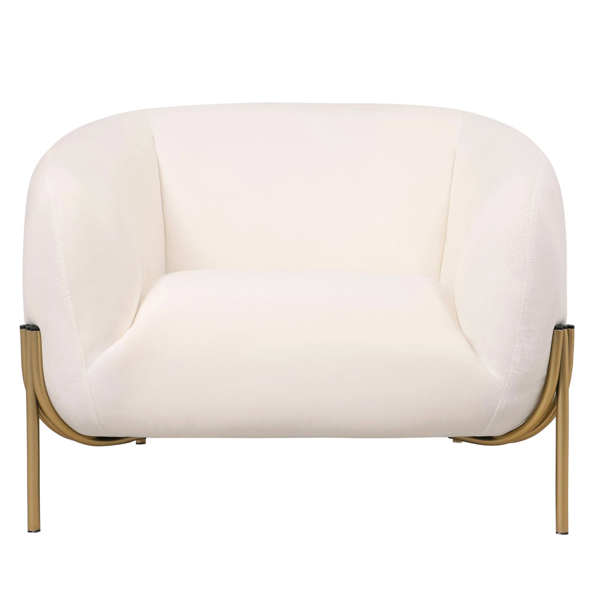Elegant Design This accent chair features a continuous design with a curved backrest, armrests, and seat connected smoothly without visible breaks. The elegant structure is supported by a reinforced gold metal base, which connects the seat to the legs for added stability. The base also includes rubber components at the top, which act as a protective buffer to reduce friction and prevent wear on the upholstery.