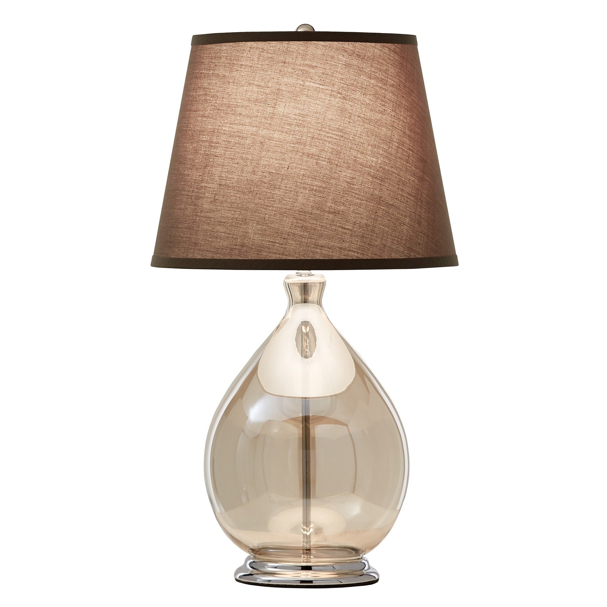 This Glass Table Lamp is a perfect addition to your space. With its plated nickel base and chic glass body, this lamp is sure to add a touch of luxury to any room. The tinted glass paired with an amber brown shade makes this lamp a must-have for any modern home. Whether used as a light source for your reading needs or as a beautiful accent, this lamp is sure to make a statement.