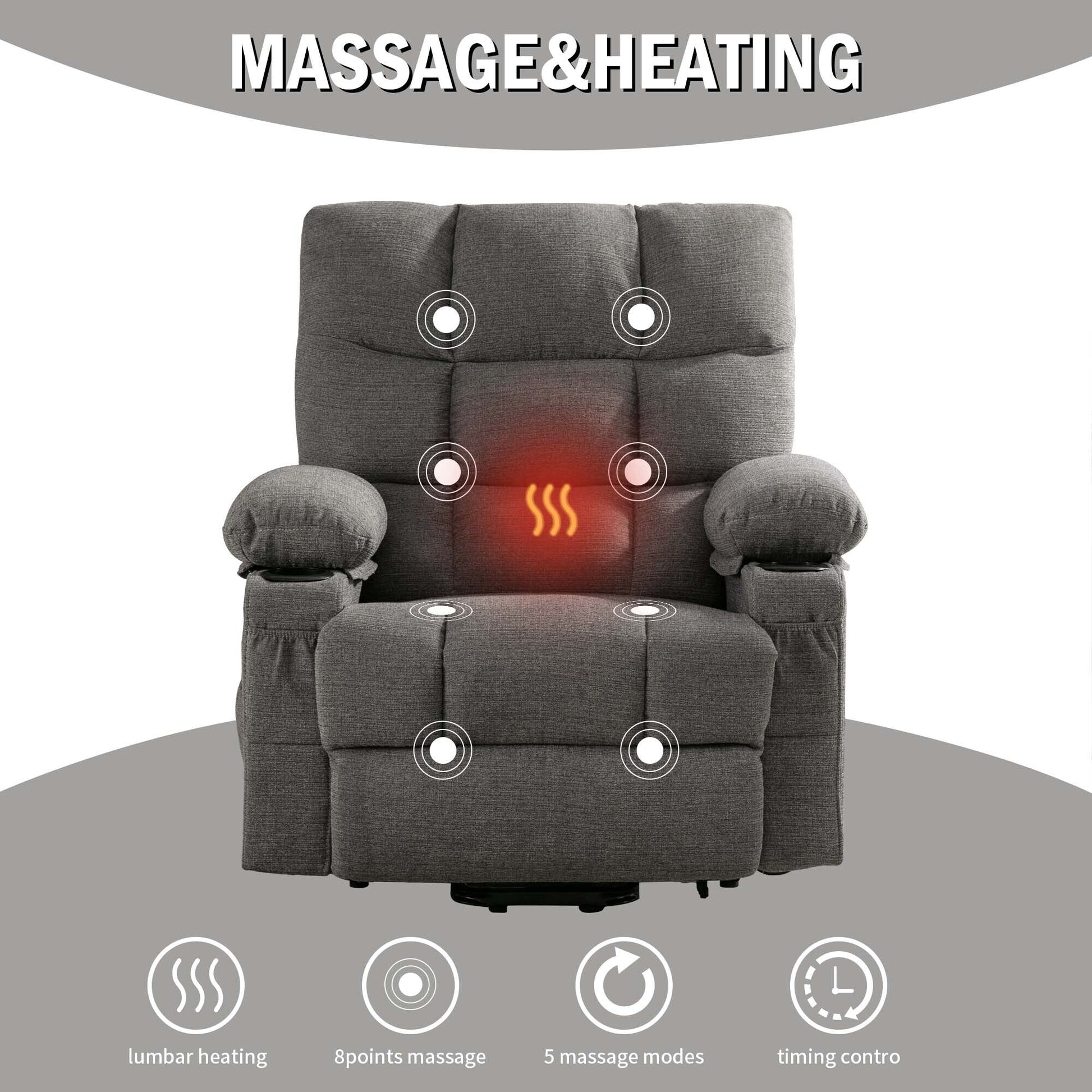 Linen Power Lift Recliner Chair with Massage and Heat, Side Pockets, USB Charge Ports
