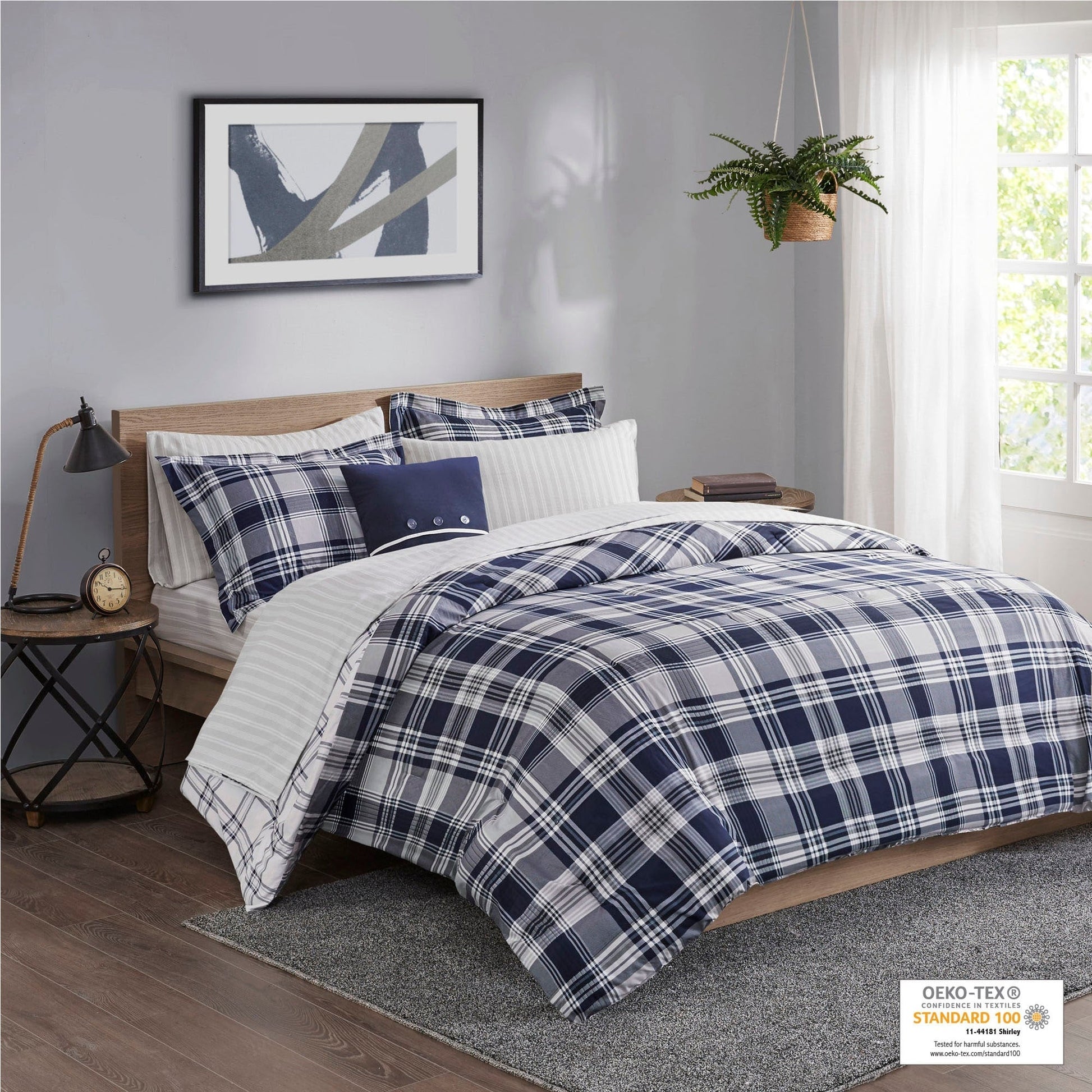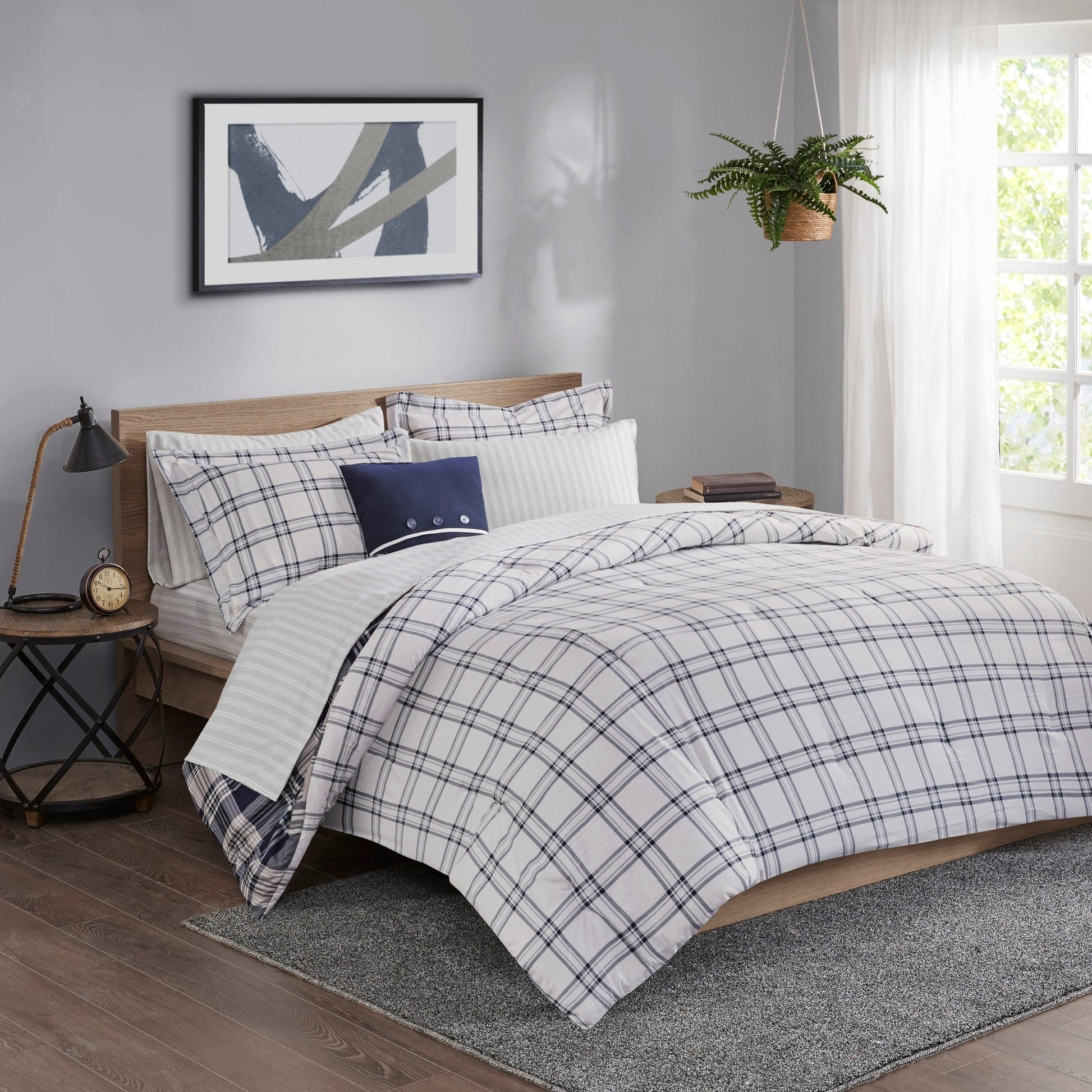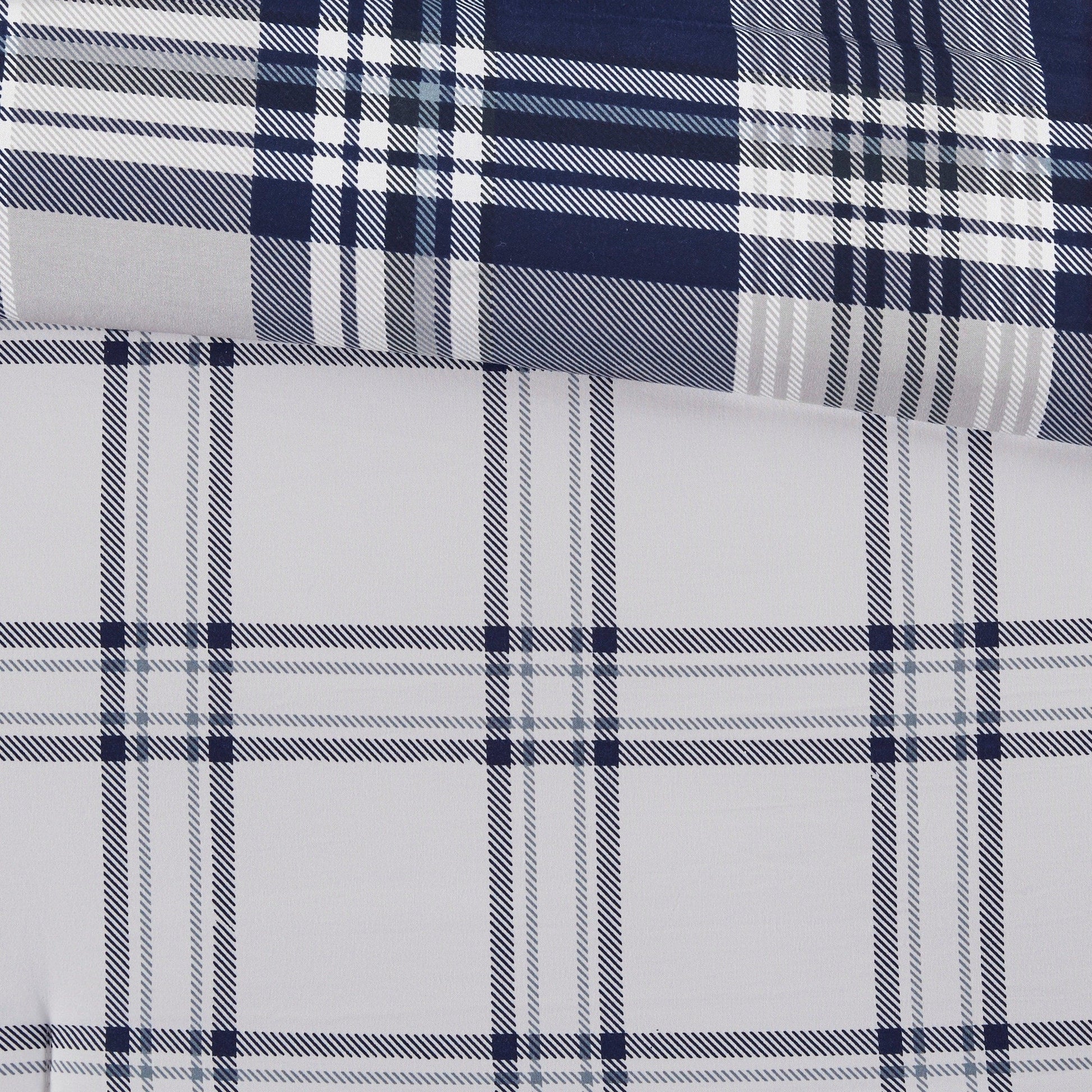 Restyle your bedroom with the Madison Park Essentials Paton Reversible Comforter Set with Sheet Set. The reversible comforter and shams (1 in Twin Sizes) feature a navy plaid print on the face and a white plaid print on the reverse, for a charming casual look. A coordinating square decorative pillow adds a finishing touch to the comforter. Also included is a grey sheet set, complete with a flat sheet, fitted sheet, and 2 pillowcases (1 for Twin Sizes). Bringing the best in health and wellness, this bedding set also features an anti-microbial treatment that provides built-in freshness protection, reducing the growth of odor causing bacteria and keeps fabric lasting longer.