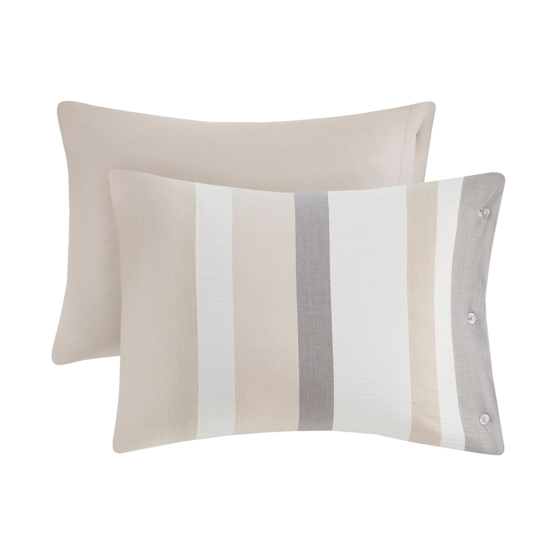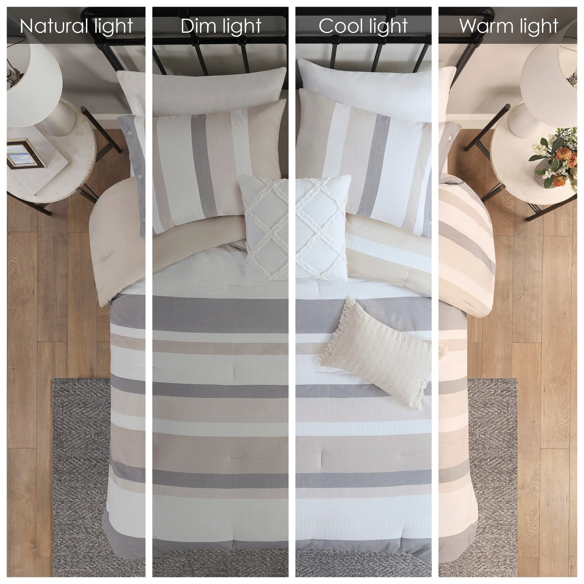 Refresh your bedroom with the casual charm of Madison Park's Levi 5 Piece Jacquard Comforter Set. The jacquard comforter features a striped design for an updated casual look. The matching shams pair handsomely with the farmhouse-inspired comforter, while an oblong and a square decorative pillow add textural elements to the comforter set. Hypoallergenic polyester filling in the comforter and pillows provides exceptional warmth and comfort all through the night. Machine washable for easy care, this jacquard comforter set has an antimicrobial treatment that provides built-in freshness protection, inhibits growth of odor causing bacteria, and keeps the fabric newer, longer. Bedding may come in rolled or compressed packing and will need to be fluffed up. Use a steam iron to help remove wrinkles easier.