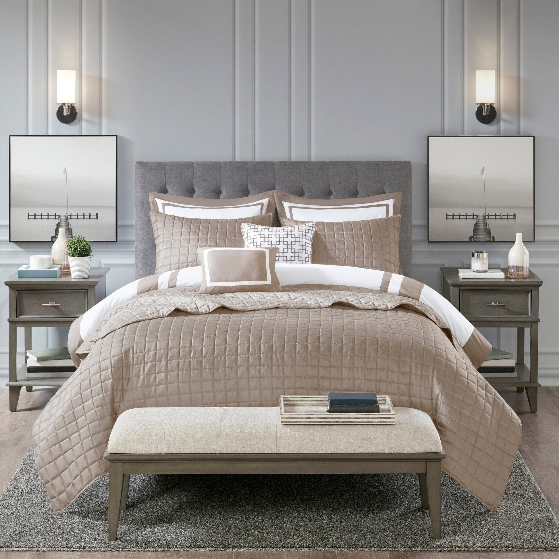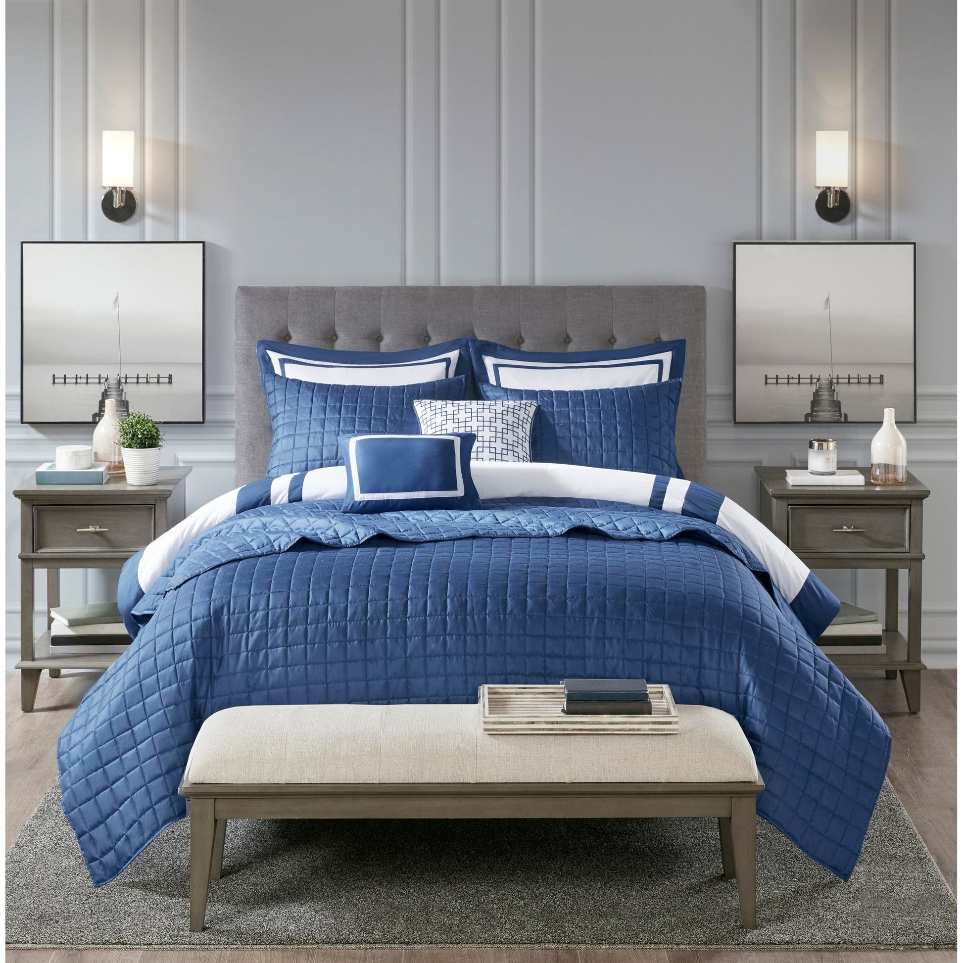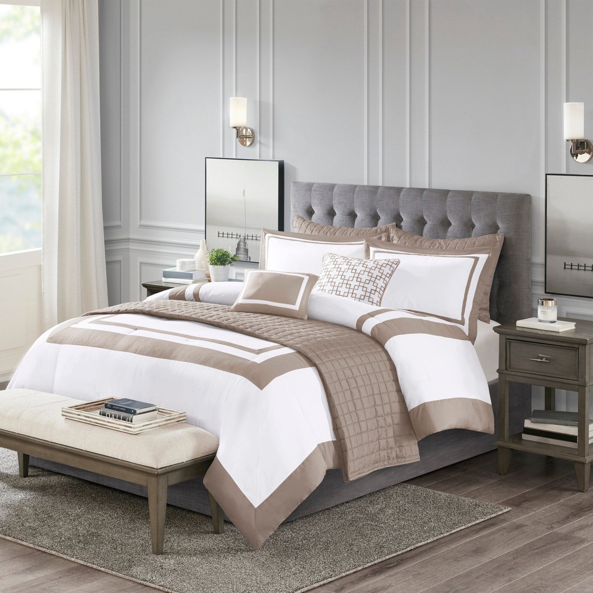 This hotel bedding collection includes a bold bordered comforter and window pane quilt that both come with matching shams to complete a luxurious layered look. Two decorative pillows with embroidered and pieced details provide the perfect finishing touches to this 8 piece bedding set.