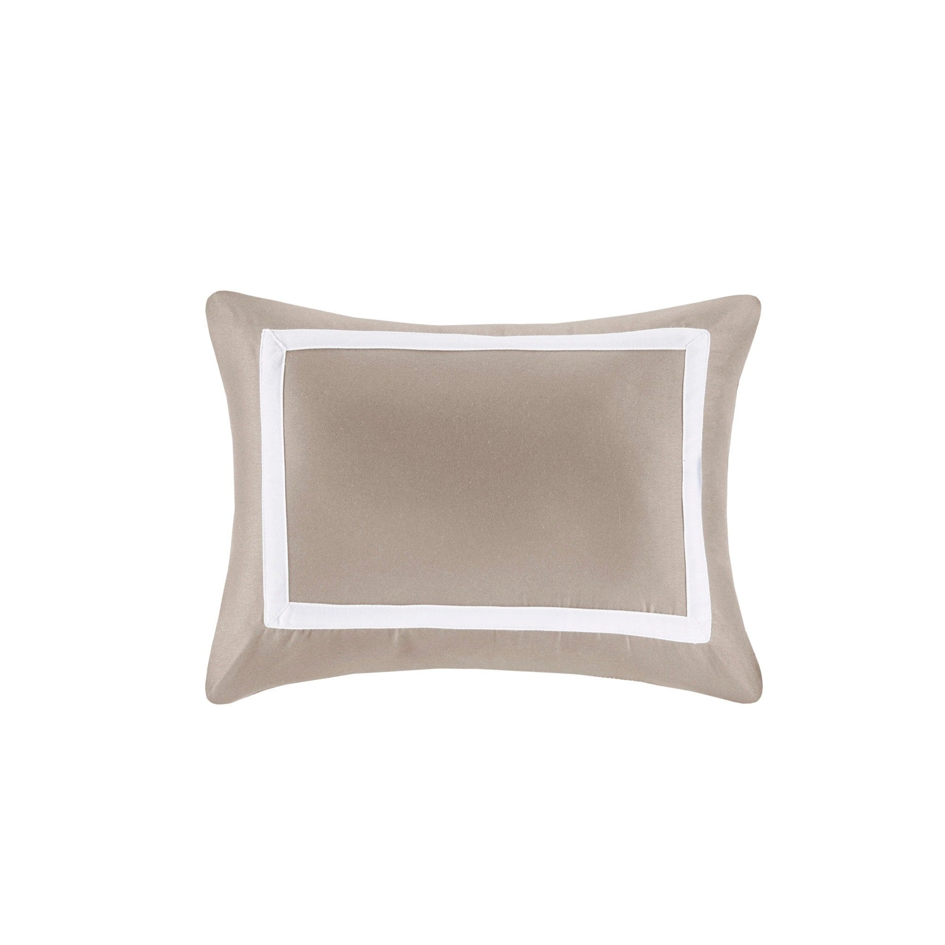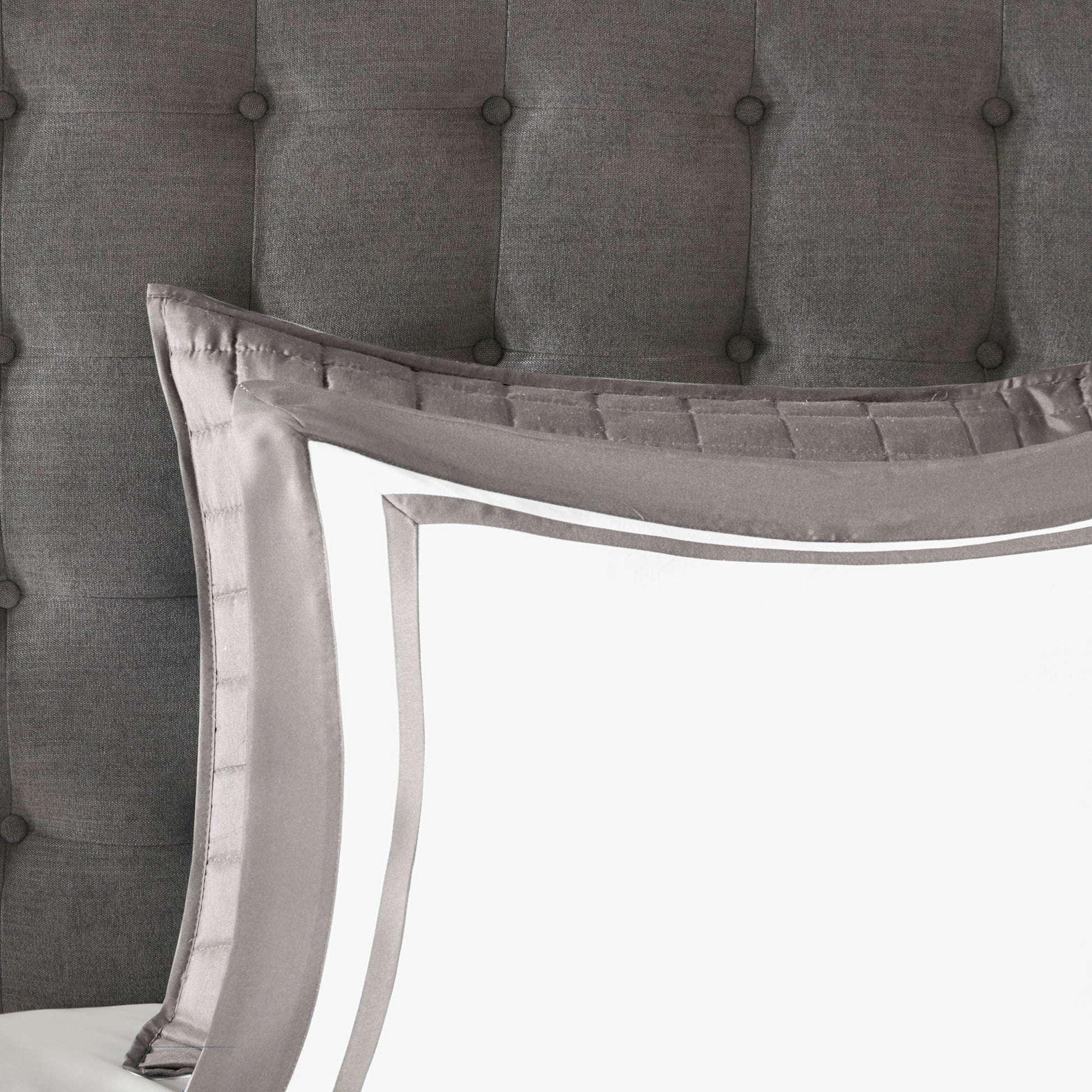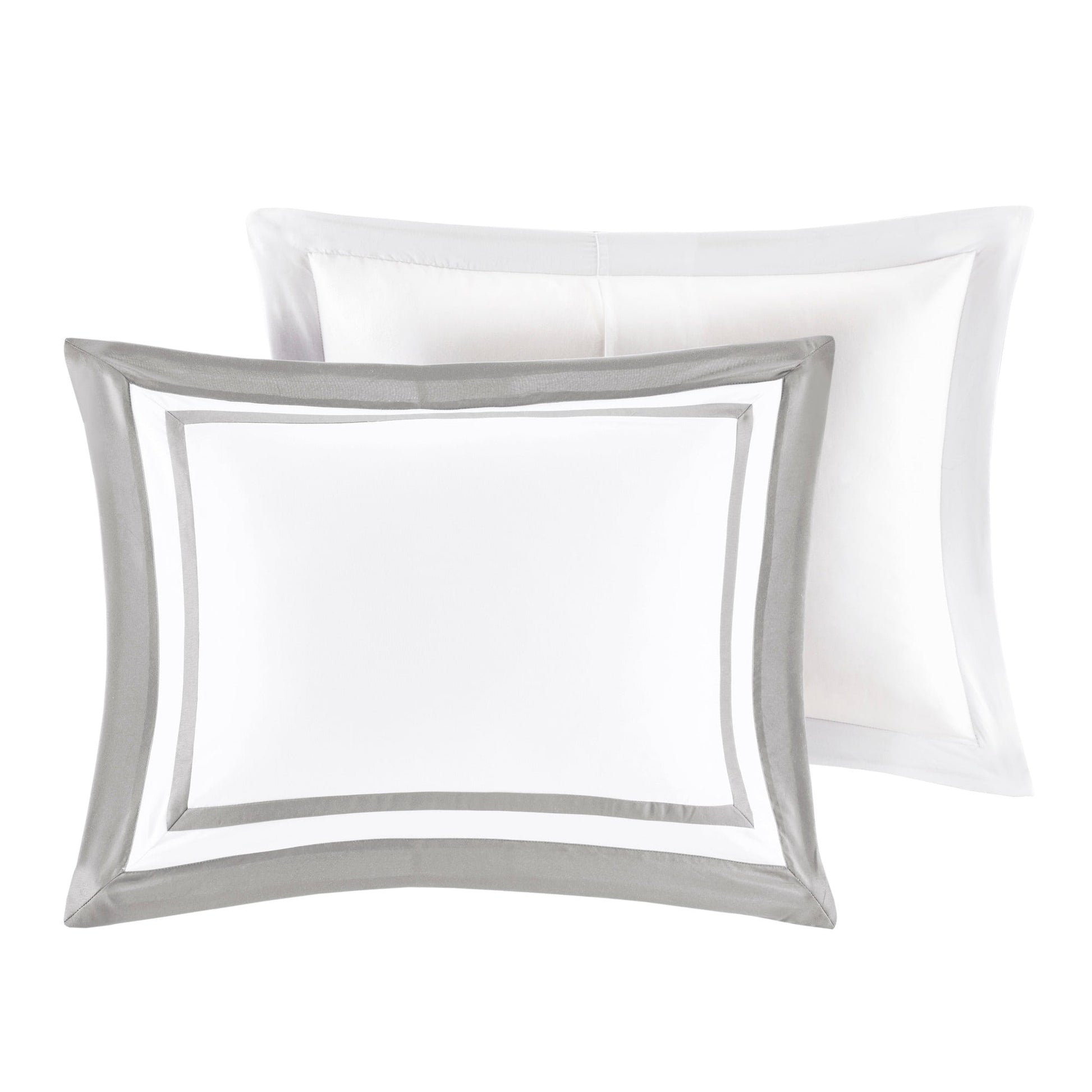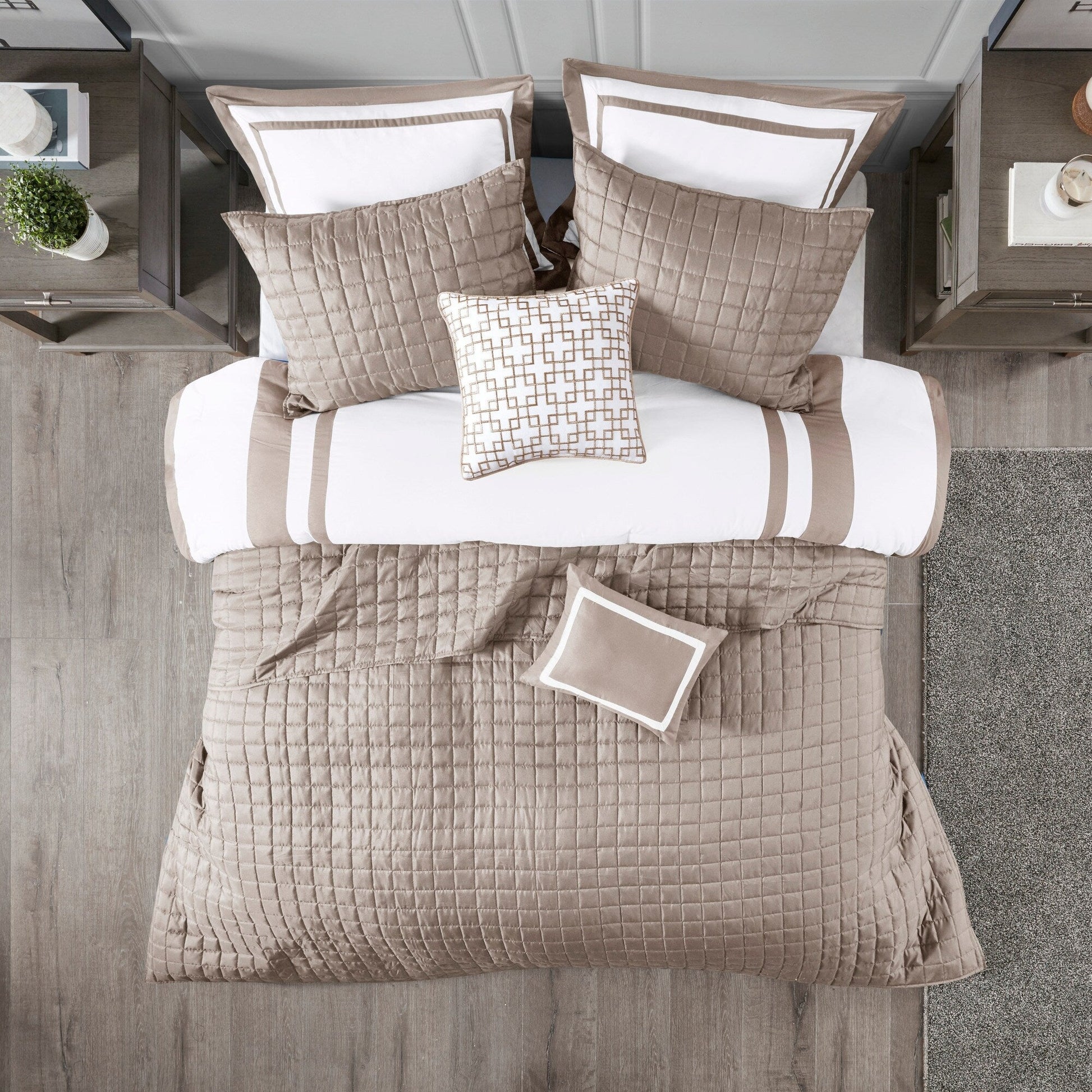 This hotel bedding collection includes a bold bordered comforter and window pane quilt that both come with matching shams to complete a luxurious layered look. Two decorative pillows with embroidered and pieced details provide the perfect finishing touches to this 8 piece bedding set.