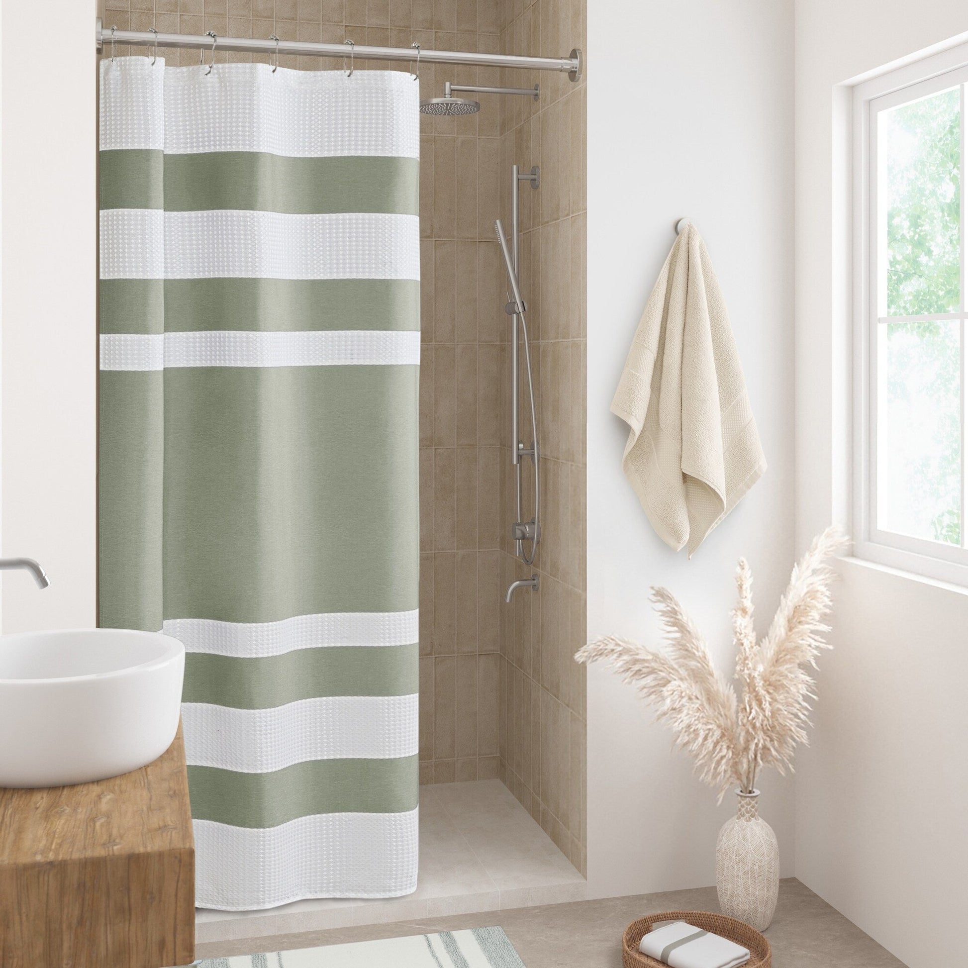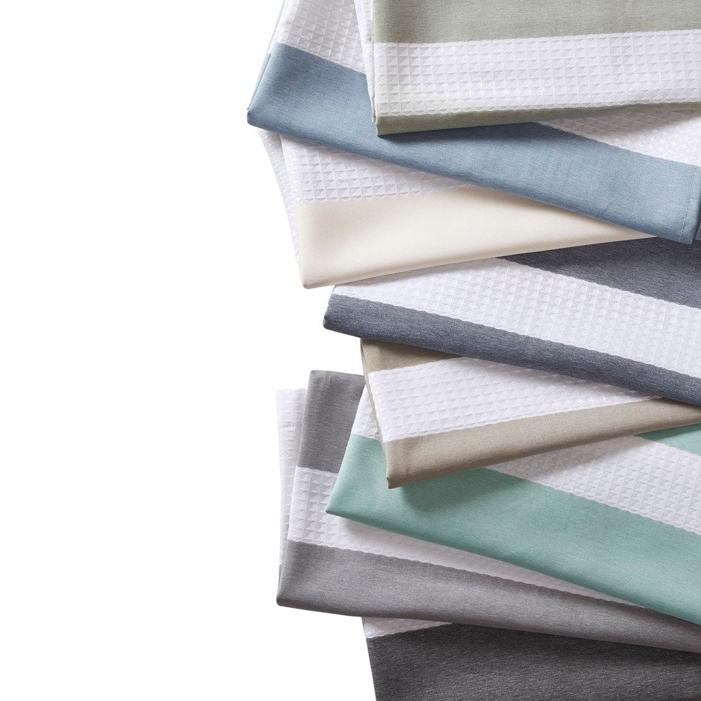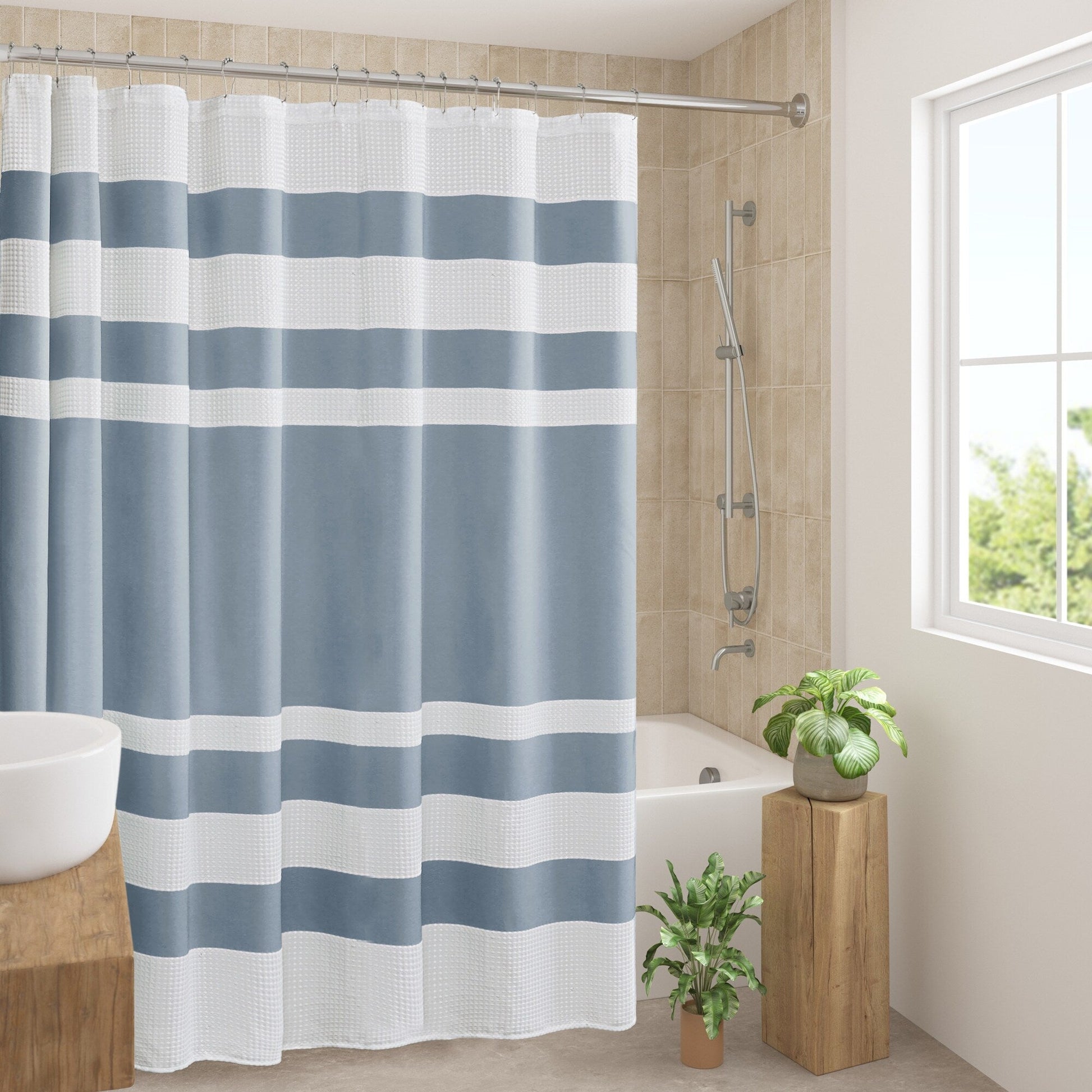 Experience a spa-like ambiance in your bathroom with the Madison Park Spa Waffle Shower Curtain. Made of durable polyester with a waffle weave base fabric, this modern contemporary stripe shower curtain features a chic color block and stripe design in multiple color options to match any bathroom decor. The 3M Scotchgard water repellent treatment ensures easy maintenance, while various sizes provide a perfect fit for any bathroom space. Please note that hooks, rod, and water repellent liner need to be purchased separately.