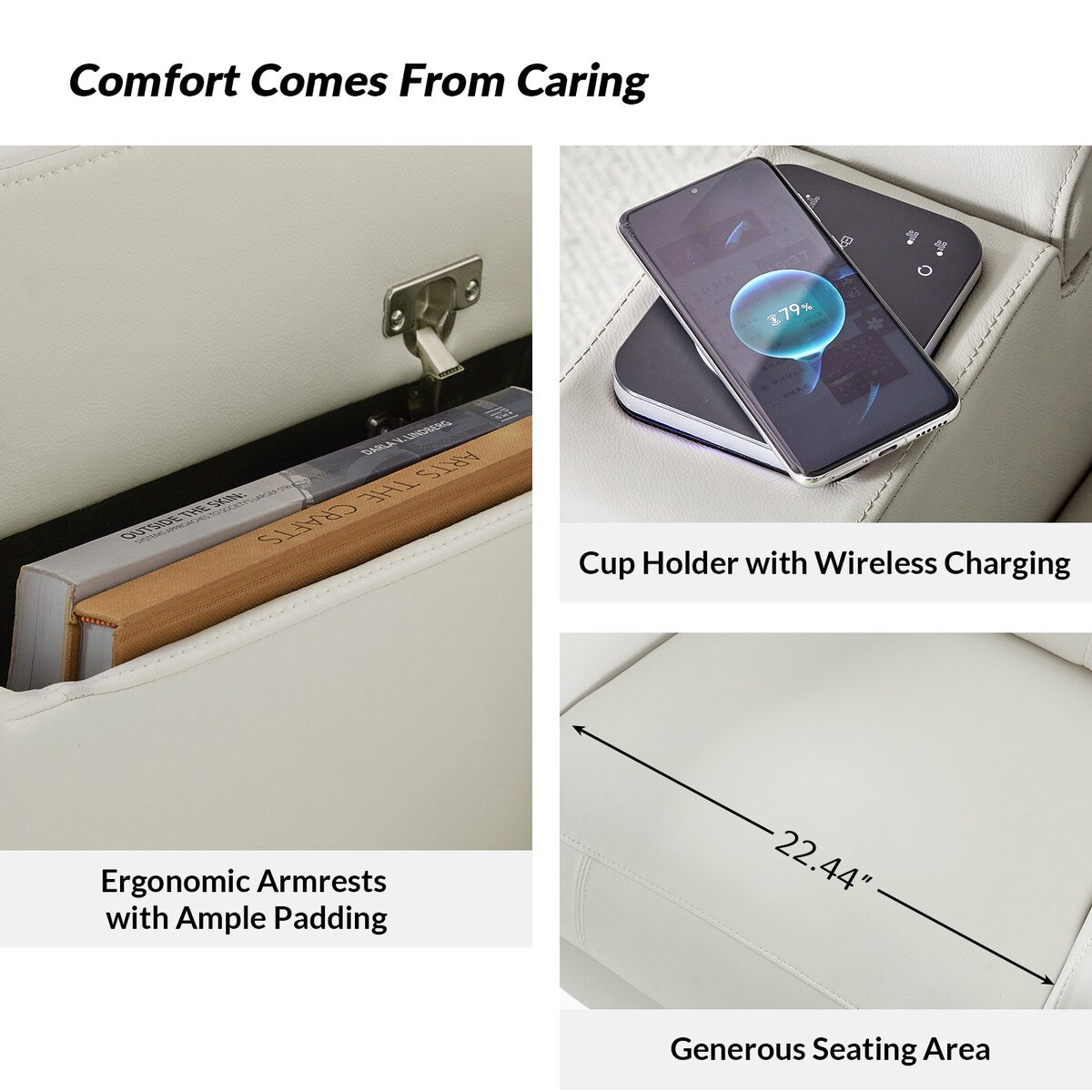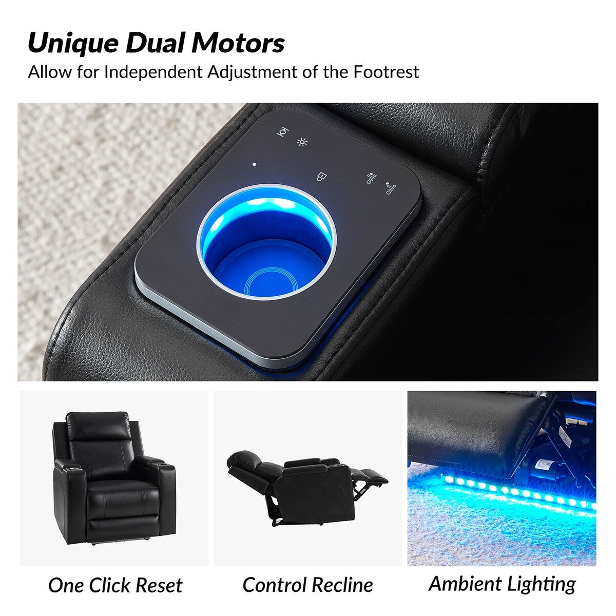 Presenting this?traditional style power recliner?upholstered in?advanced textile materials. Experience comfort with?integrated cup holders, touch-sensitive controls, and convenient lift-up?functions that double as?wireless chargers. Customize your seating experience with?adjustable seat positions, including a?one-touch reset and position lock?feature. Enhance your ambiance with?built-in ambient lighting?located beneath the seat and on the right armrest. Stay organized with?storage space in the armrests, complete with a cup holder on the left side for added convenience. With its spacious design and?extra-wide seat, relaxation has never been more inviting. Upgrade your leisure experience with this?classic power recliner, where comfort meets innovation.
