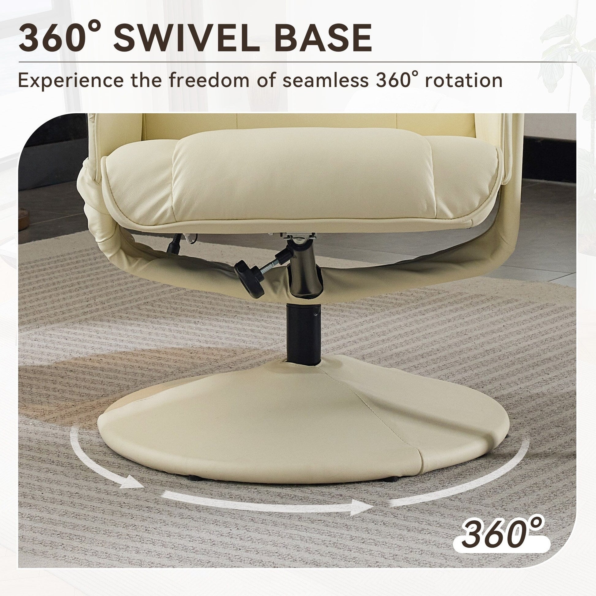This recliner chair with ottoman is a true haven of comfort and relaxation. It offers a luxurious experience with its advanced massage system and customizable backrest adjustment. The high-quality materials ensure durability and softness, making it a perfect choice for both home and office. The chair's sleek design blends seamlessly into any decor, adding an elegant touch. Whether you need to unwind after a long day or simply enjoy some leisure time, this chair provides the ultimate comfort and support.Overall Product Dimensions: 29.53' W x 31.3' D x 42.13' H (upright), 29.53' W x 42.13' D x 38.19' H (recliner), Ottoman Size: 18.11' W x 15.55' D x 16.34' H, Weight: 39.6 LBS. Weight Capacity: 250 LBS.Package Dimensions: 30.91'L×22.83'W×16.14'H, Weight:44 LBS.Comfortable Function: The recliner chair with ottoman elevates comfort with a remote-controlled massage system, 3 positions for massaging of back, lumbar and thighs, 5 vibration massage modes, and equipped with timing settings and seat heating. The massage strength adjustable from weak to strong through change massage mode and node.Smooth Swivel Adjust: Our modern recliners allow you to enjoy seamless 360° rotation and customize your relaxation with a backrest with a maximum backward adjustment tilt to 140° is easy to use. Whether at home or in the office, it offers exceptional relaxation and is perfectly suited to meet your needs.Luxurious Fabric: Our reclining chair is upholstered in high-quality PU leather, which is not only soft to the touch but also easy to clean—just a light wipe with a damp cloth is all it takes to keep it looking new. The high-density foam cradles your body, delivering unparalleled comfortDurable Structure: Our chair with ottoman set is constructed with a wood base and reinforced with a iron gas rod, ensuring long-lasting stability you can rely on. The recliner and ottoman are fitted with non-slip pads at the bottom to prevent sliding, providing a comfortable and secure seating experience.Versatile Use: Ideal for a variety of settings, including living room, leisure area, office and study. Whether you're reading, watching TV, or taking a break at work, this chair ensures you enjoy a relaxing and pleasant experience.