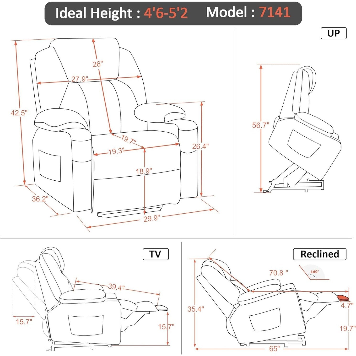 • Specialized for Petite People: The right-sized chair will be as perfectly-sized as your shadow. This lift chair is specifically tailored for users whose height is 4'6'-5'2'. The chair's sitting width, seat depth and sitting height will fit your body height.