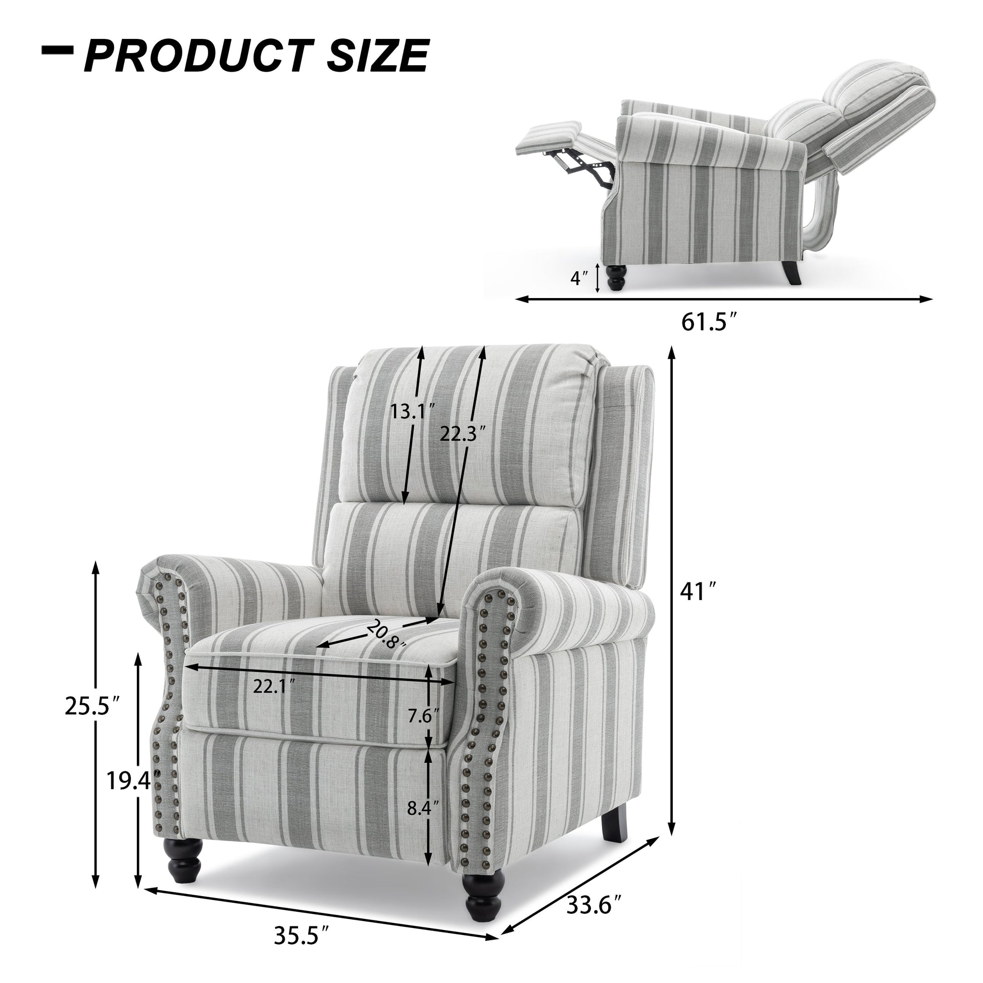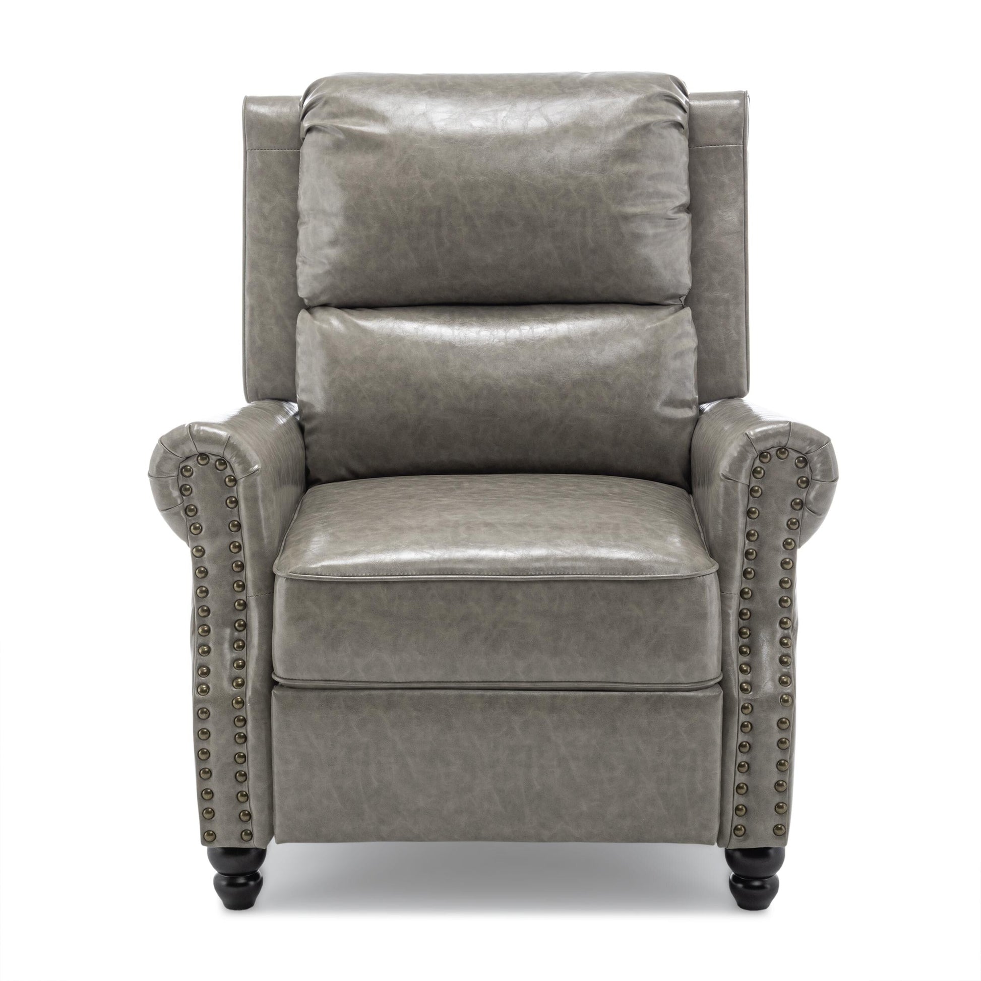 Relax in style with this manual pushback recliner, designed for ultimate comfort and functionality. Whether you're sitting, watching TV, or napping, its adjustable reclining modes let you find your perfect position. Crafted with faux leather upholstery, it's not only luxurious and easy to clean but also resistant to spills and wear. A combination of a sturdy wood and metal frame with a spring-cushioned seat ensures durability and support. The ergonomic design provides lumbar support, easing back strain, while the padded armrests and vintage-inspired nailhead trim add a touch of charm. Perfect for living rooms, bedrooms, or home offices, this chair blends style with everyday practicality.