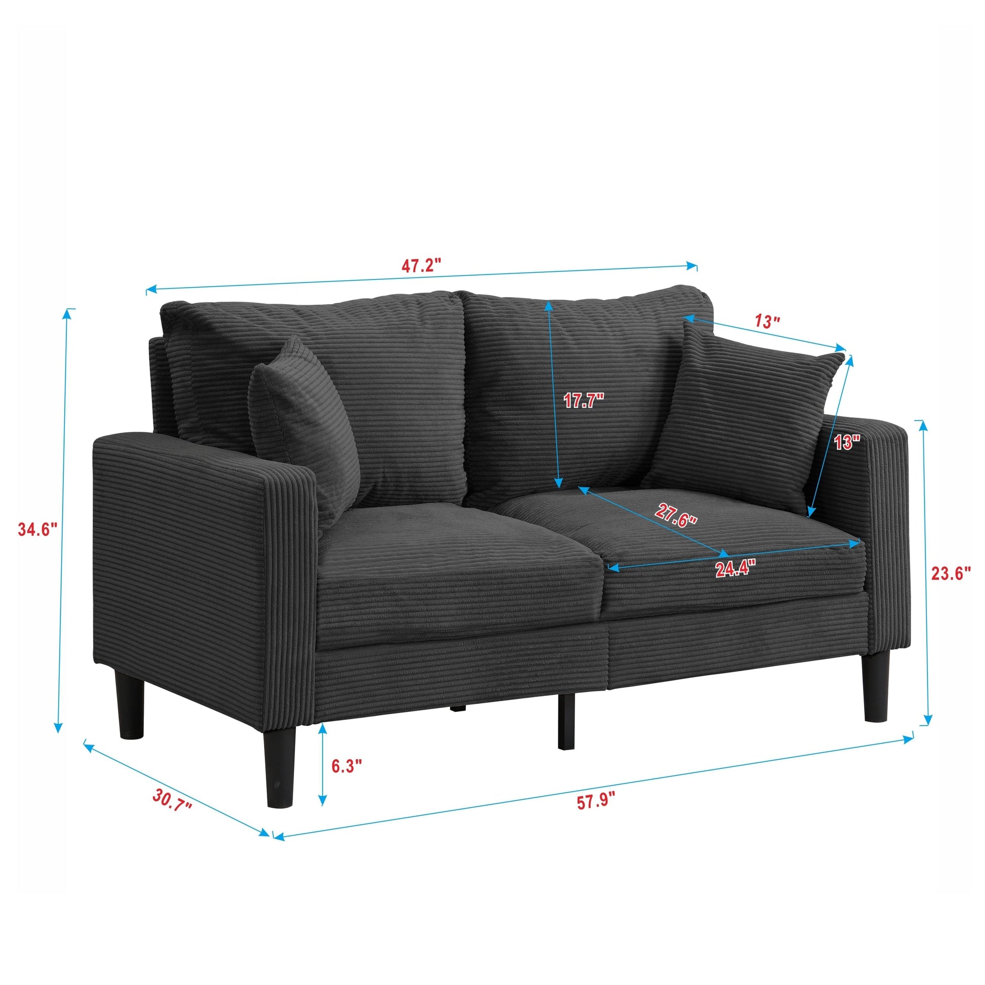 • Designed for small spaces, this 57-inch loveseat is a great choice for maximizing living areas. With soft cushioning, ergonomic design, and included pillows, it offers a comfortable seating experience. The sturdy wooden frame ensures durability and support, making it a versatile addition to living rooms, bedrooms, offices, apartments, or dorms.