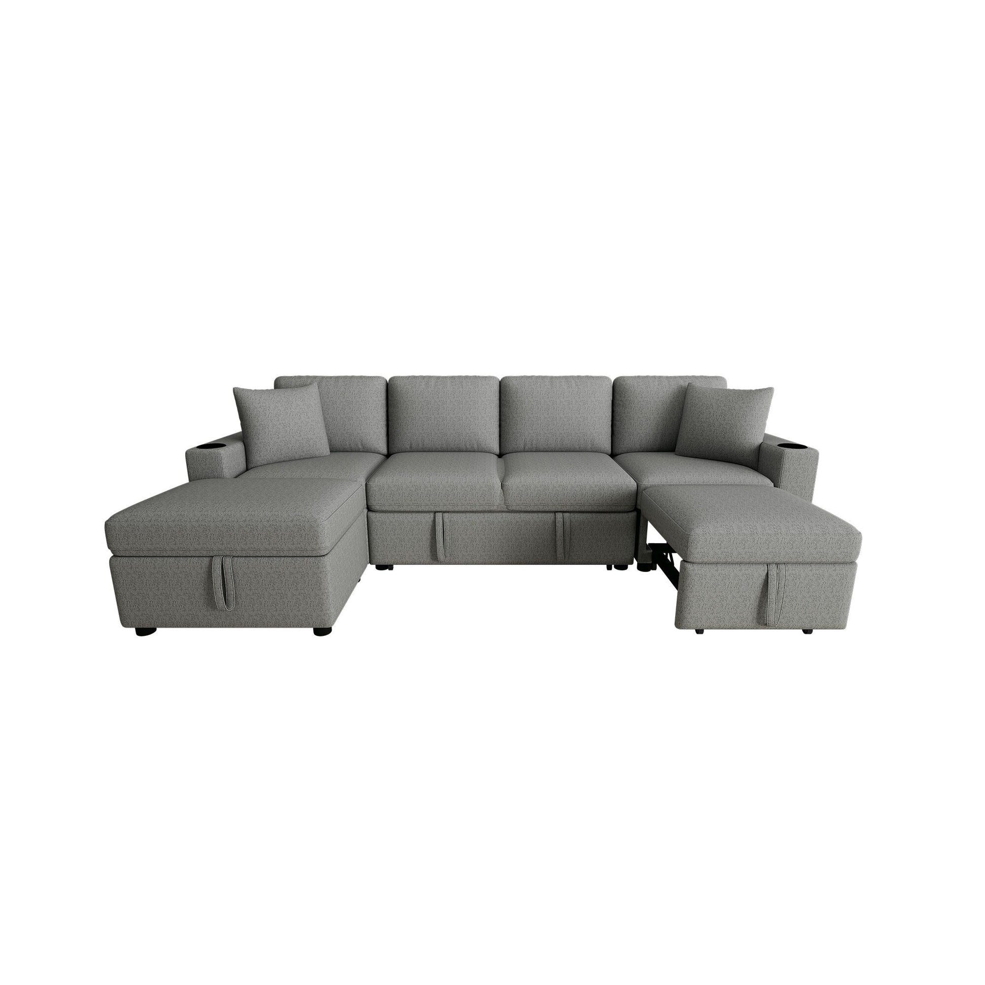 • This modular pull-out sofa combines flexible seating, a convertible sleeper, and hidden storage in one streamlined design. Featuring built-in USB ports, dual cup holders, and plush chenille upholstery, it offers adaptable comfort for modern living spaces.