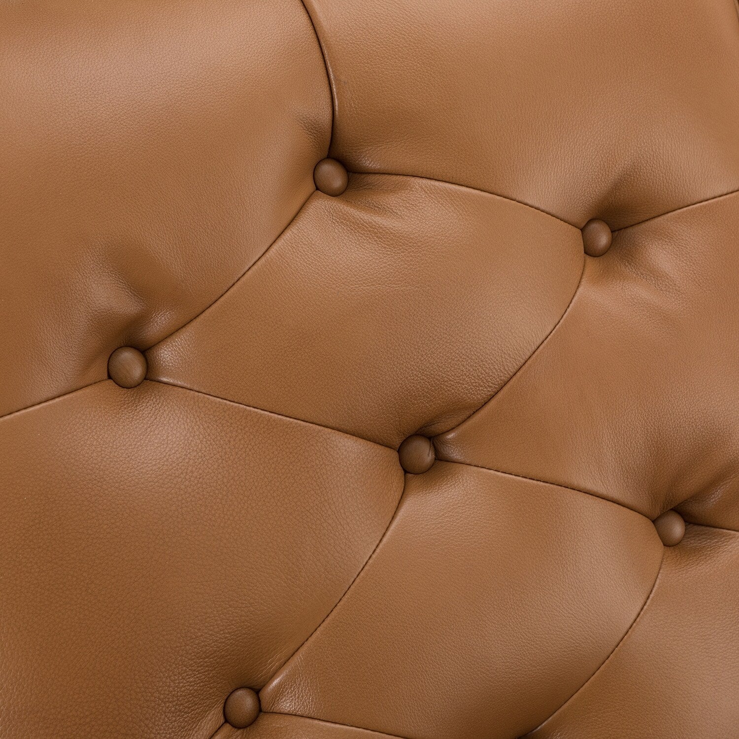 This mid-century recliner is made of exquisite genuine leather for a stylish and elegant look.The design of turned legs is exquisite and beautiful. Classic rolled armrest in curved shape design is a combination of beauty and comfort. The seat cushion is made of high-density ?rebound foam, which is soft and comfortable. The backrest is full, featured by well-proportioned deep-point buttons, making the backrest evenly stressed, supporting the back of the body well, and giving you a more comfortable experience. With the elbows putting on the armrests, the chair will recline freely when you lean backward with some strength. You will get a wonderful height for resting or sleeping. It's perfect for your living room, bedroom, or office.